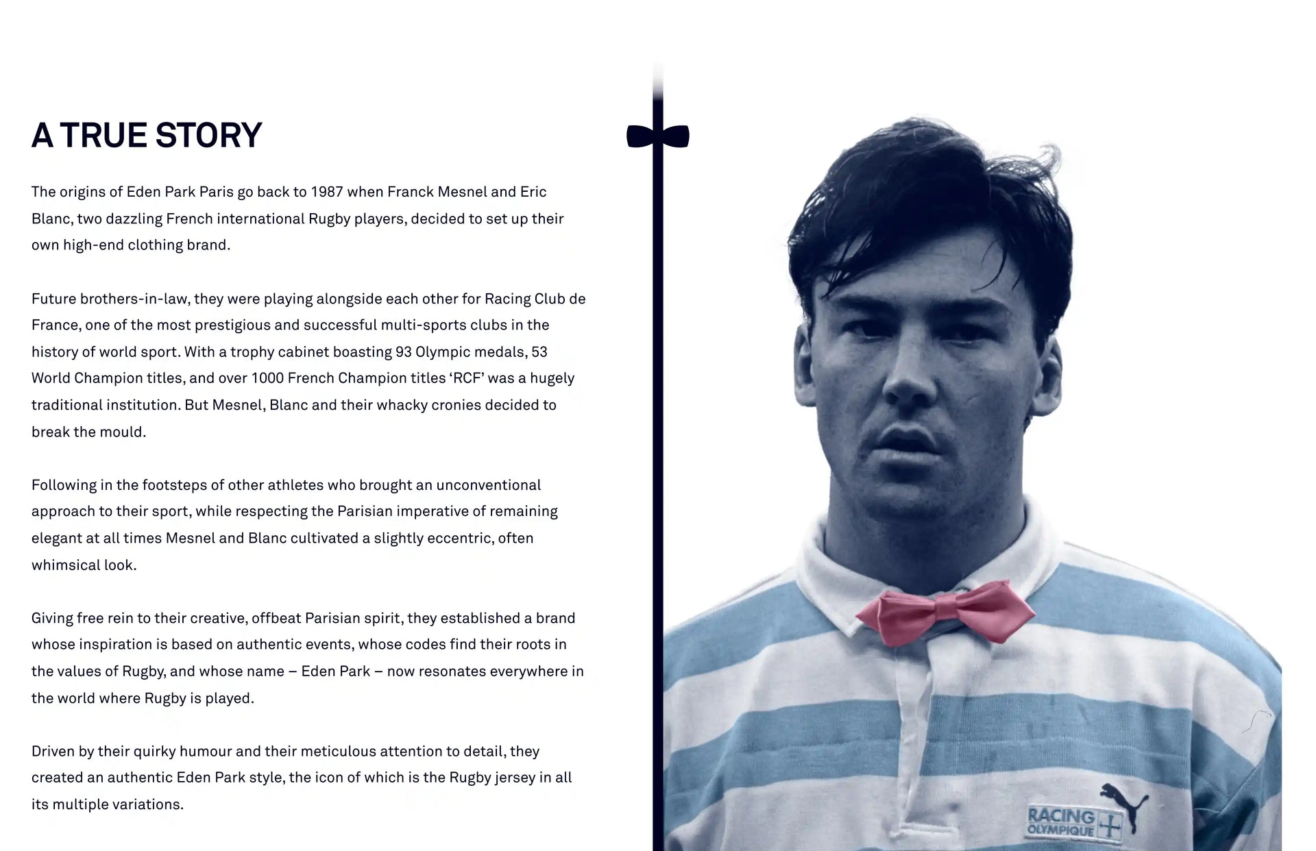 Eden Park. The name itself, as we shall see, is synonymous with the game of Rugby. But over the past 37 years, the brand of clothing, and its iconic Pink Bow Tie logo have also become synonymous with a certain style. Stylish but never stuffy, chic but always comfortable, respectful of tradition, but always pushing the boundaries of innovation. In France it’s known as the Eden Park look, an uncompromising search for elegance and meticulous attention to detail. Combined with high-quality ethically sourced fabrics, the brand boasts a unique fusion of contemporary Parisian chic with Eden Park’s own authentic, and unmistakable, identity.