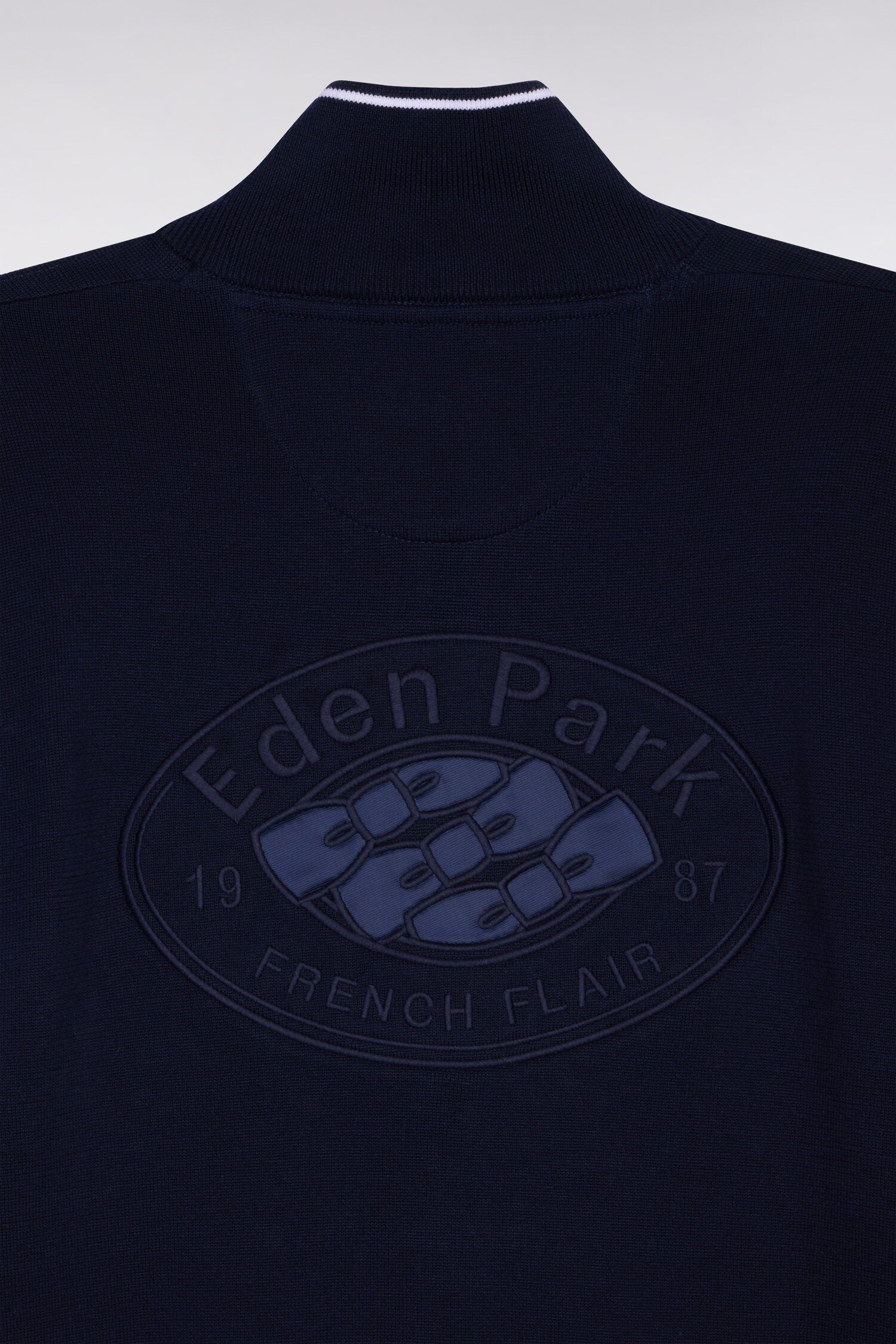 Ce pull col zippé tricoté en 100% en coton allie esprit spot chic et confort. L’association subtile de point jersey envers et de point jersey crée un effet texturé unique renforcé par la présence de bords-côtes rehaussés d'une rayure blanche. Doté d’un col camionneur, ce pull marine se distingue par ses manches contrastés dans les deux coloris signature de notre Maison française et sa large broderie dos inspirée de l'héritage French Flair d'Eden Park.