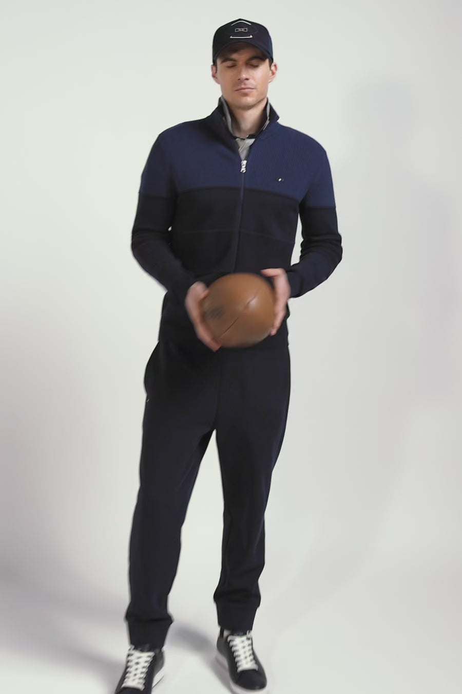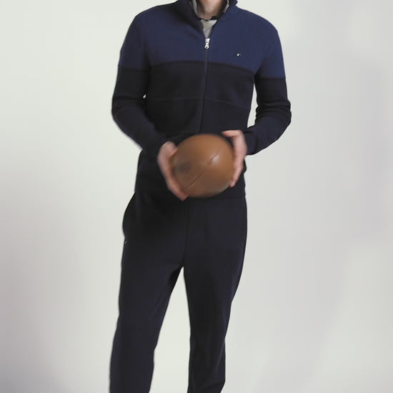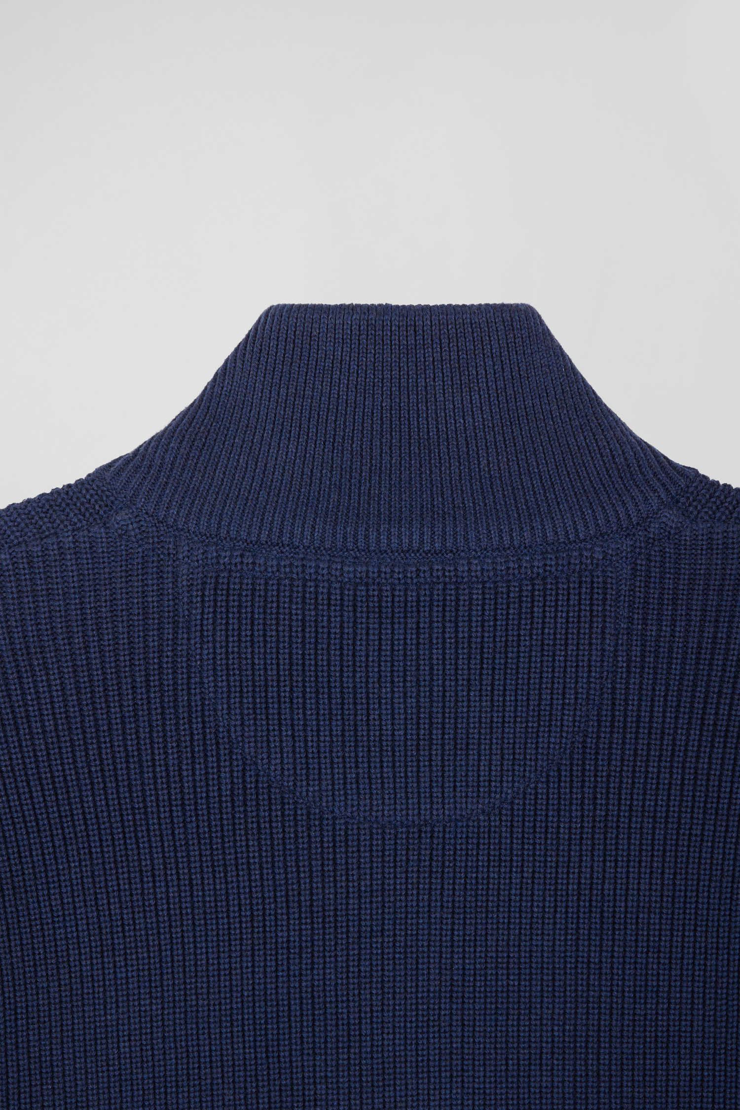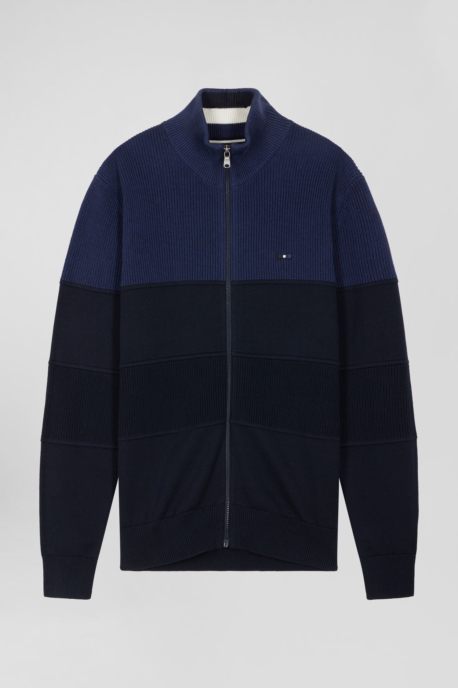 Regular navy blue and blue cotton high collar zipped cardigan