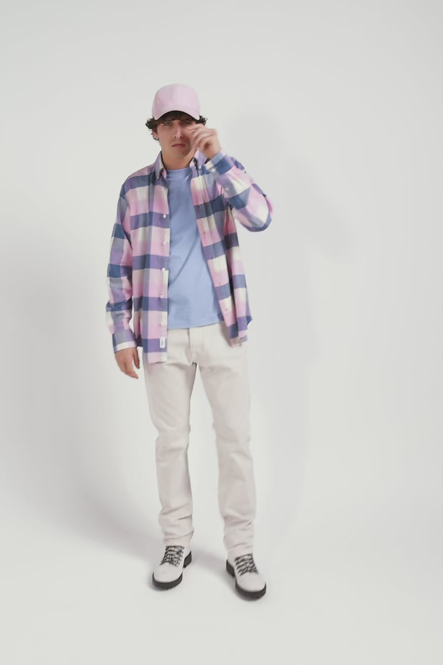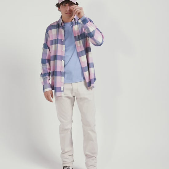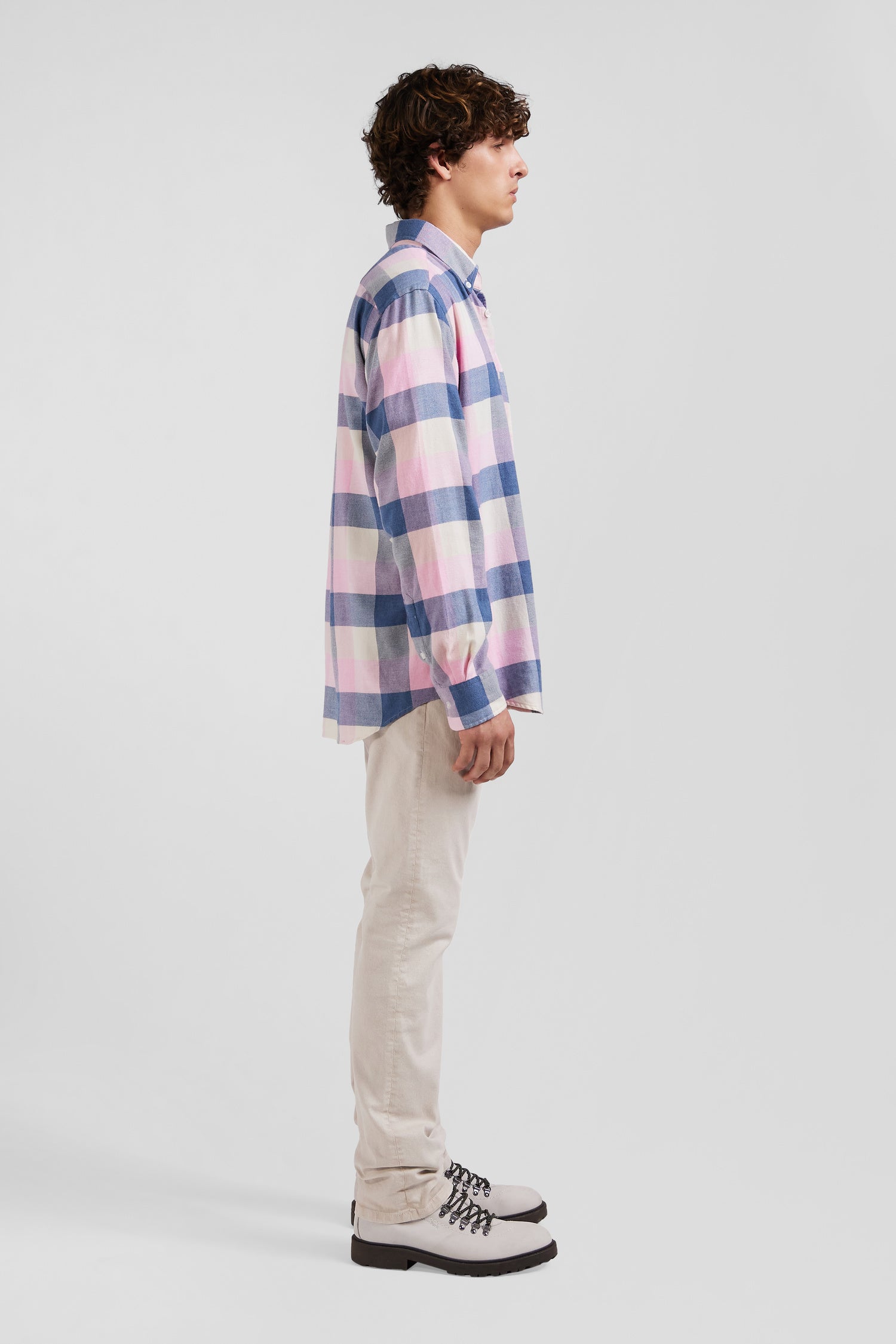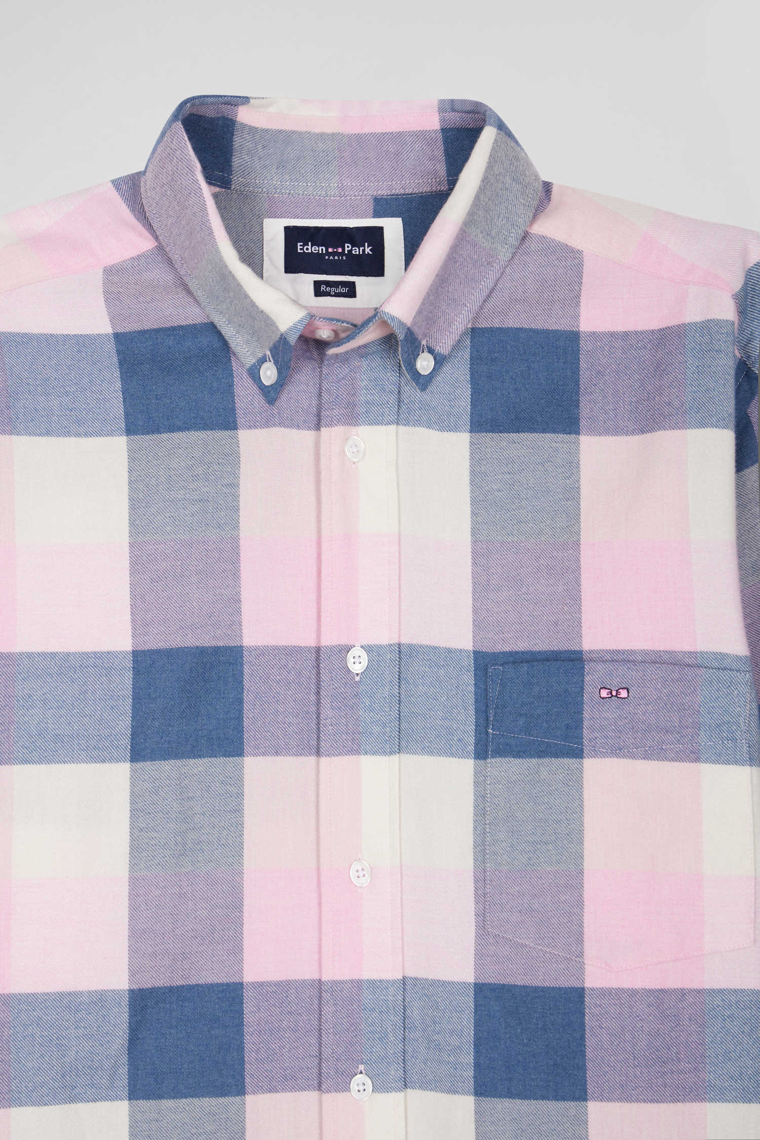 In gray or pink, discover the casual charm of our soft cotton plaid shirt, a fall-winter wardrobe essential. With its straight cut and button-down collar, this men's shirt with patch pocket offers comfort and elegance. The embroidered pink bow tie on the chest adds a distinctive touch, perfect for a trendy, casual overshirt.