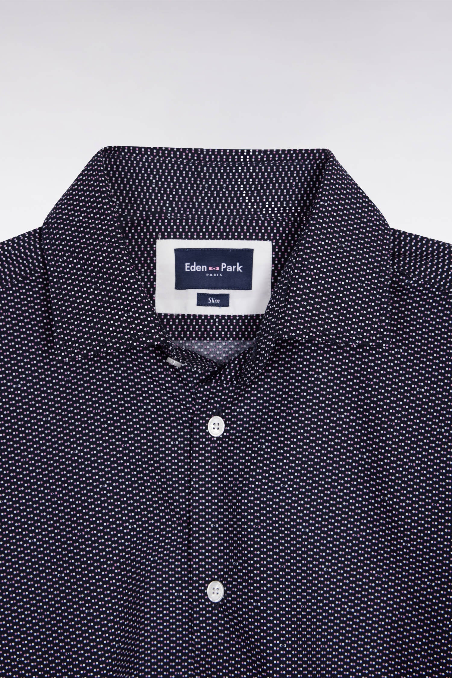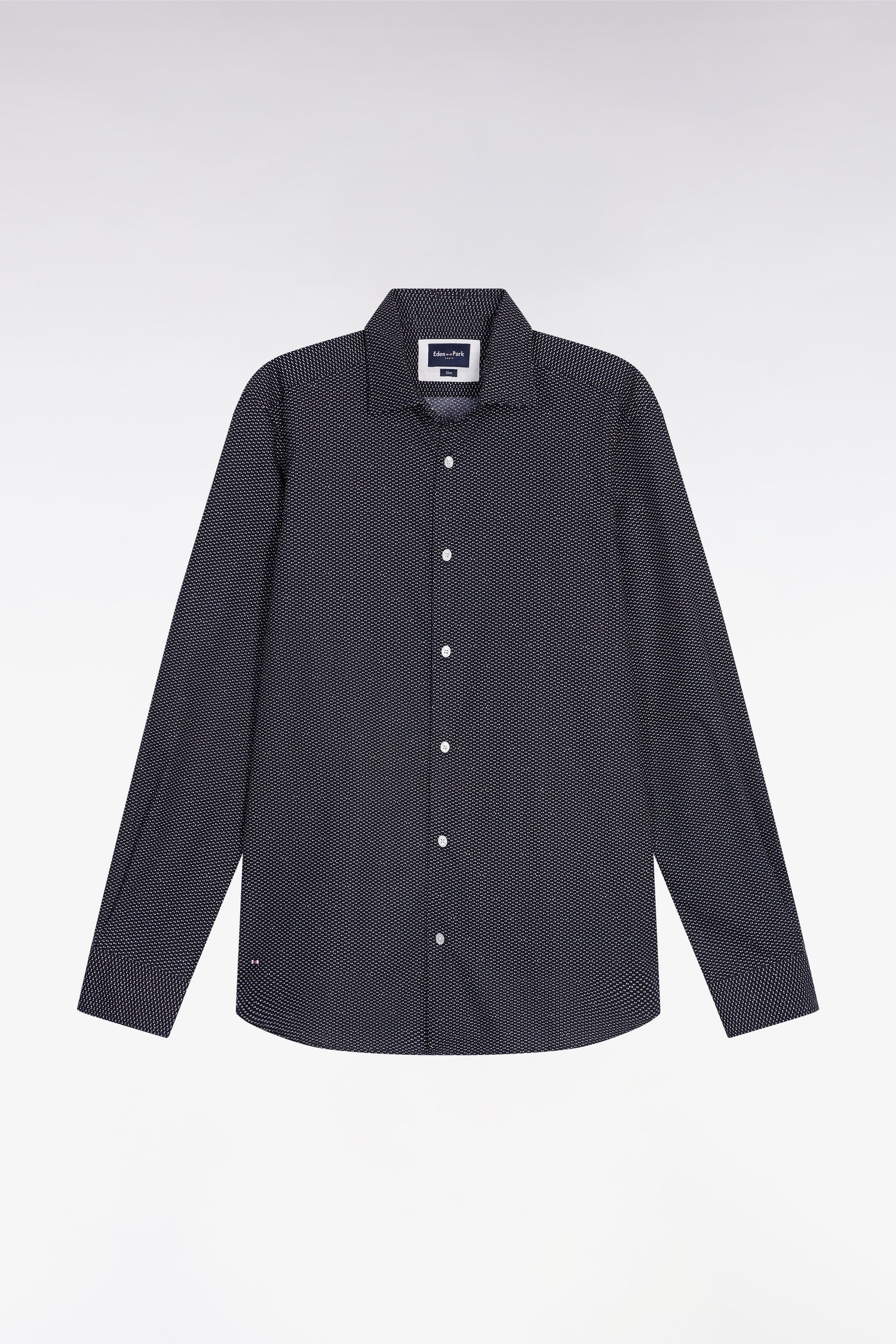 With its discreet pink or blue micro pea print on a navy background, this slim-fitting shirt has a modern look while respecting the codes of Eden Park elegance. Made from soft, breathable cotton poplin, it features no chest pocket and bow-tie embroidery at the bottom, a minimalist nod to the house's French Flair universe.