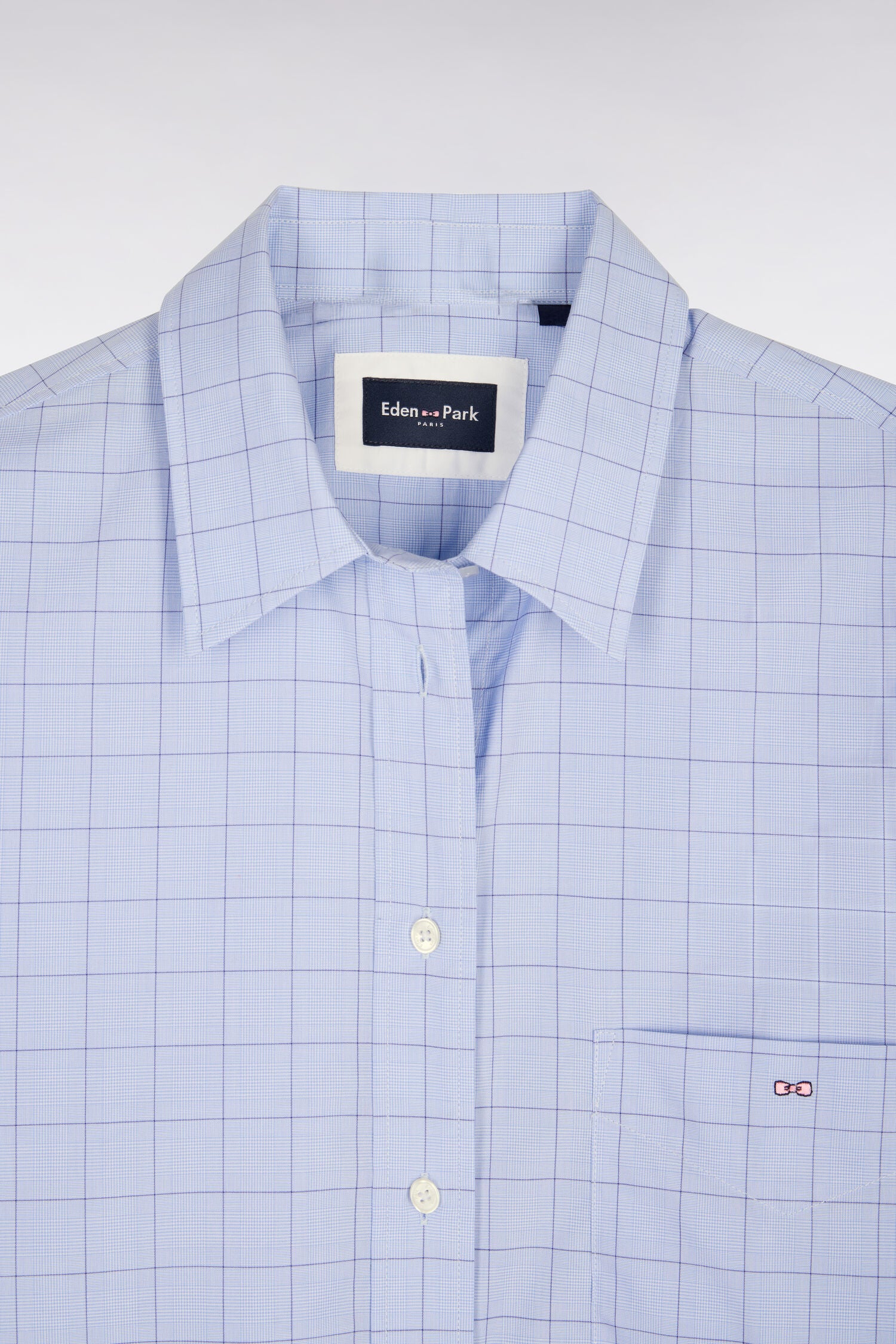 La douceur de la popeline de coton s'associe à une coupe oversized moderne pour cette chemise femme bleu ciel. Pour une touche graphique réinterprétant les pièces phares d'un vestiaire elle se dote de carreaux prince de Galles et d'une poche plaquée. Jean ou pantalon d'inspiration tailleur se marieront à la perfection à cette élégante chemise.