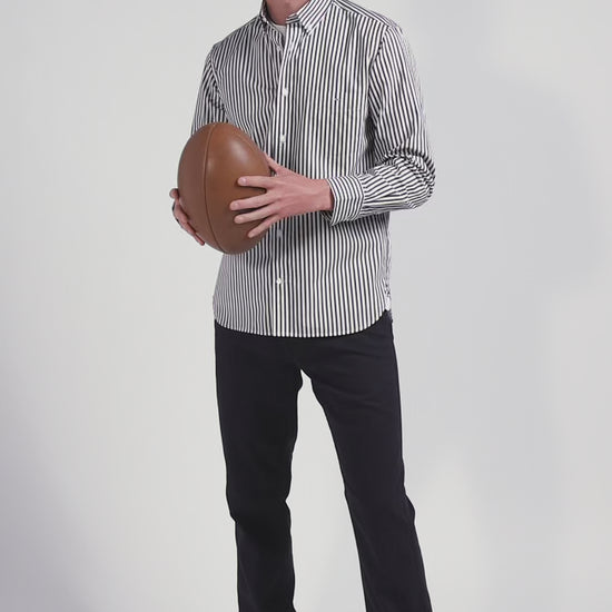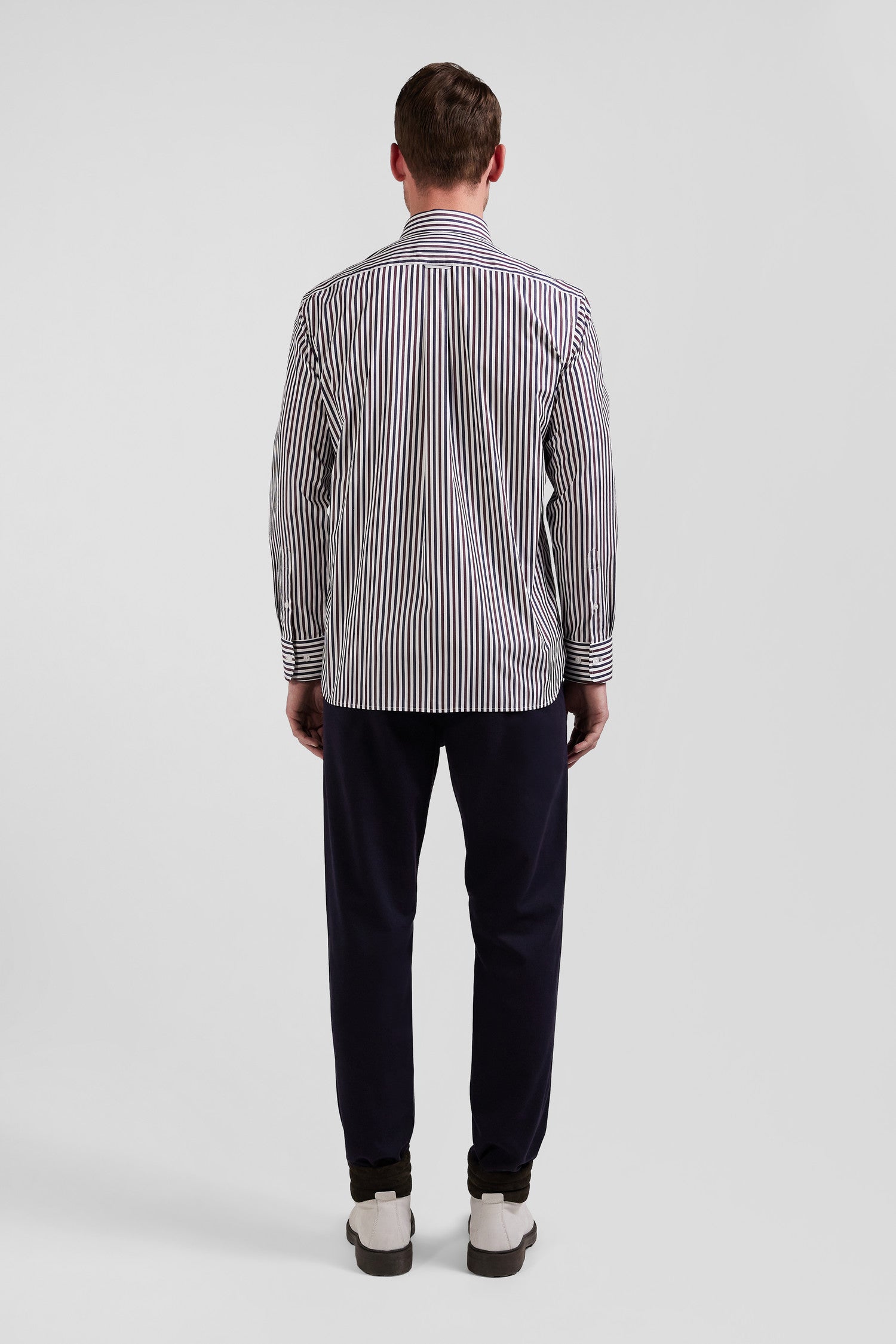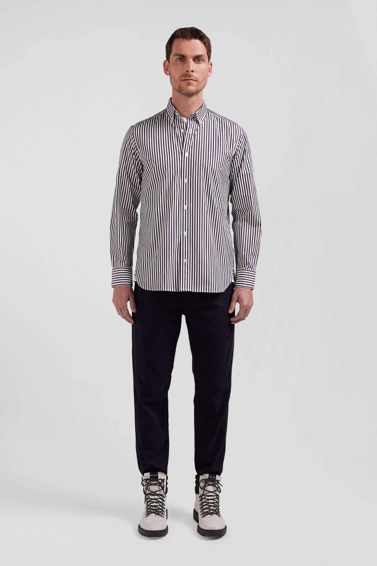 Our striped cotton poplin shirt is designed to fit any figure thanks to its regular straight cut. Its two-tone stick stripes will add a dynamic touch to your outfit. The buttoned point collar provides impeccable support, while the back pleat gives you extra ease of movement. The bowtie embroidery on the chest pocket adds a subtle touch of elegance to this men's shirt. This modern take on a classic comes in a wide range of colors for the season, and pairs equally well with our chino pants or straight jeans.