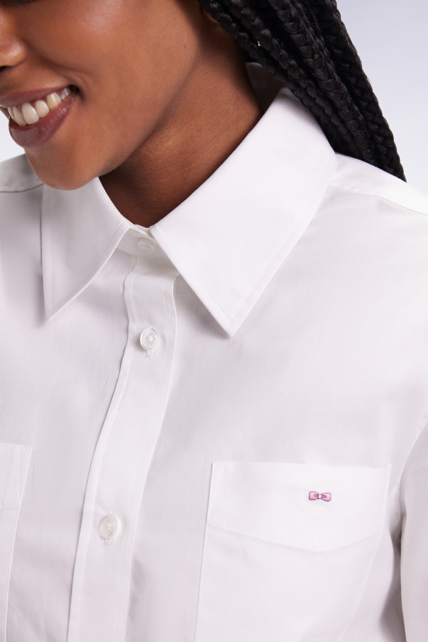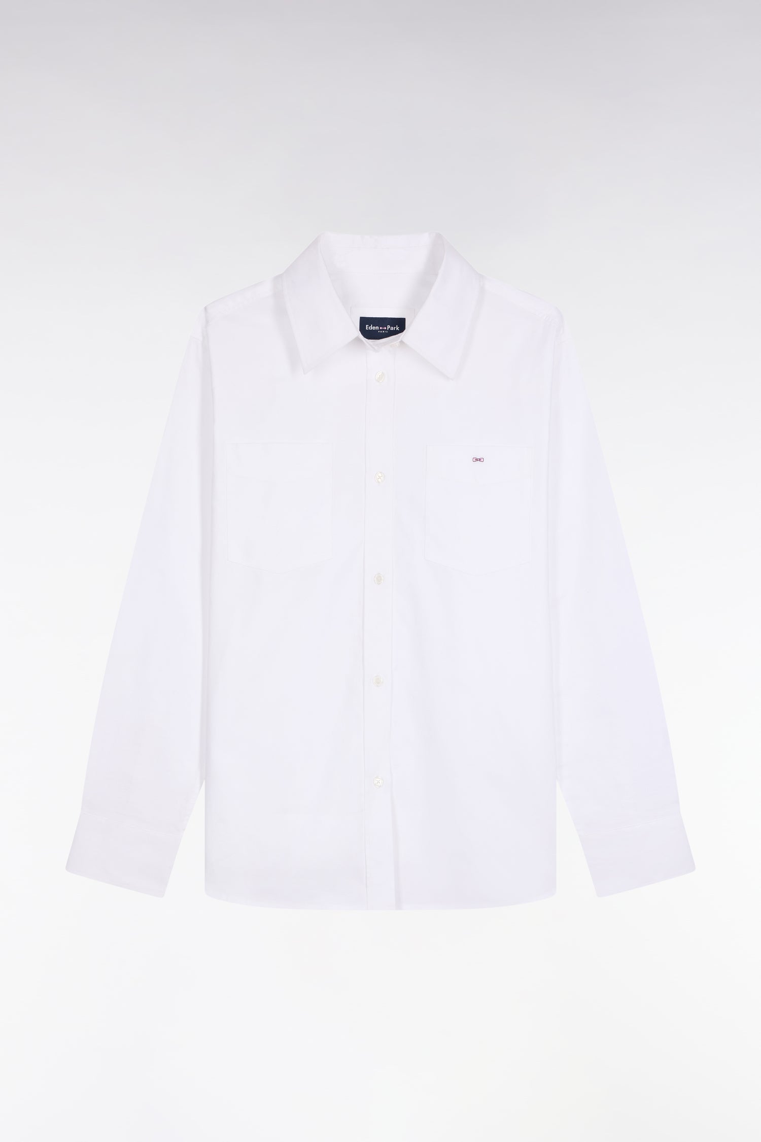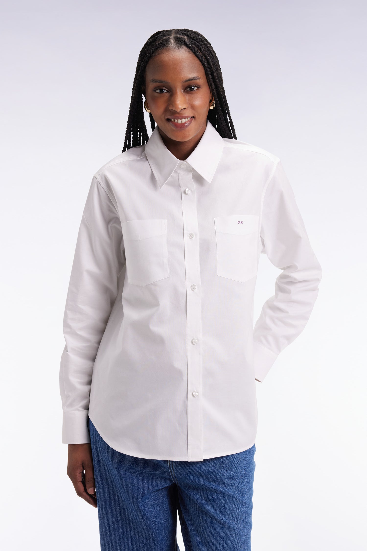 A relaxed interpretation of a classic dress shirt, this white cotton shirt features a relaxed fit and loose lines. Two patch pockets reinforce its casual chic spirit. A timeless, versatile model that can be worn open or tucked into wide-leg pants for a slightly boyish look.