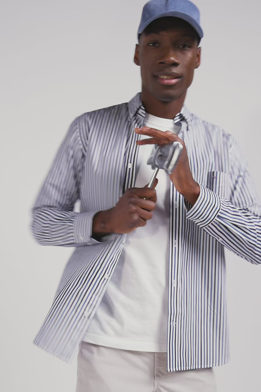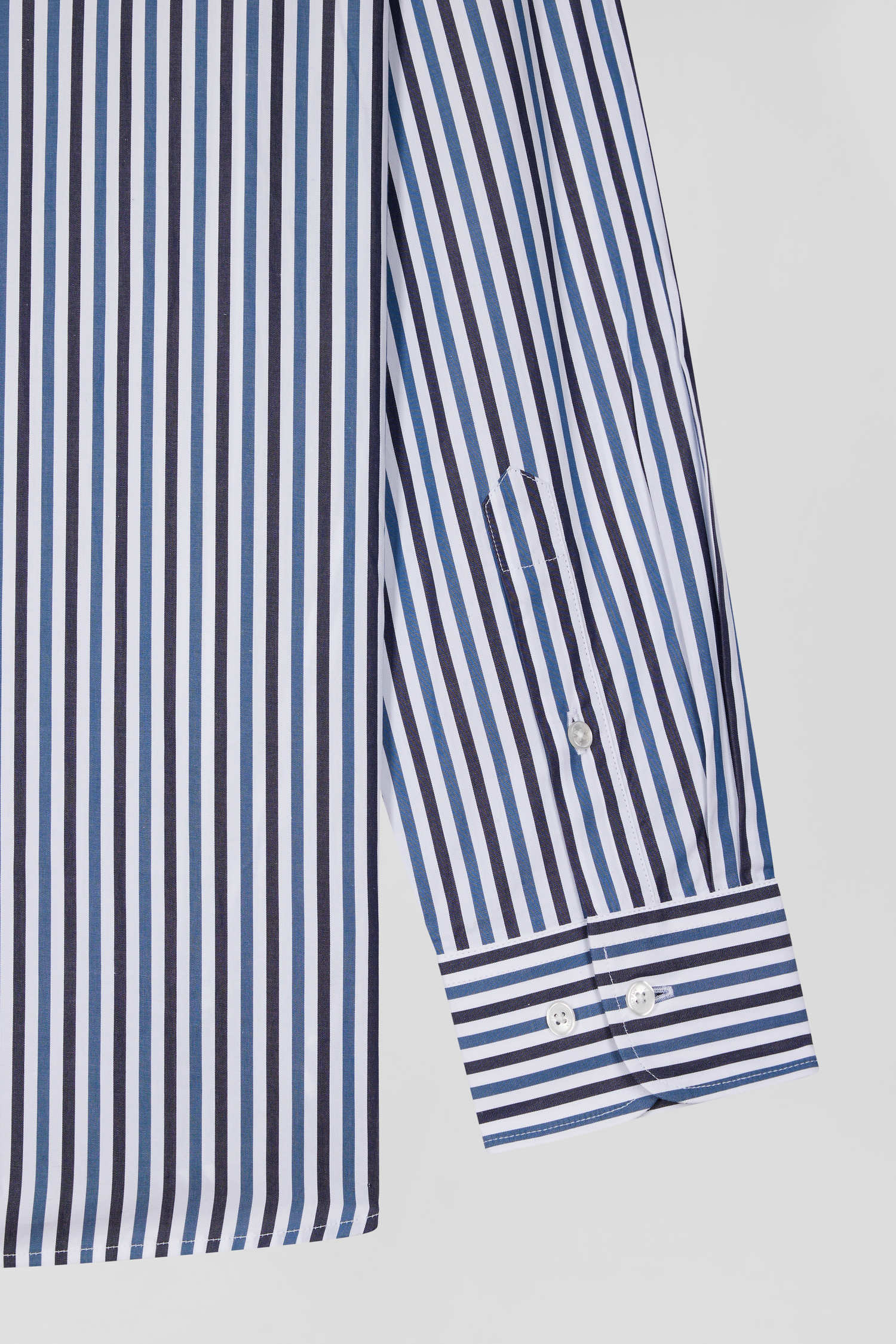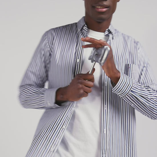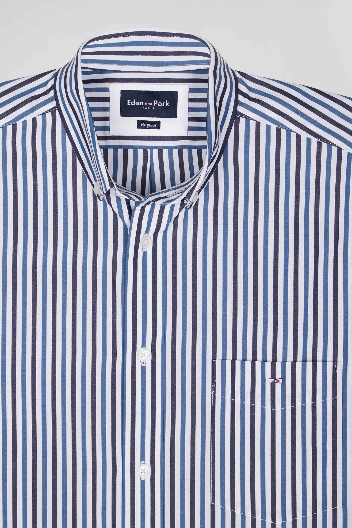 Our striped cotton poplin shirt is designed to fit every figure thanks to its regular straight cut. Its two-tone stick stripes will add a dynamic touch to your outfit. The buttoned point collar provides impeccable support, while the back pleat gives you extra ease of movement. The bowtie embroidery on the chest pocket adds a subtle touch of elegance to this men's shirt. This modern take on a classic comes in a wide range of colors for the season, and pairs equally well with our chino pants or straight jeans.