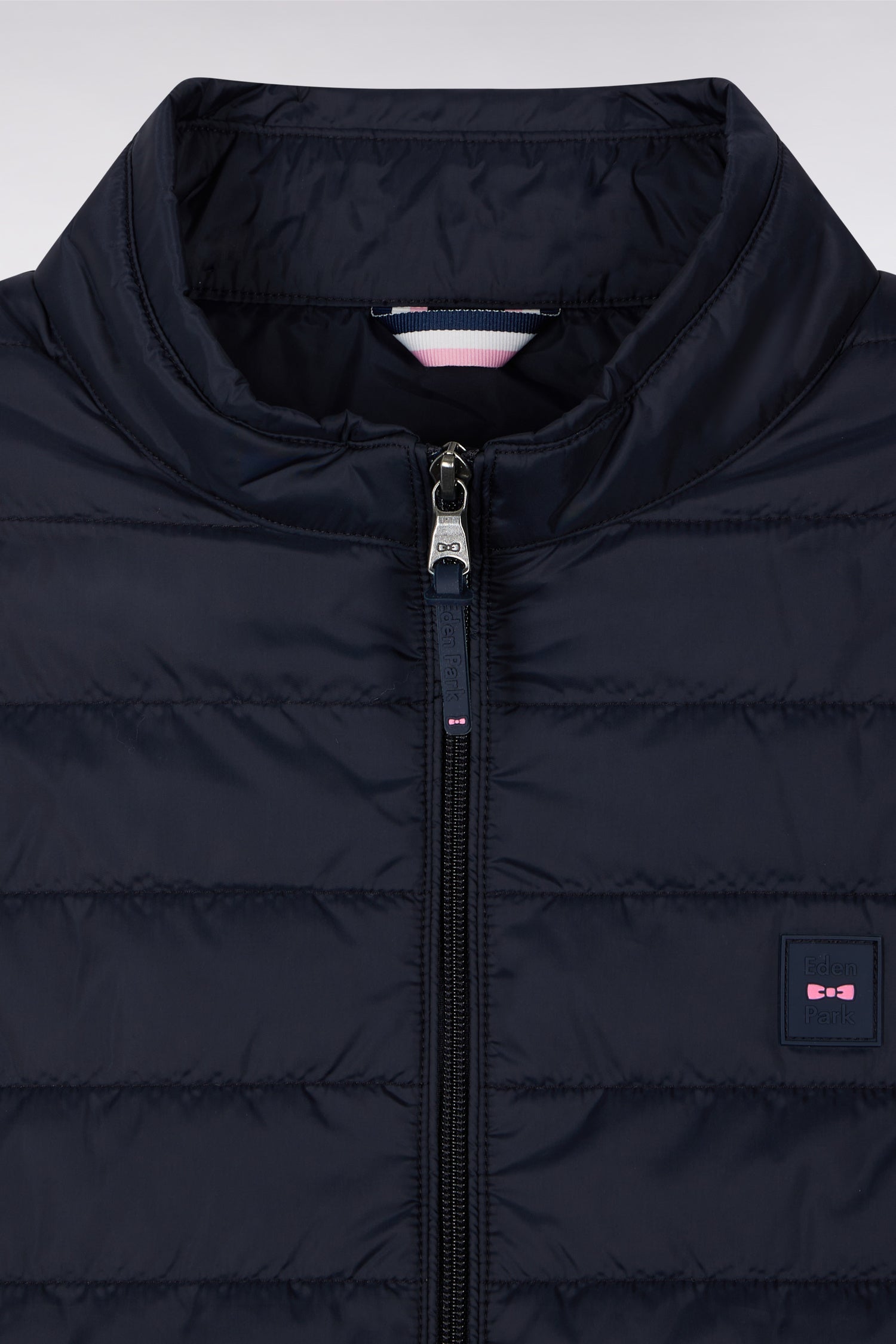 This sleeveless, water-repellent puffa features 2 piped front pockets, 2 interior pockets with Velcro and zip fastening. The filling is made entirely out of polyester fibres derived from recycled plastic bottles