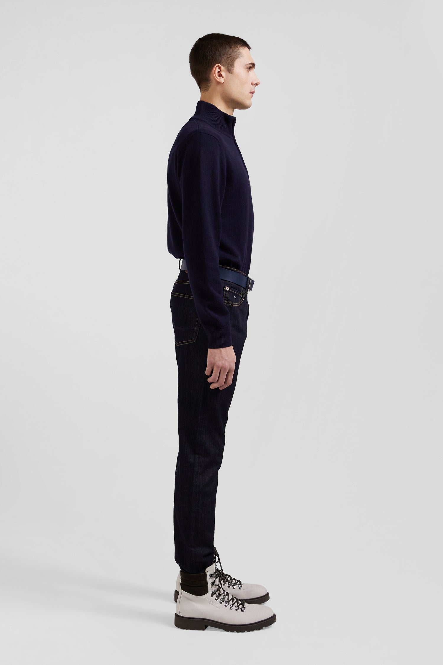 Regular navy blue semi-zipped wool and cotton jumper