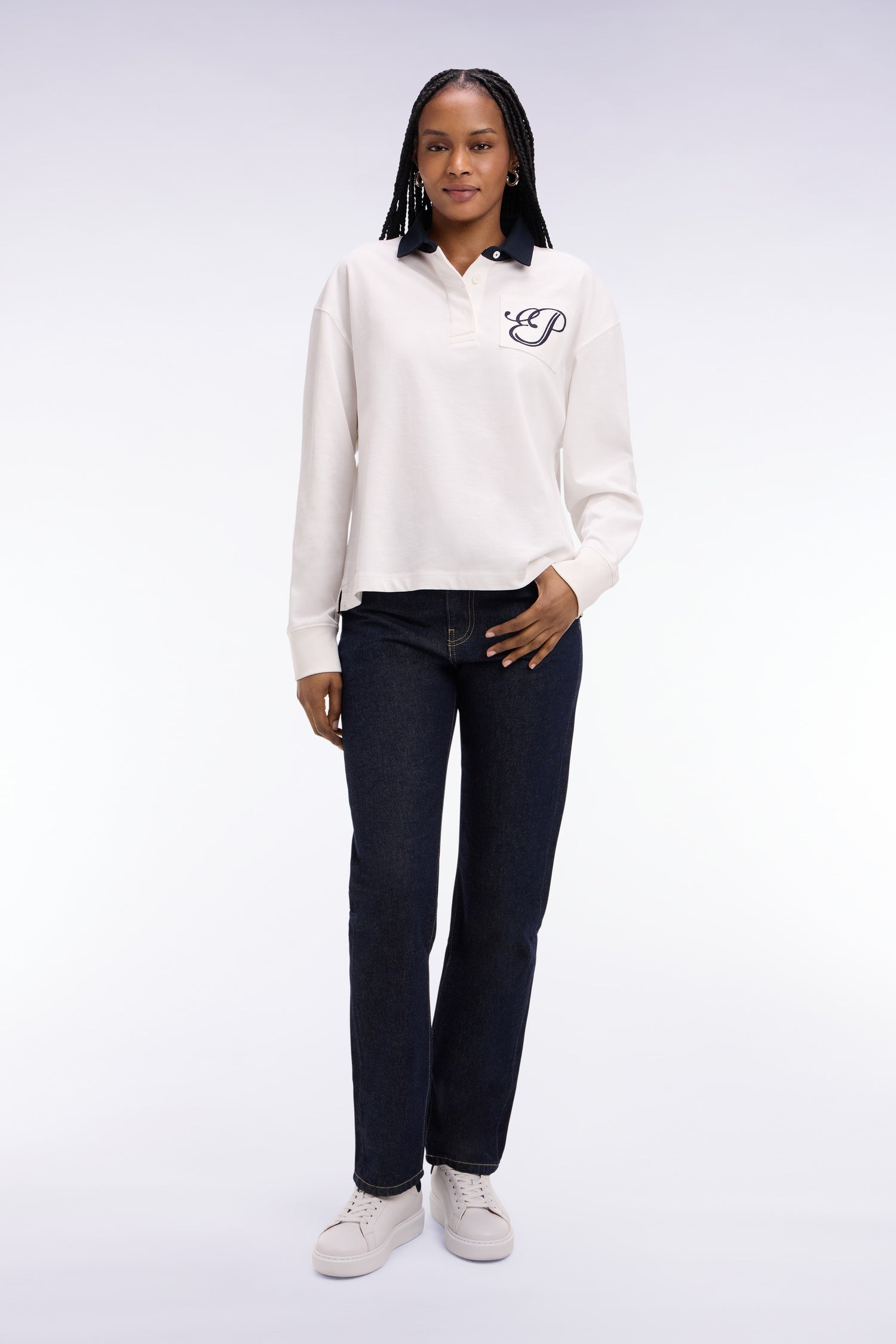 Ce jean femme coupé dans une taille regular en denim brut est un intemporel seyant. Sa coupe droite mid-rise assure un tombé net et confortable au quotidien. On retrouve les signatures sport-chic de notre Maison de mode française : ruban ottoman tricolore au dos, Jacron en cuir embossé Eden Park et bouton siglé. Un modèle durable et polyvalent pour enrichir votre vestiaire.