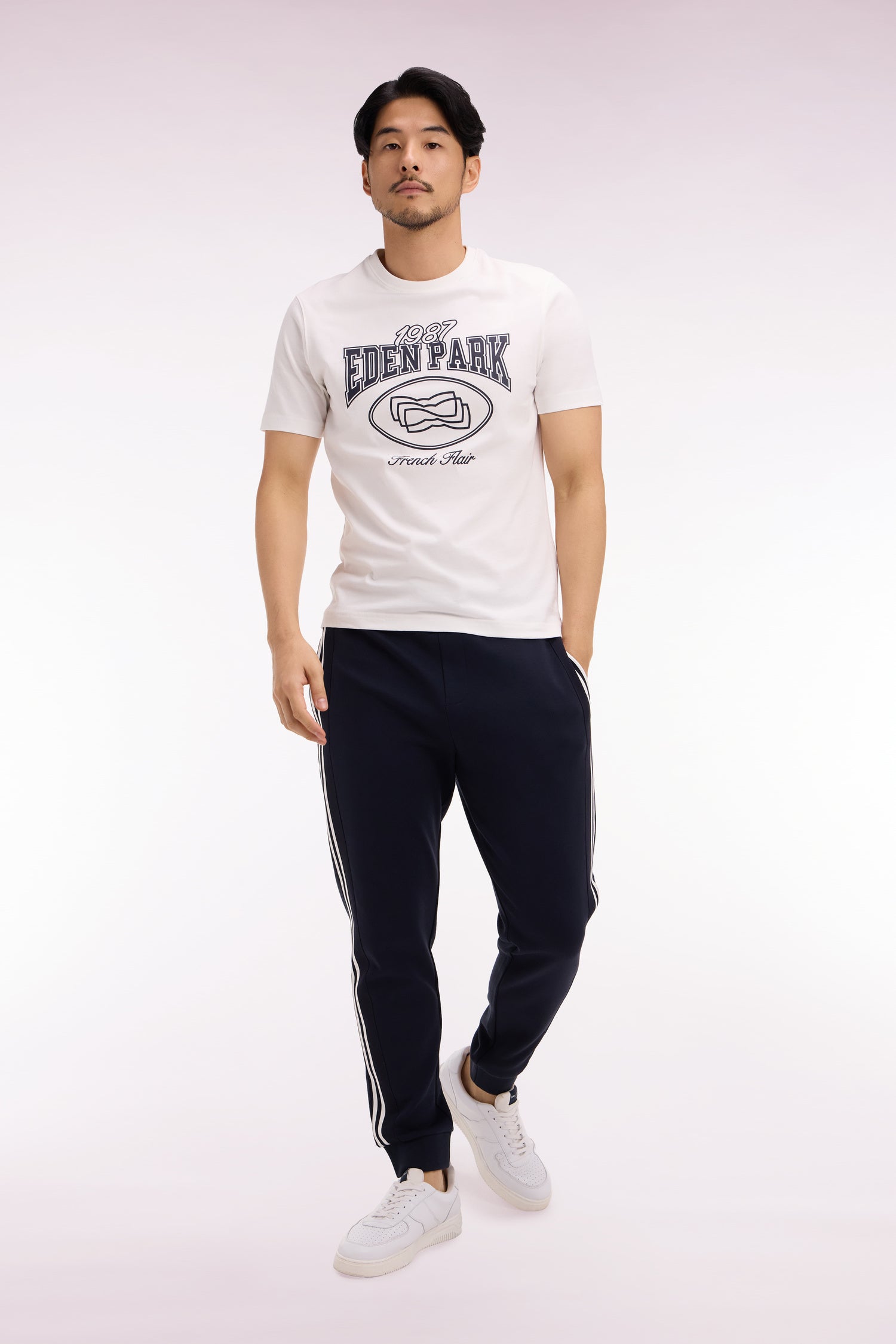 Notre jogging homme en molleton marine est rehaussé de découpes contrastées le long de la jambe. Sa coupe droite, sa taille élastique avec cordons de resserrage siglés, et son badge gomme en font une pièce sportive parfaite pour une tenue de détente travaillé, porté seul ou avec un sweatshirt.