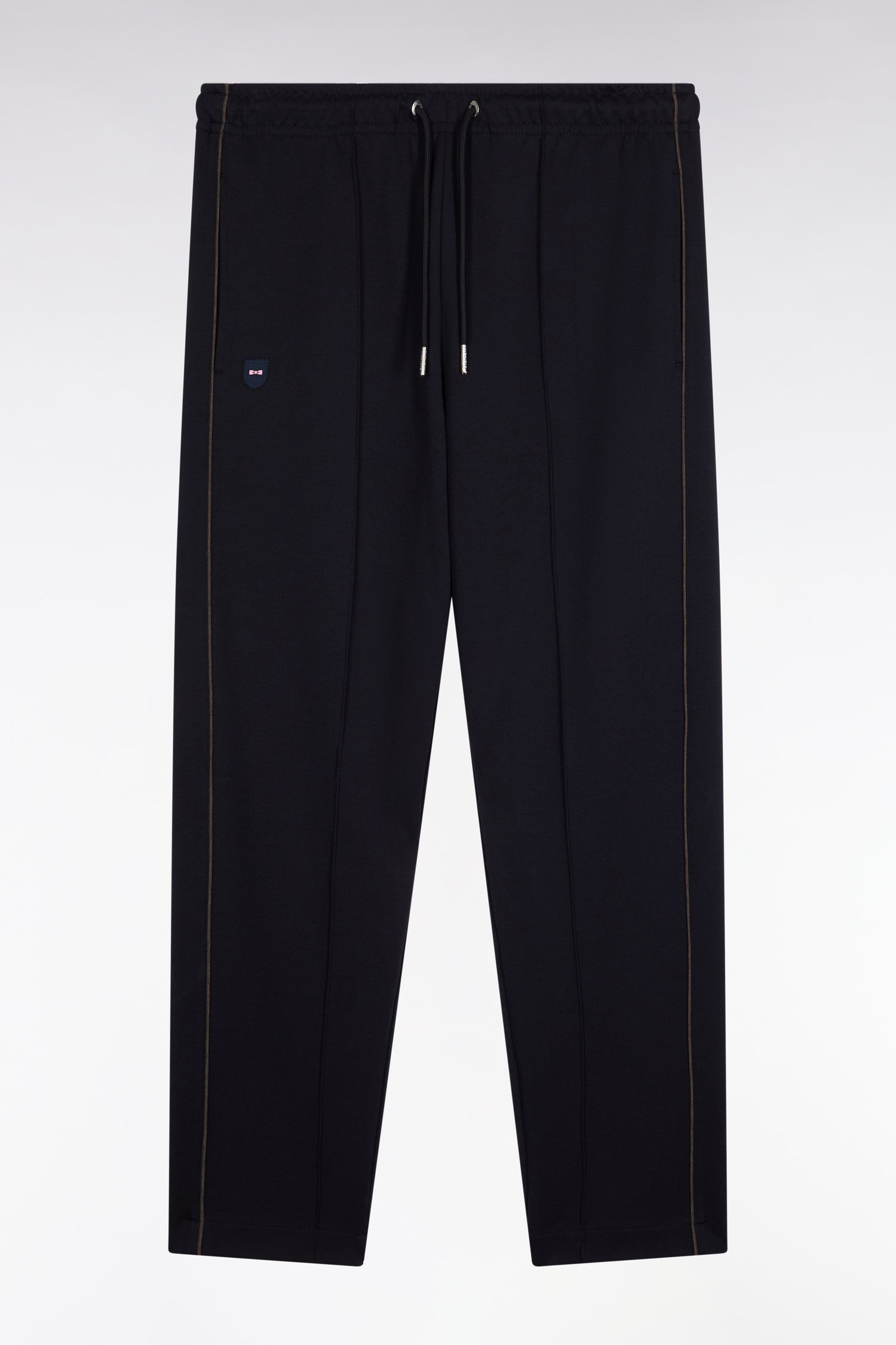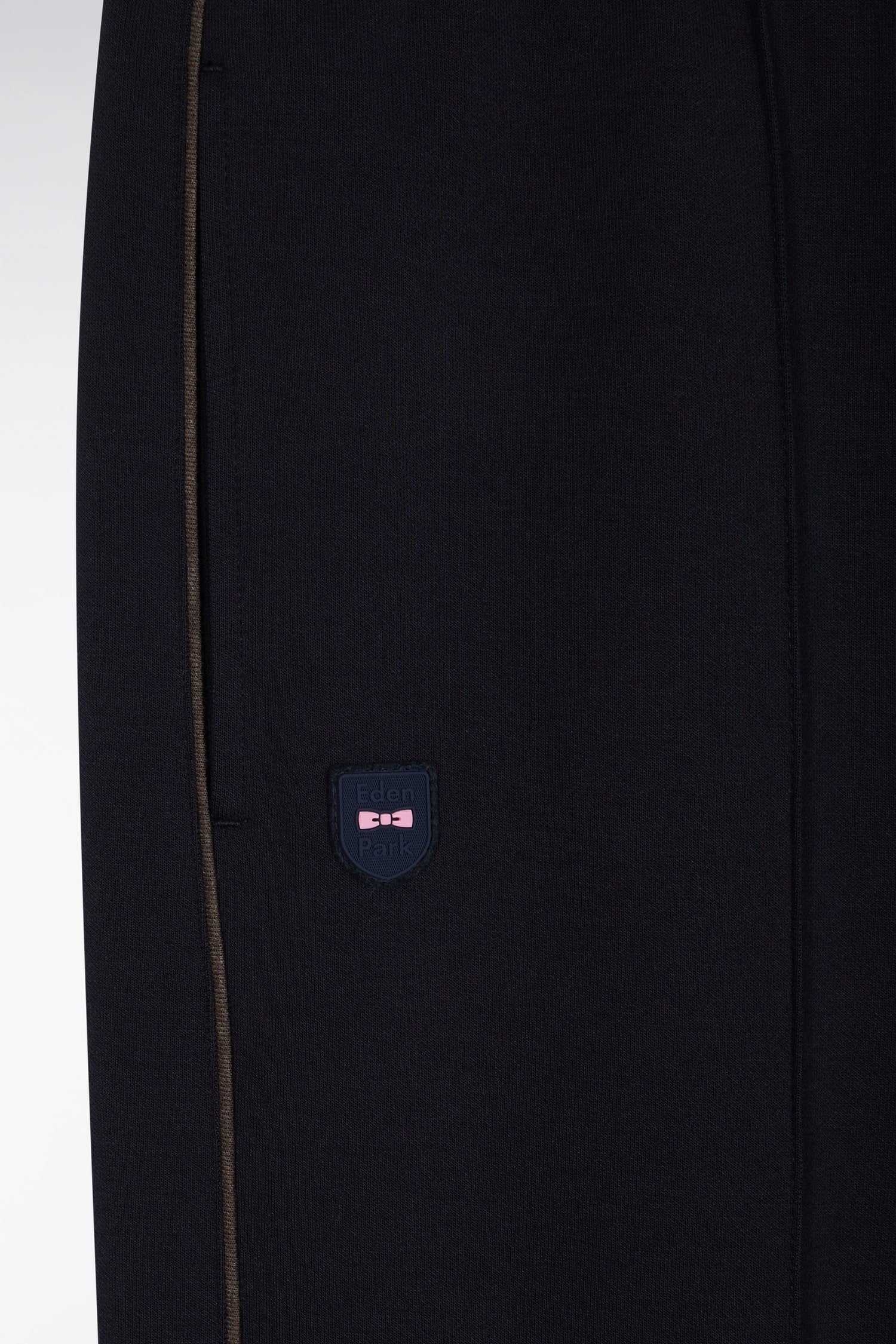 Navy brushed fleece jogging suit with piping and front pleats, straight cut