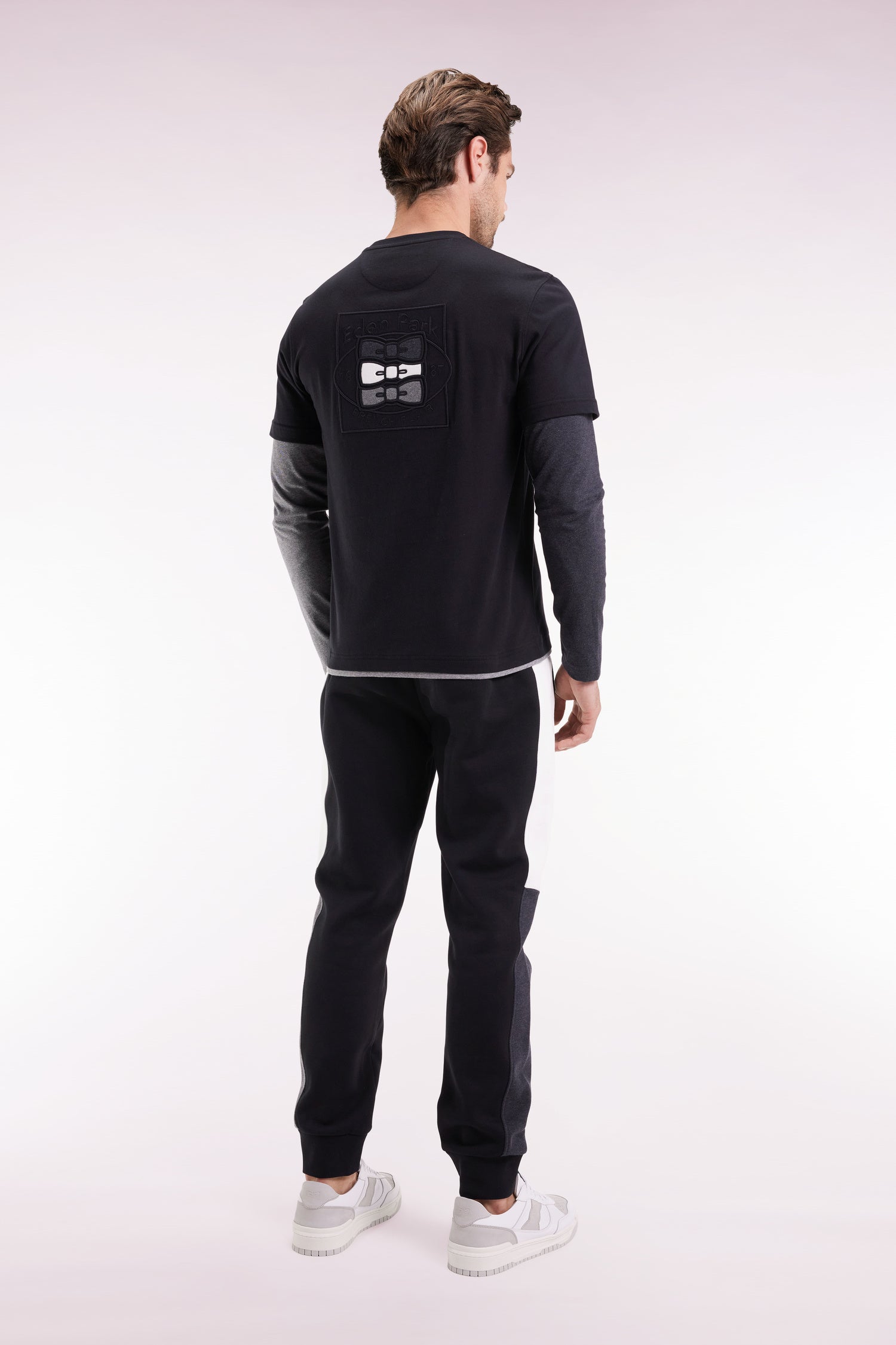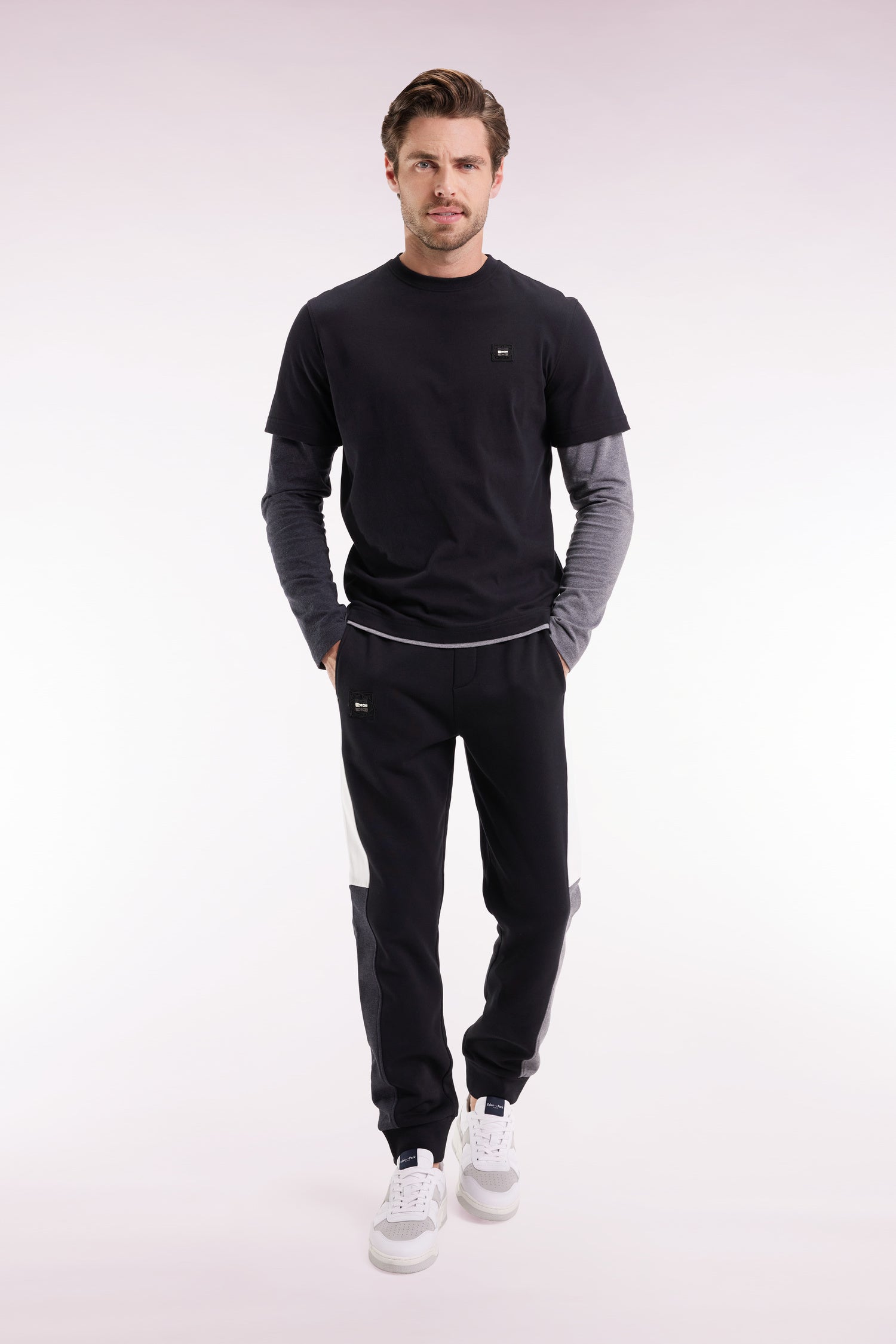 These men's cotton fleece joggers feature contrasting stripes down the legs for a graphic touch, reminiscent of Eden Park's signature colorblock combinations. Ideal for pairing with a matching sweatshirt, jersey or T-shirt for a sporty-chic silhouette. Available in black or navy, with contrasting stripes in shades of gray and ecru or pink and sky.