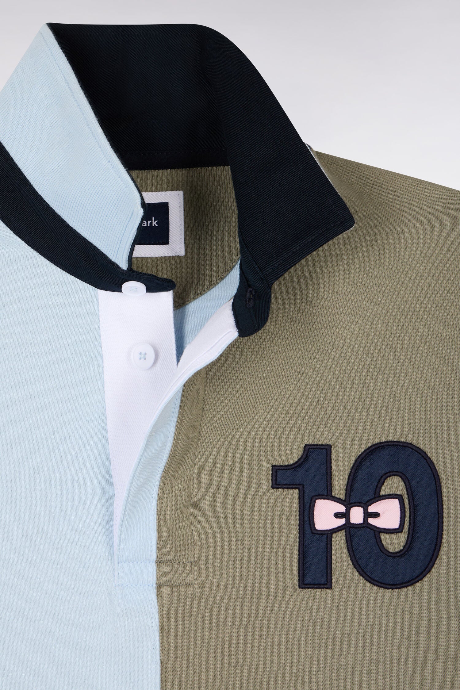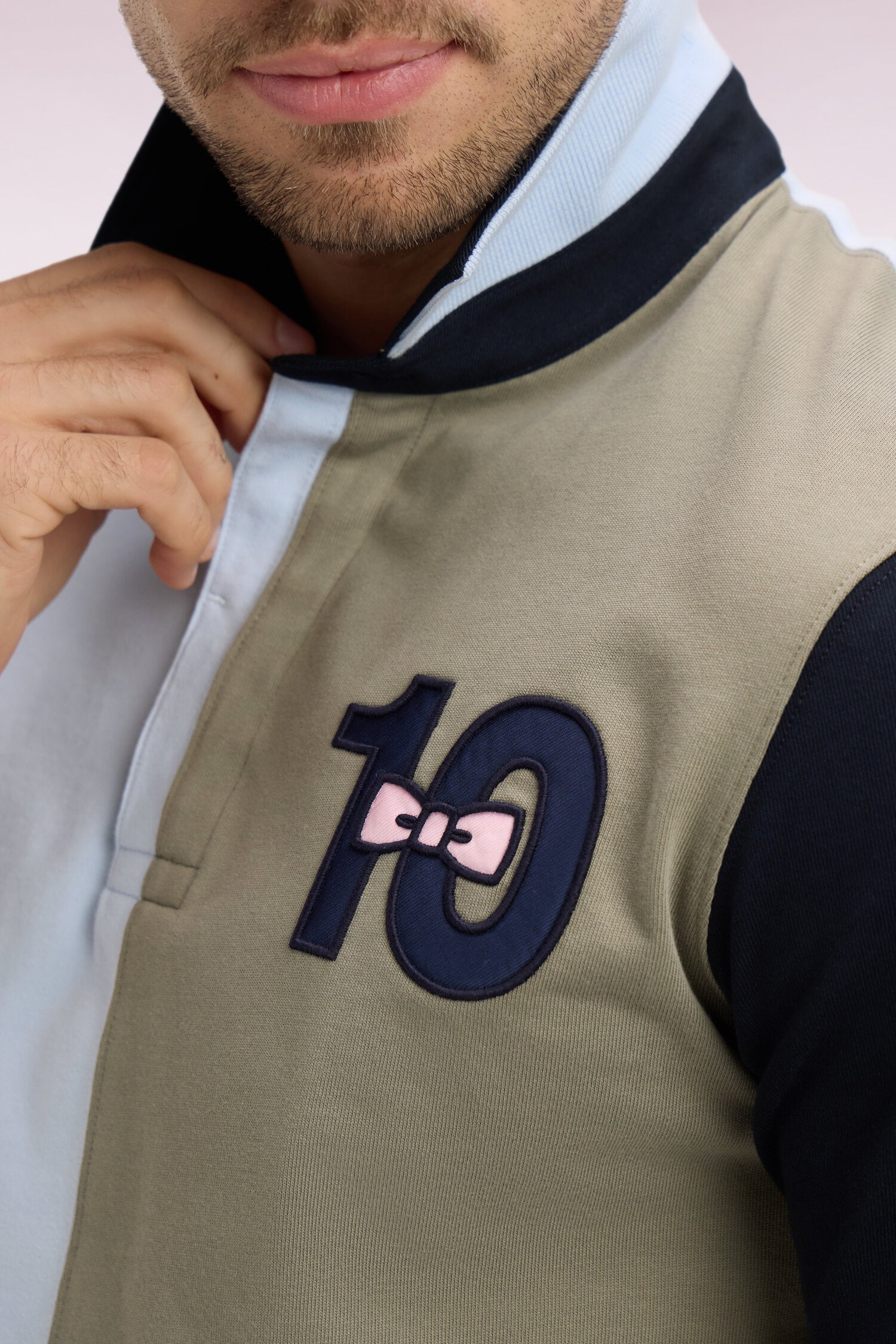 Ce maillot de rugby pensé pour la ville revisite l’héritage sportif de notre Maison avec un élégant colorblock coupé-cousue inspiré des maillots de rugby. Le col maillot structuré et les boutons personnalisés soulignent son ADN signature. Le numéro 10 brodé sur la poitrine, accompagné de notre emblématique nœud papillon rose, apporte une finition distinctive à ce modèle iconique, pensé pour une allure sport-chic dynamique.