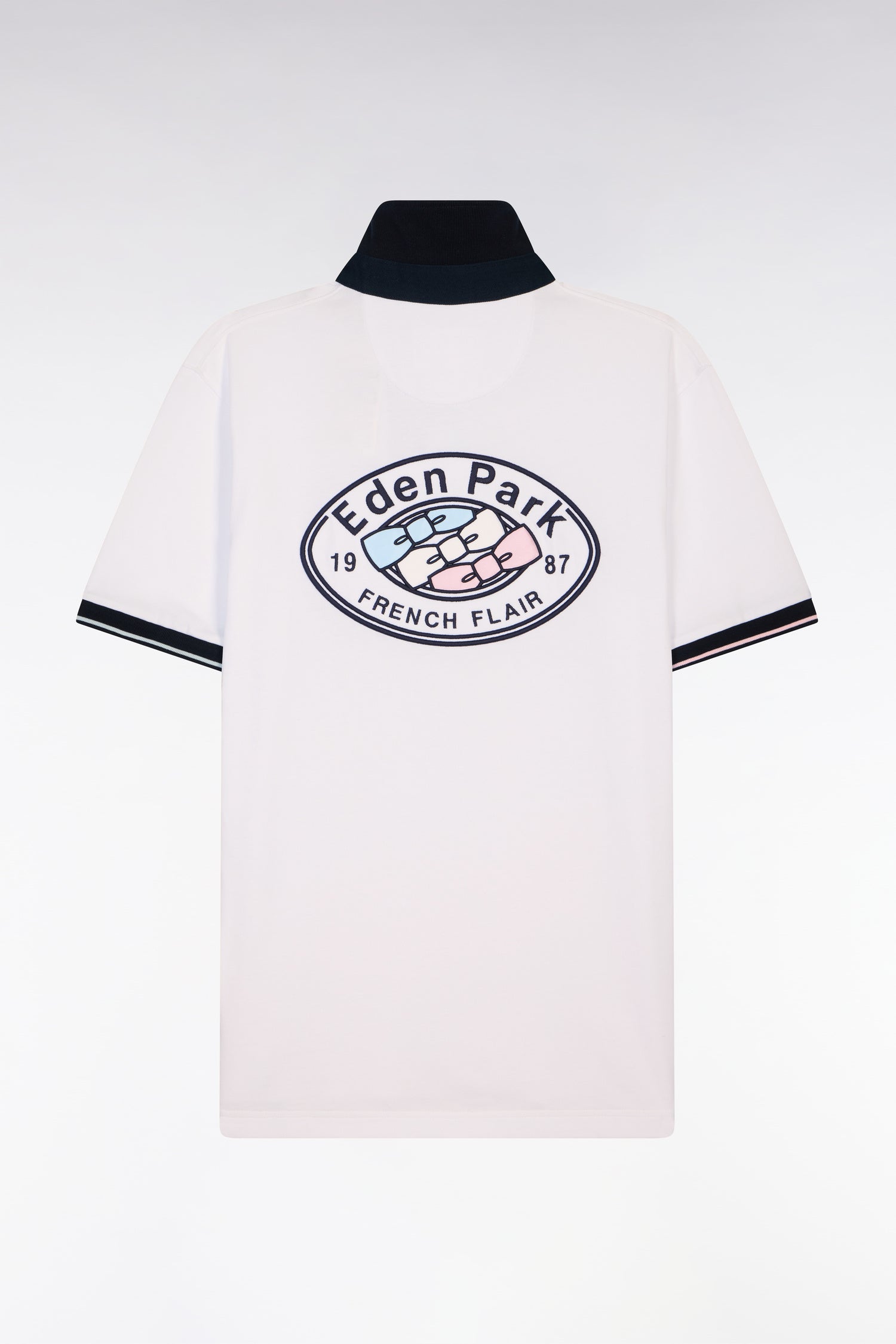 Ce maillot blanc animé de finitions marine et d'une élégante broderie dos aux nœuds papillon tricolore revisite l’esthétique des jerseys de rugby avec une lecture résolument contemporaine pensée pour le quotidien et l'après-match. Son col maillot contrasté et sa broderie dos apportent une dimension graphique assumée à ce maillot manches courtes. Une pièce décontractée mais précise, parfaite pour structurer une tenue de tous les jours.