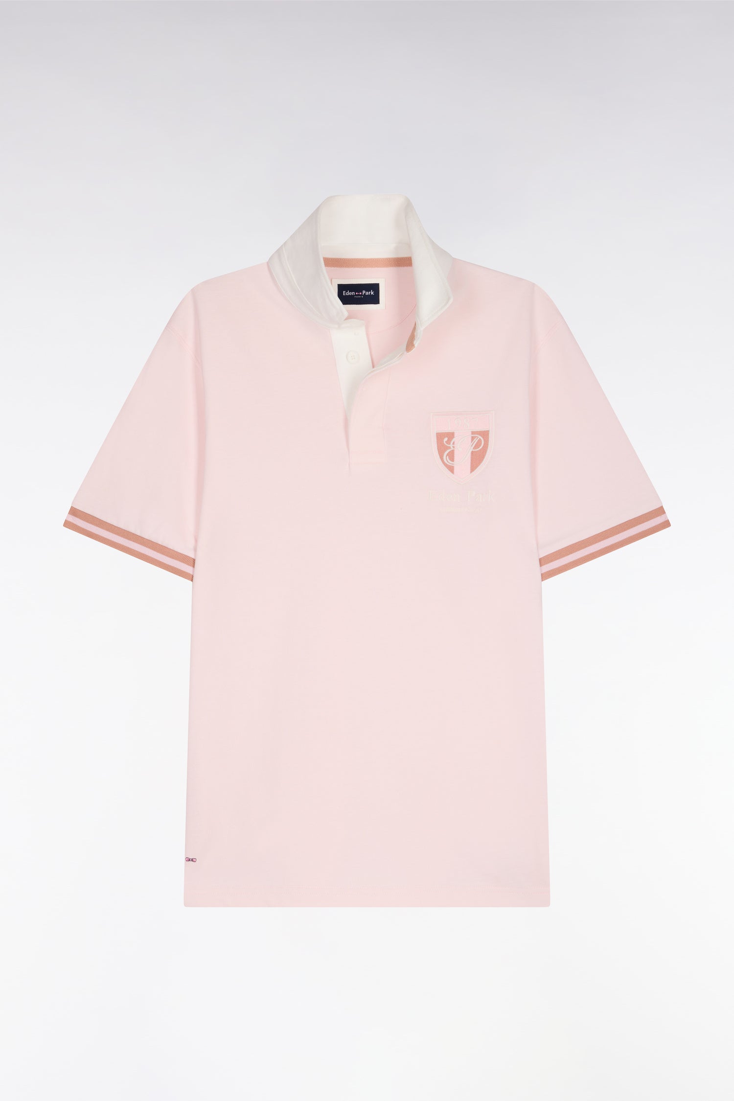 In a chic version revisited in the pastel colorama of our Héritage line, this plain jersey in sky, pink or beige cotton jersey highlights an embroidery Eden Park refined with vintage accents, mentioning the founding date ofEden Park. It immediately marks its membership in the sport-chic wardrobe of our French House. The structured ecru jersey collar and oval rugby buttons complete its clean silhouette. A modern essential, perfect for embodying the sporty elegance of the men's wardrobe. Wear with shorts or chinos for a more preppy look.