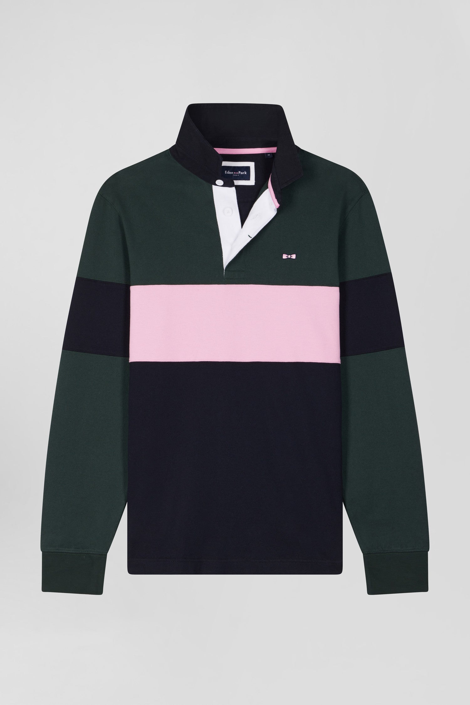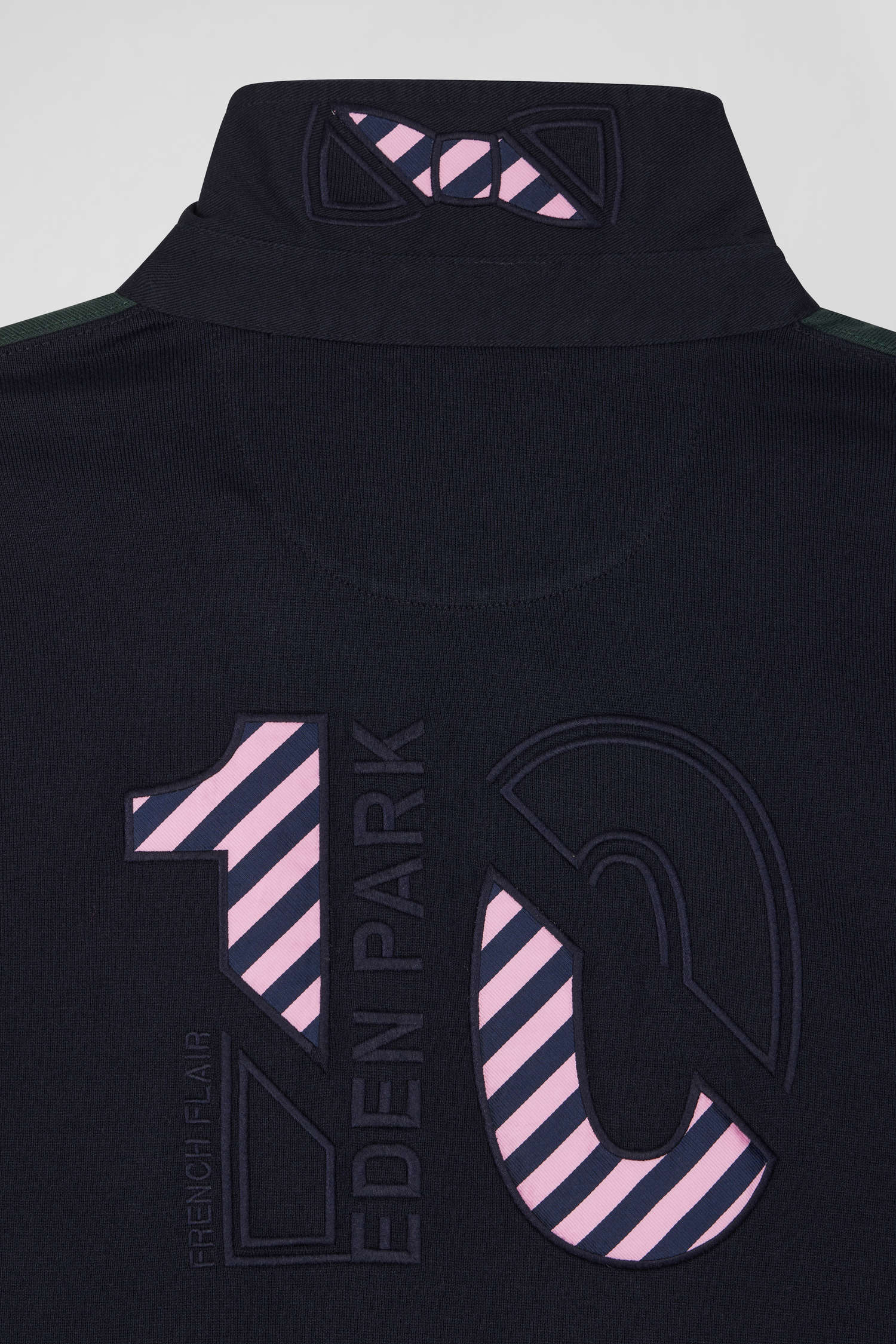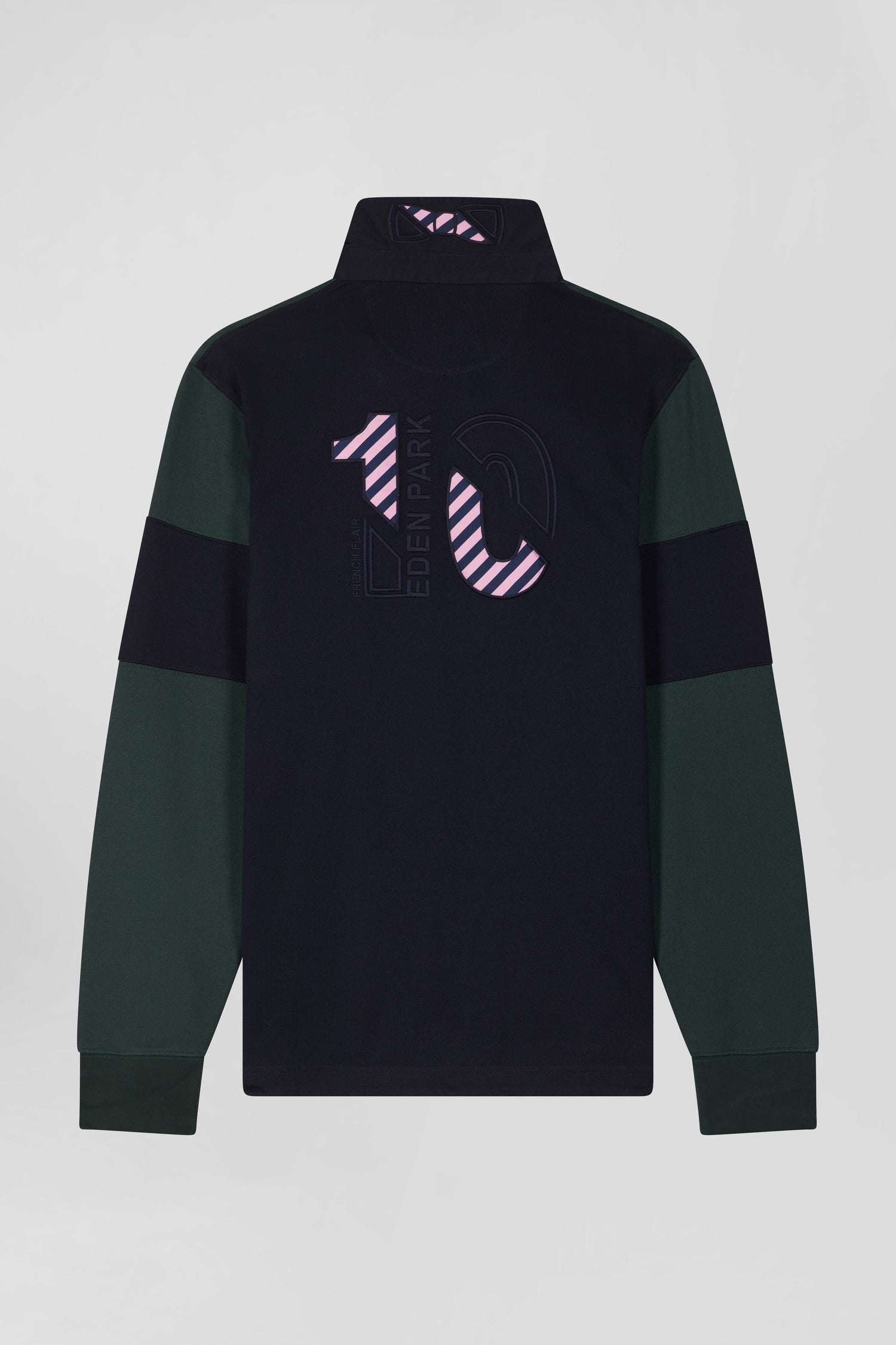 Make a style statement with this Eden Park long-sleeved men's jersey. Sporting elegance is reinvented in a colorblock tribute to the iconic colors of our House. The bold embroidery of the number 10 on the back, highlighted by hooped tie fabric, celebrates rugby heritage with panache. The classic collar, contrasting button placket and iconic embroidered bow tie give this characterful piece a distinguished finish.