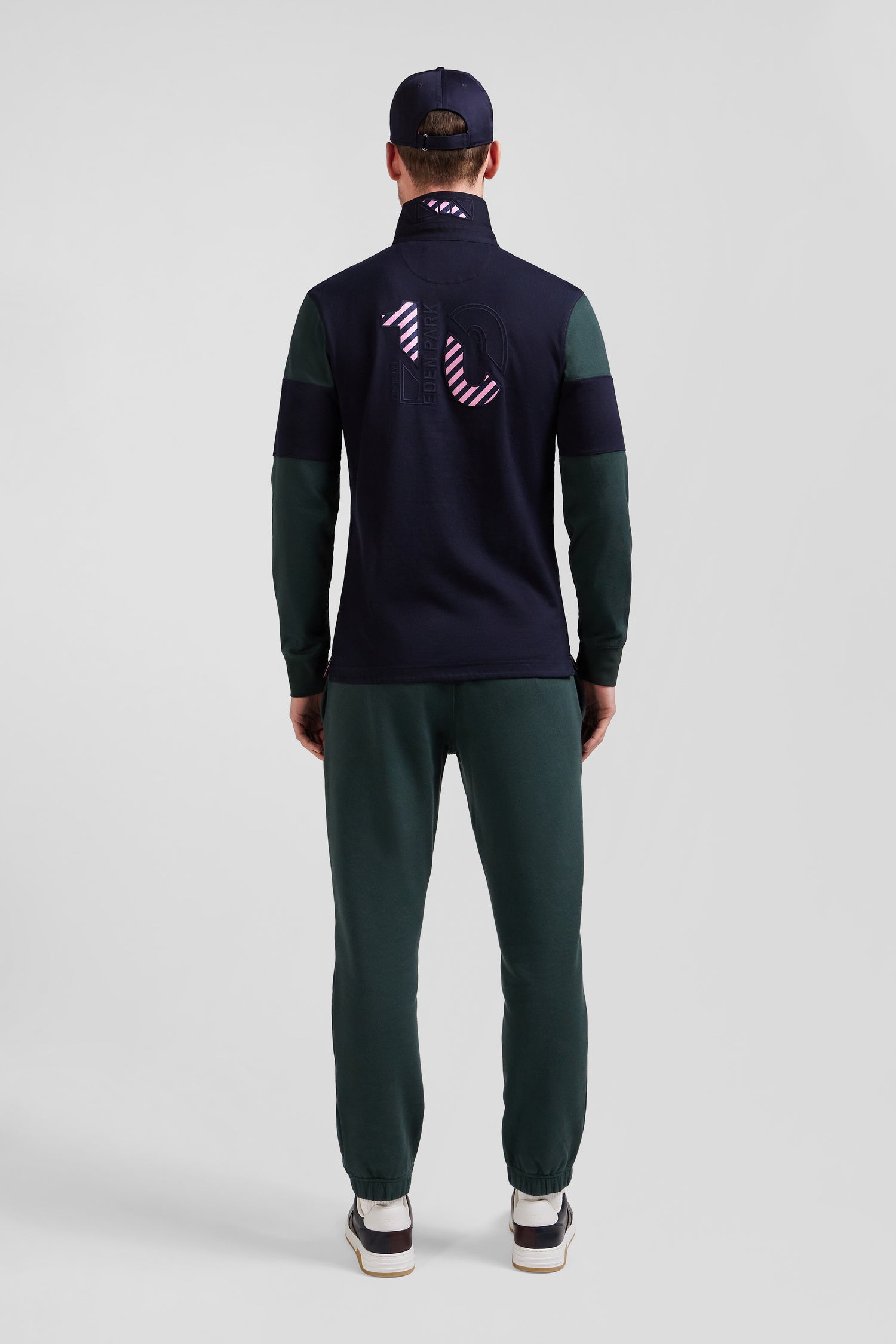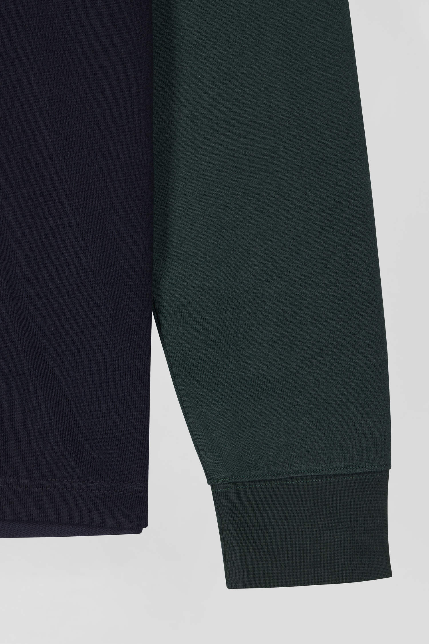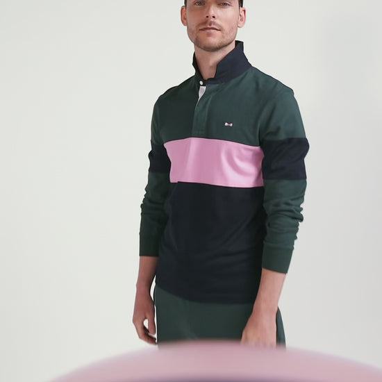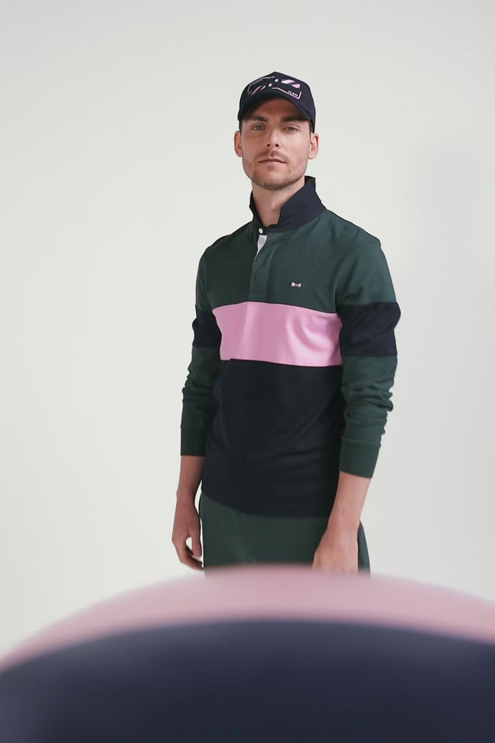 Make a style statement with this Eden Park long-sleeved men's jersey. Sporting elegance is reinvented in a colorblock tribute to the iconic colors of our House. The bold embroidery of the number 10 on the back, highlighted by hooped tie fabric, celebrates rugby heritage with panache. The classic collar, contrasting button placket and iconic embroidered bow tie give this characterful piece a distinguished finish.