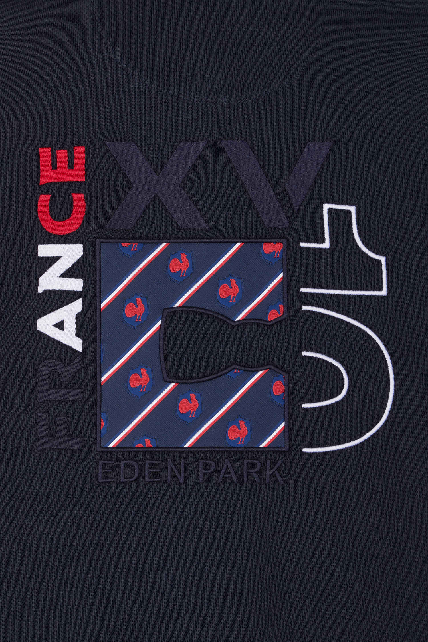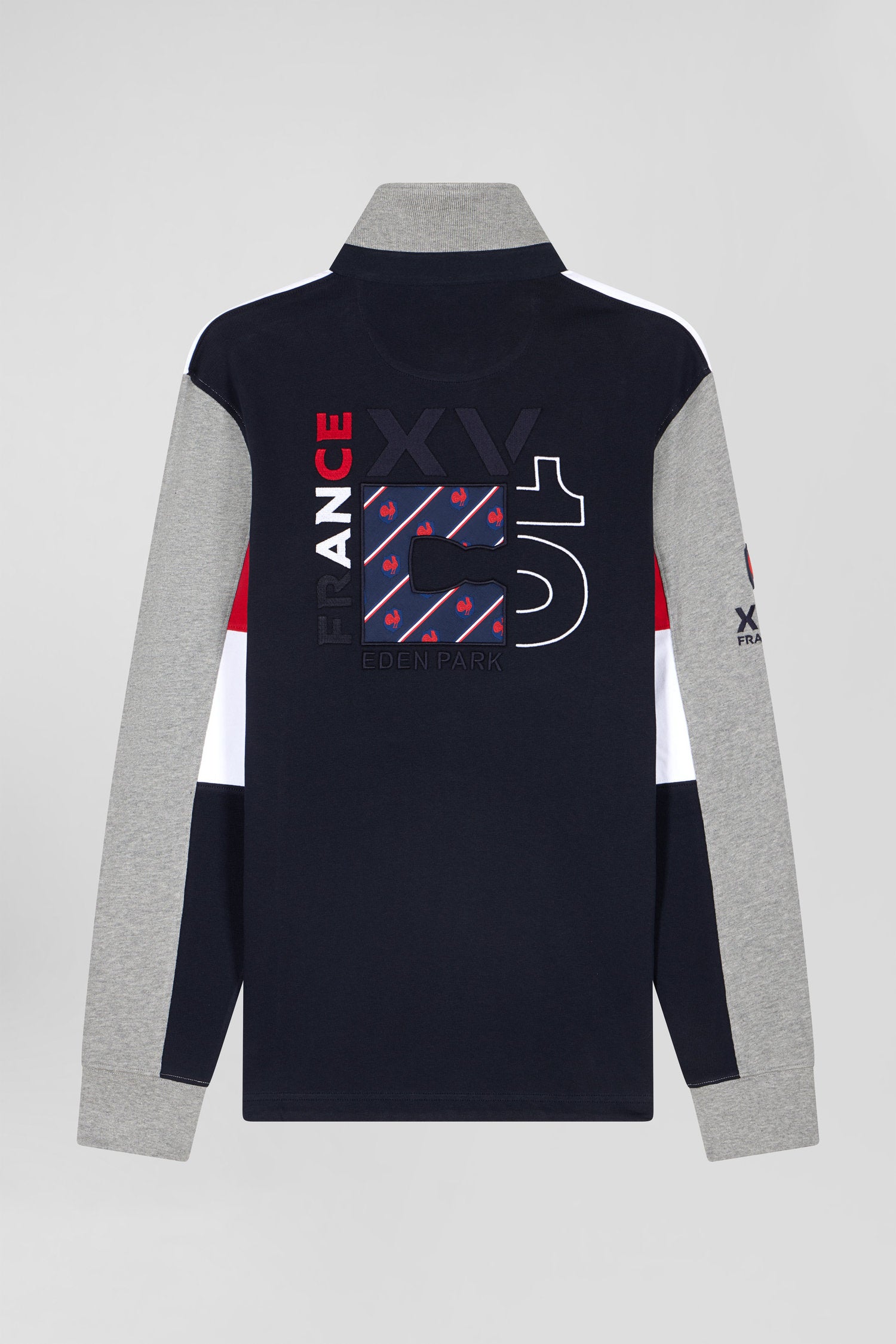 Celebrate the union of style and sport with our long-sleeved jersey in the colors of the XV de France. This unique design incorporates tricolor sleeve cut-outs, a gum badge, and back embroidery adorned with a tie fabric applique, fusing the icons of the XV de France with Eden Park emblems. An elegant tribute to the spirit of French rugby, this jersey is a collector's item for rugby fans and sport-chic menswear enthusiasts alike.