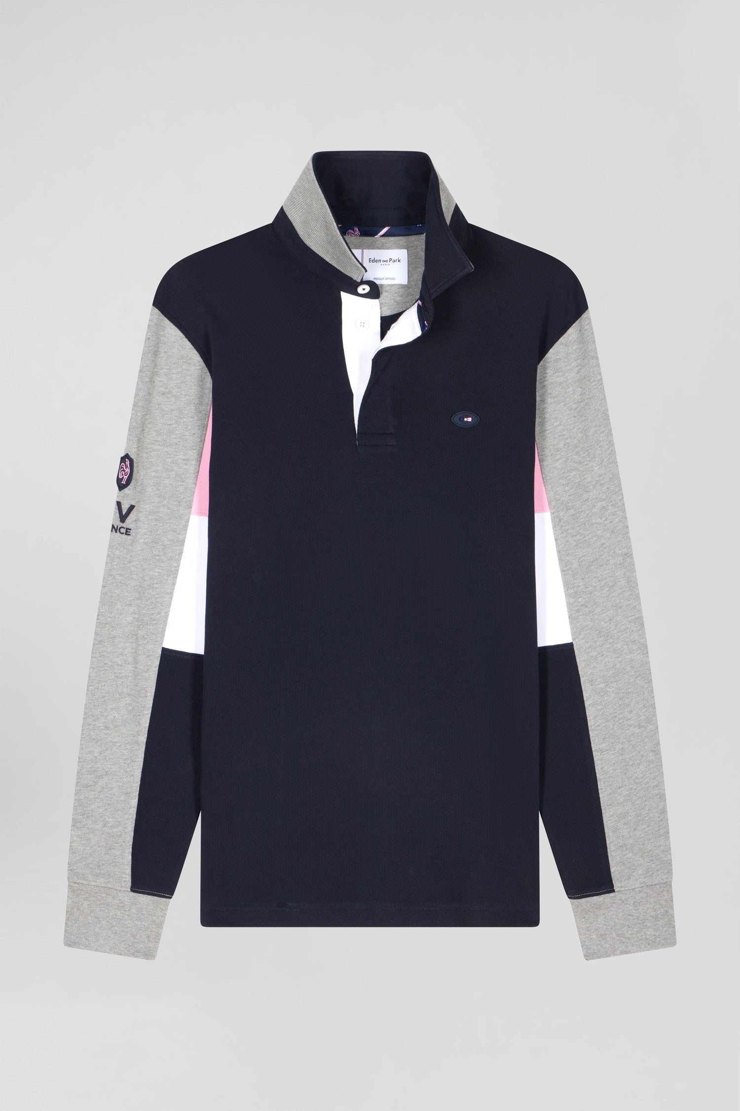 With this XV de France jersey, your style acquires a sporty twist in the blink of an eye. A tribute to the emblematic rugby jersey, this model is beautifully finished with embroidery and tie fabric featuring the iconic emblem of the XV de France: the French rooster. Made from luxurious cotton, this men's jersey can be worn with a jan or 5-pocket pants.