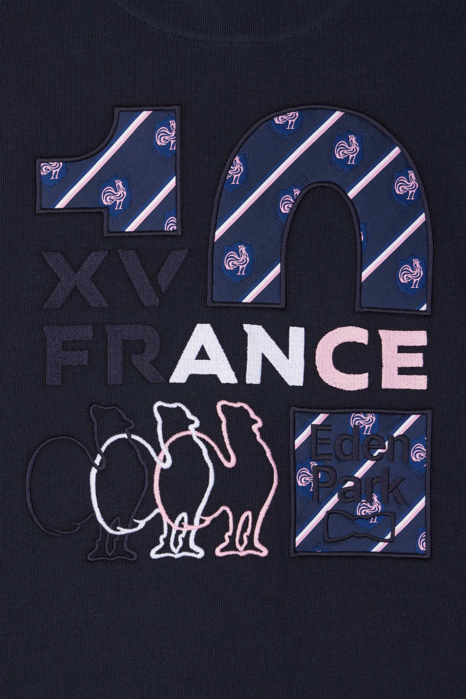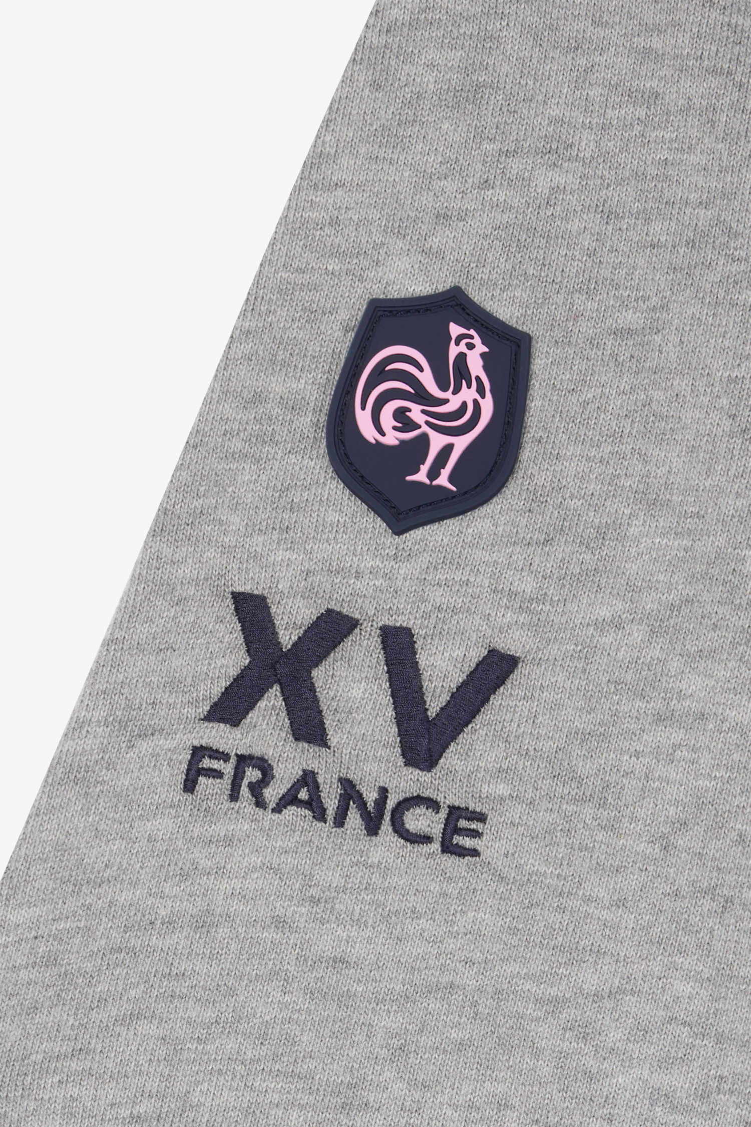 • Embroidery and application of tie fabric in the colors of the XV de France