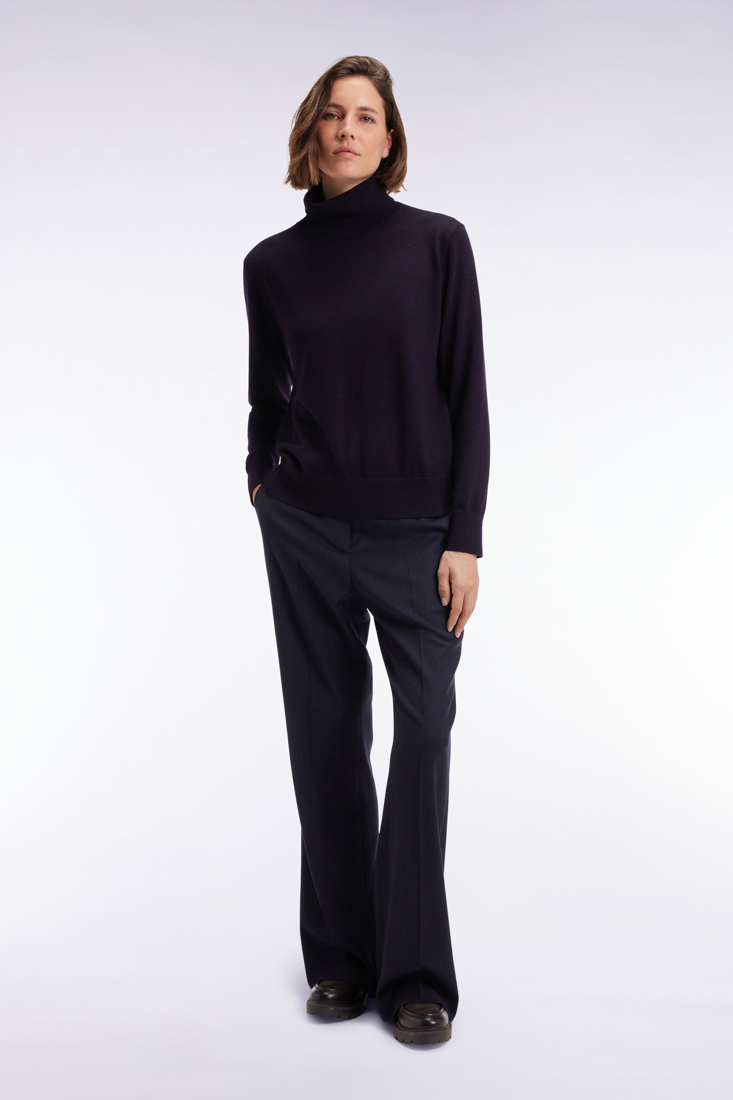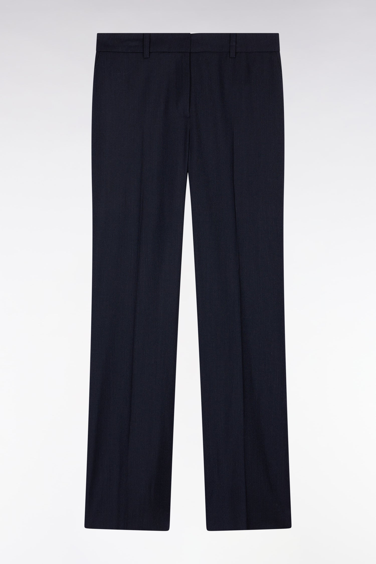 Tailoring spirit and sharp lines for these flare-cut pants in navy striped flannel. The slightly flared cut enhances the silhouette, while the tone-on-tone milleraie stripes give them a refined look. Wear with the matching double-breasted jacket or a turtleneck sweater for a timelessly chic ensemble from morning to night.