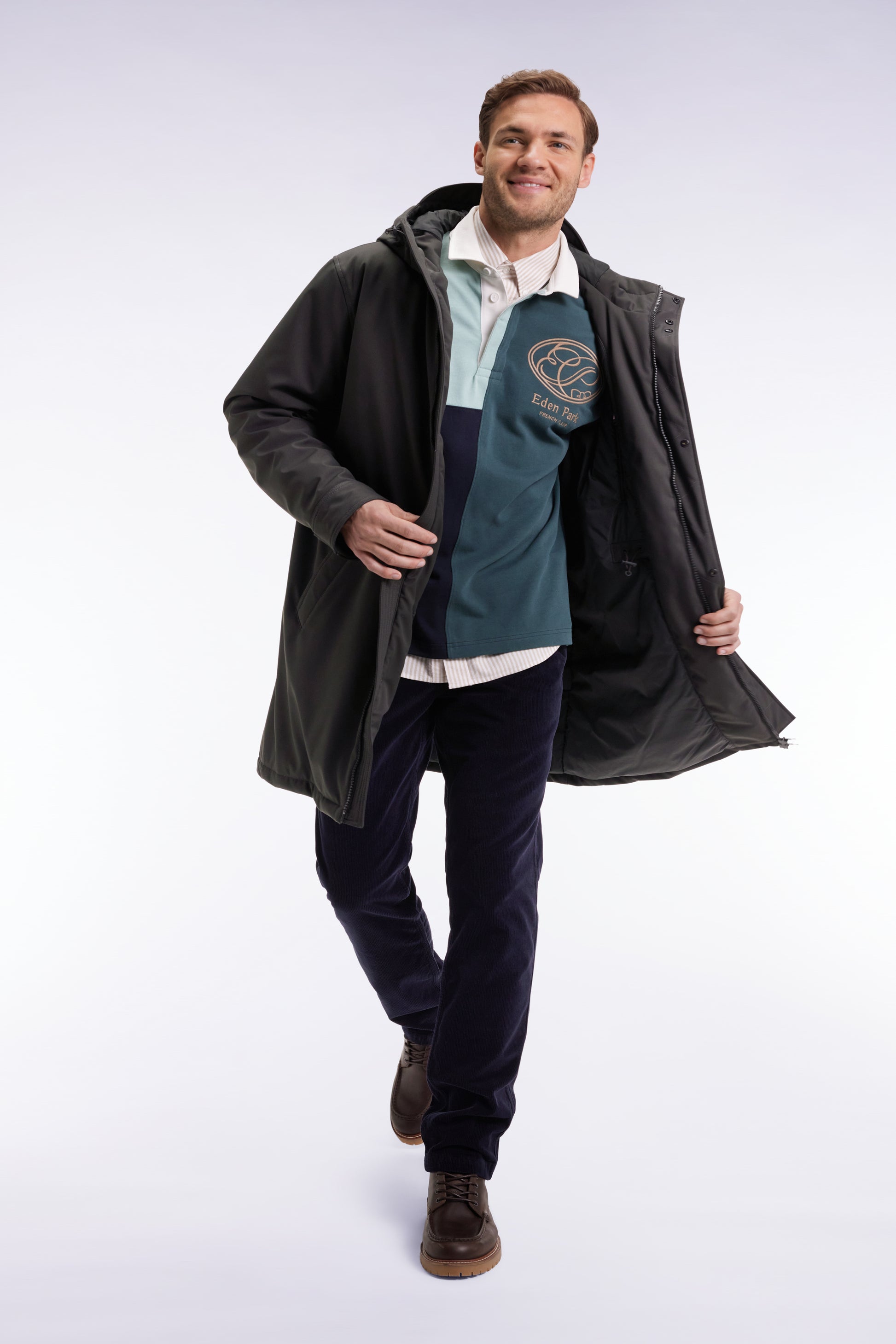 Available in navy, khaki or black, this long matte nylon parka embodies the perfect balance between urban sobriety and protection against the elements. Its interior quilting provides ideal thermal comfort for mid-season and winter alike. Its silhouette adjusts with a discreet drawstring at the back and hood. The double-zip concealed under the button placket, practical pockets and iconic finishing reinforce the functional, refined look of this men's parka with soft-touch supplies.
