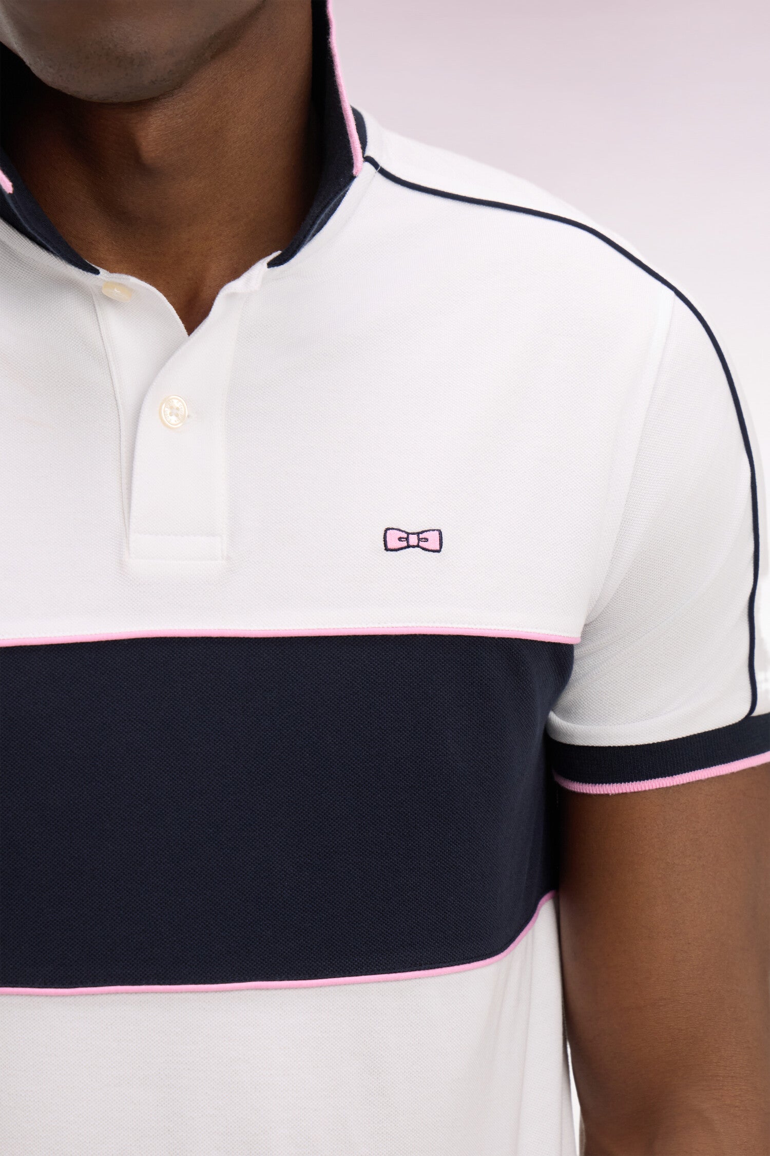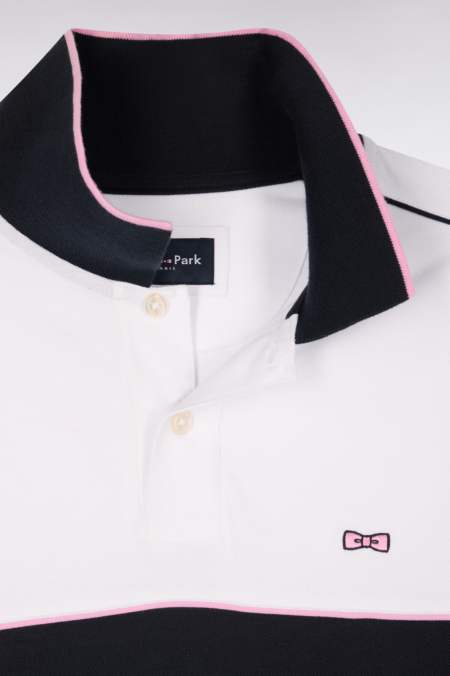 Short-sleeved polo shirt in white cotton with navy cutouts, regular fit