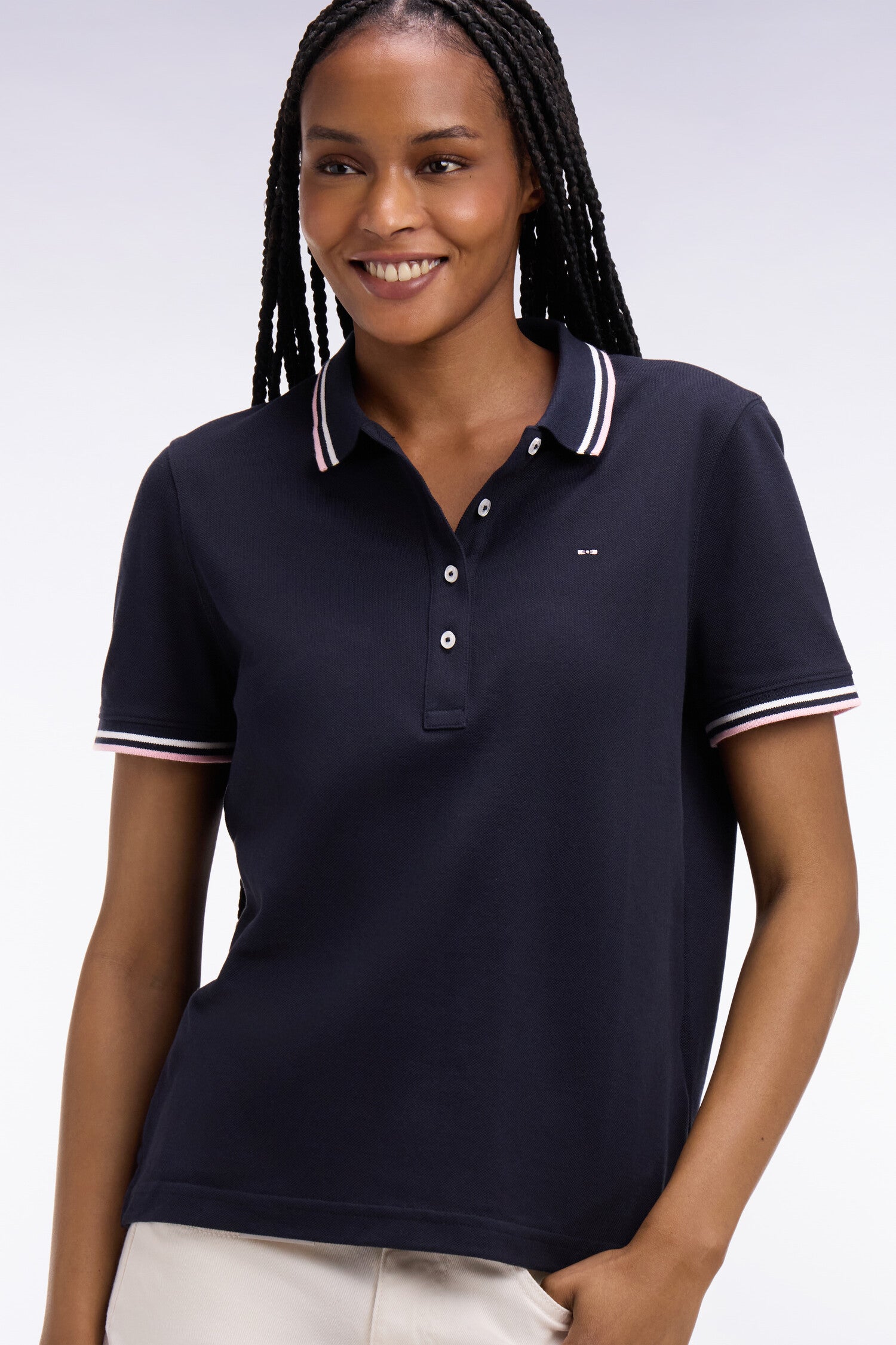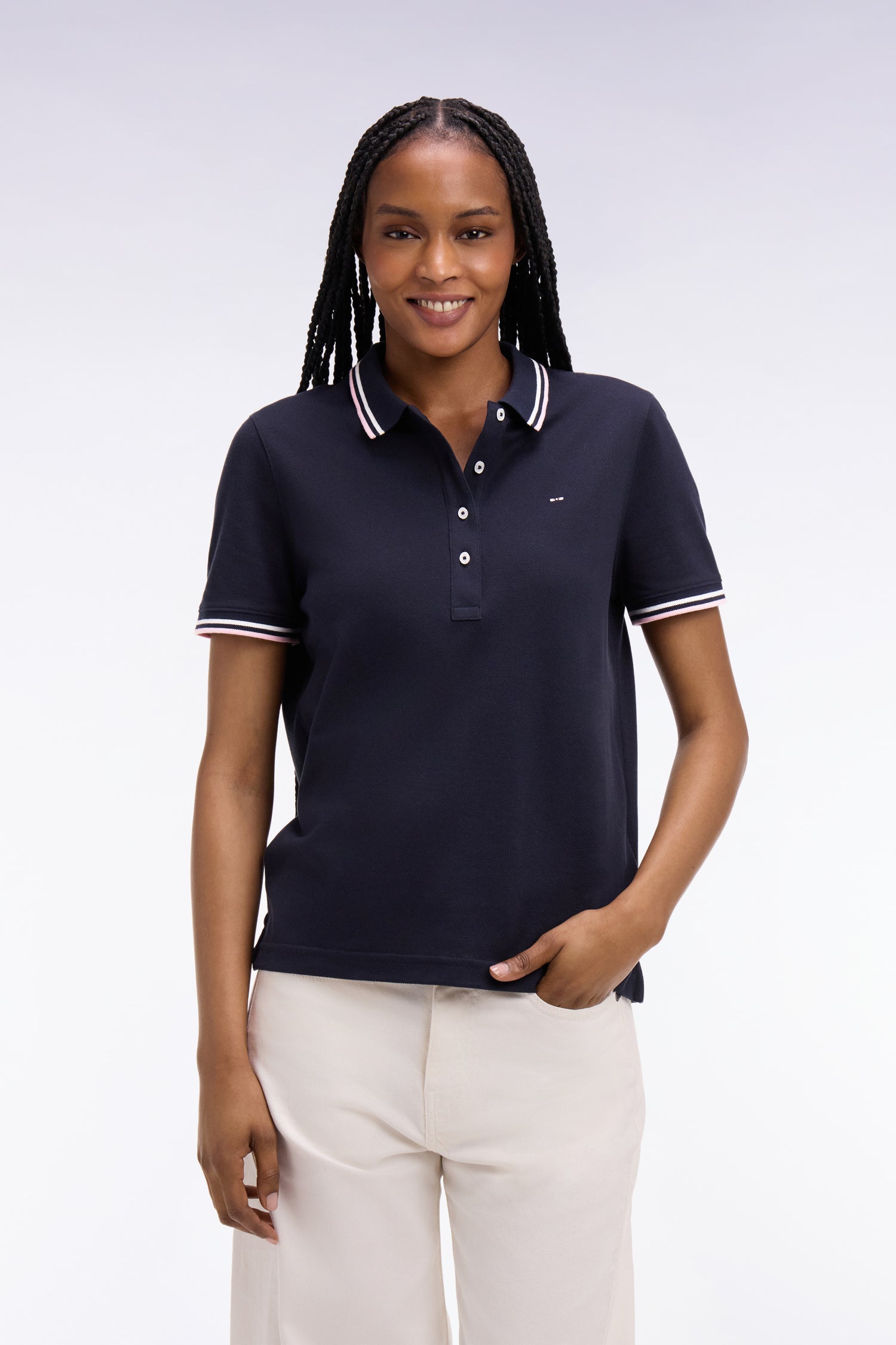 Ce polo à manches courtes en pur coton s’impose comme un incontournable du vestiaire féminin grâce à sa coupe droite confortable et son style sport chic assumé. Son emblème nœud papillon brodé sur la poitrine et ses finitions en bords-côtes à fines rayures au col et manches apportent une touche subtilement sportive et féminine. Décliné en plusieurs coloris doux ou plus contrastés, ce polo femme s’associe naturellement à un jean droit, un bermuda tendance ou pourquoi pas à notre jupe courte en denim pour une allure urbaine plus travaillée. Ce modèle est également offert dans une coupe slim plus ajustée pour s'adapter à toutes les envies et morphologies.