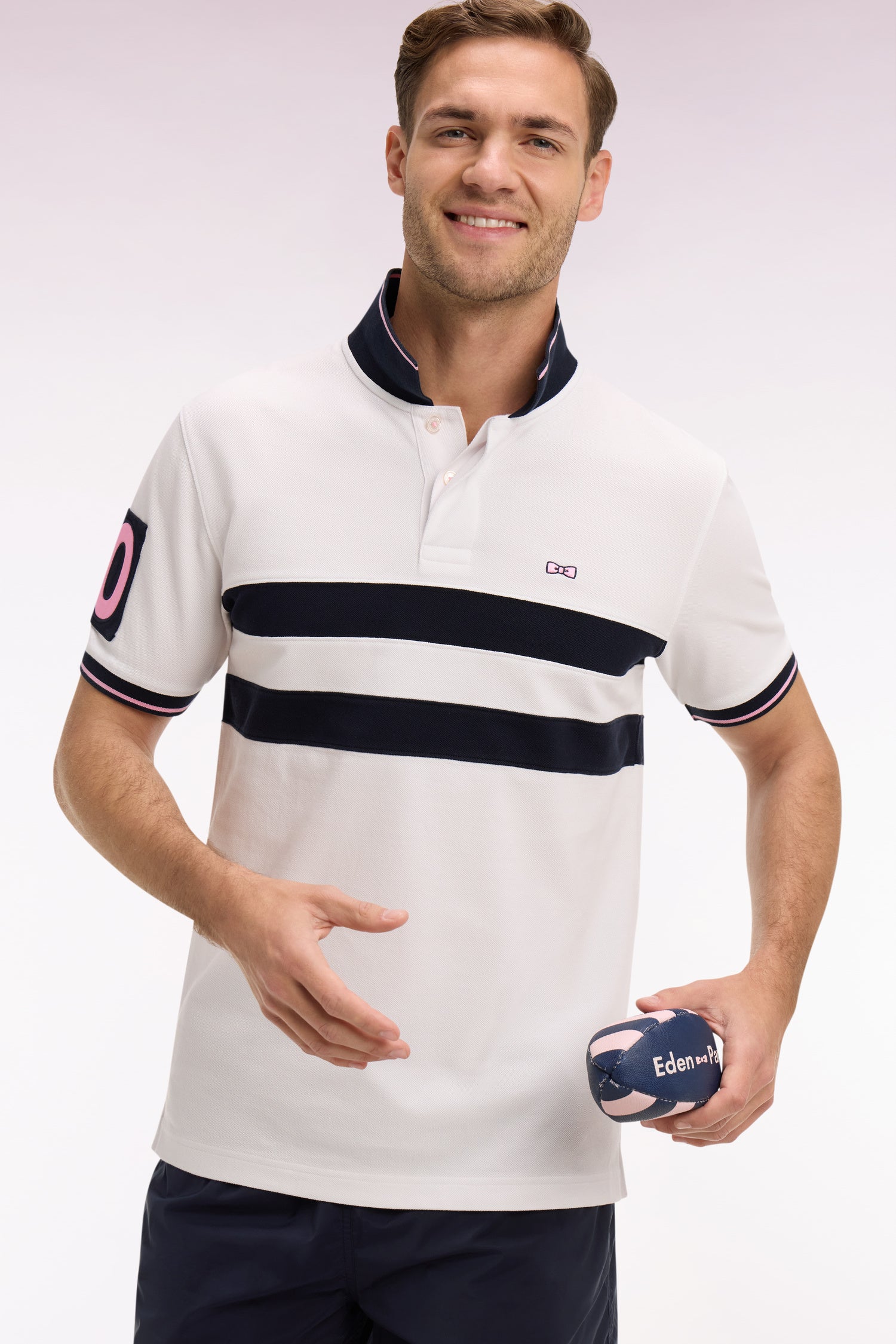 Ce polo à manches courtes en piqué de coton revisite les codes rugby avec ses deux bandes horizontales contrastées sur la poitrine et sa broderie 10 sur la manche, clin d’œil au numéro historique du fondateur de notre Maison. Son col rayé en bords-côtes et ses finitions contrastées apportent structure et élégance. Un essentiel sport chic au caractère affirmé pour accompagner votre quotidien.