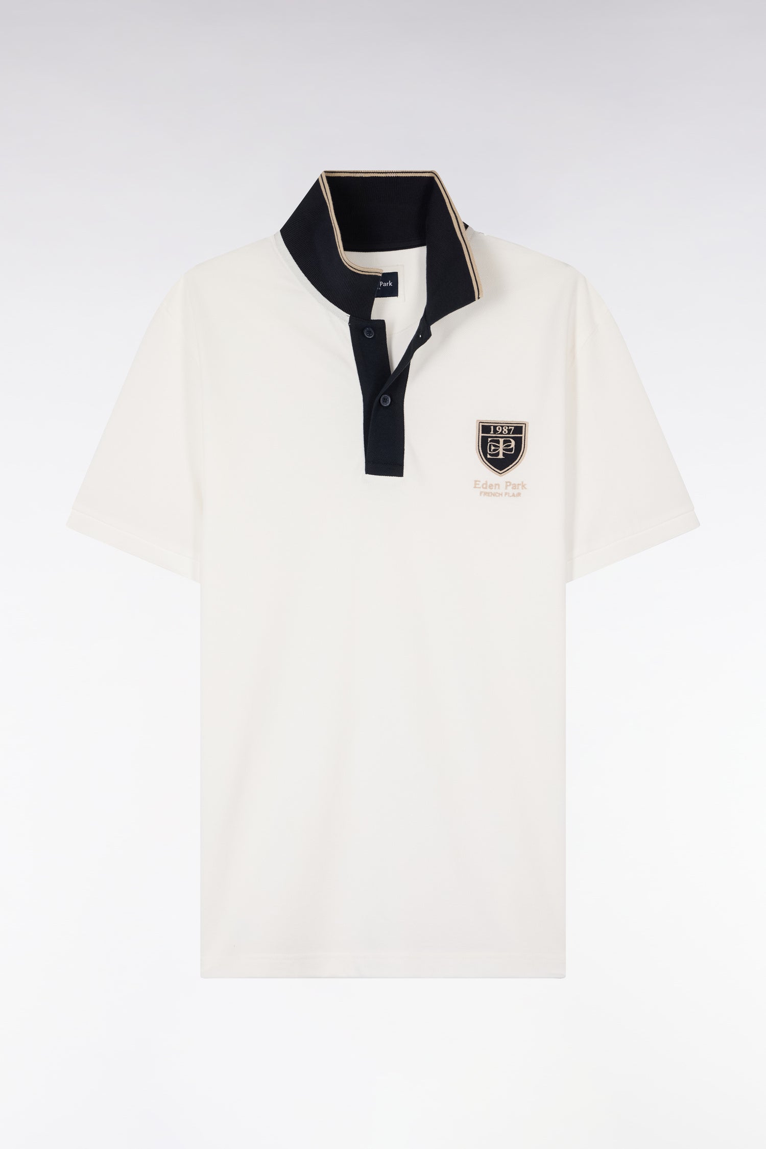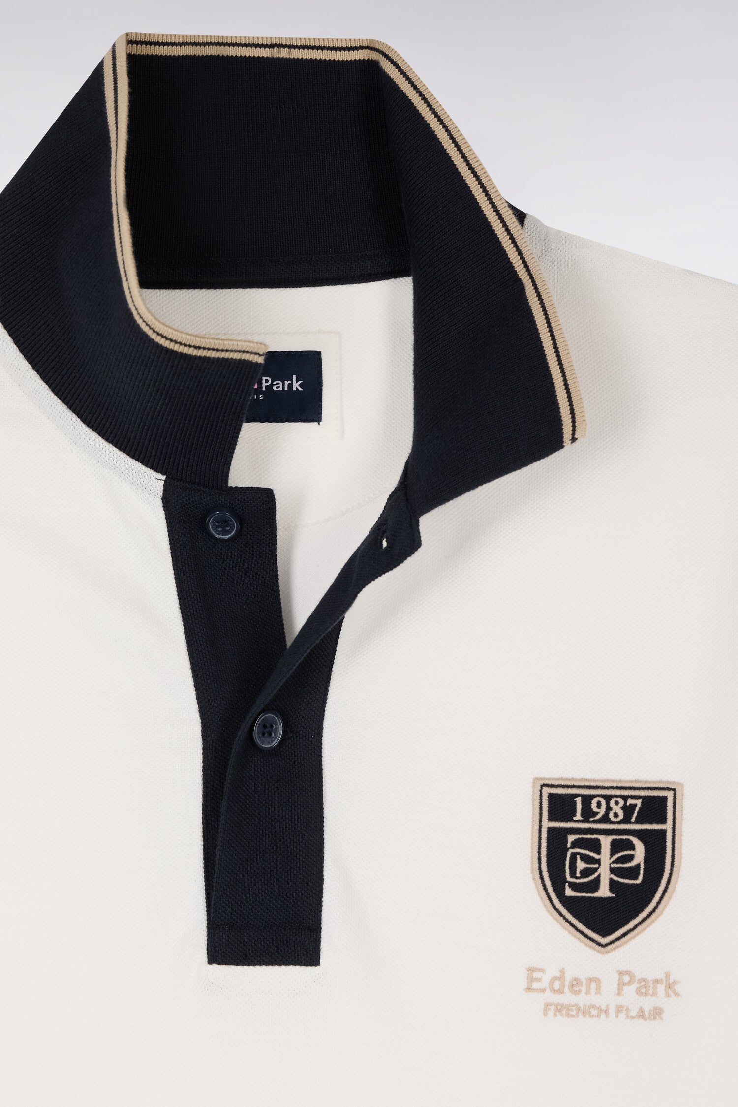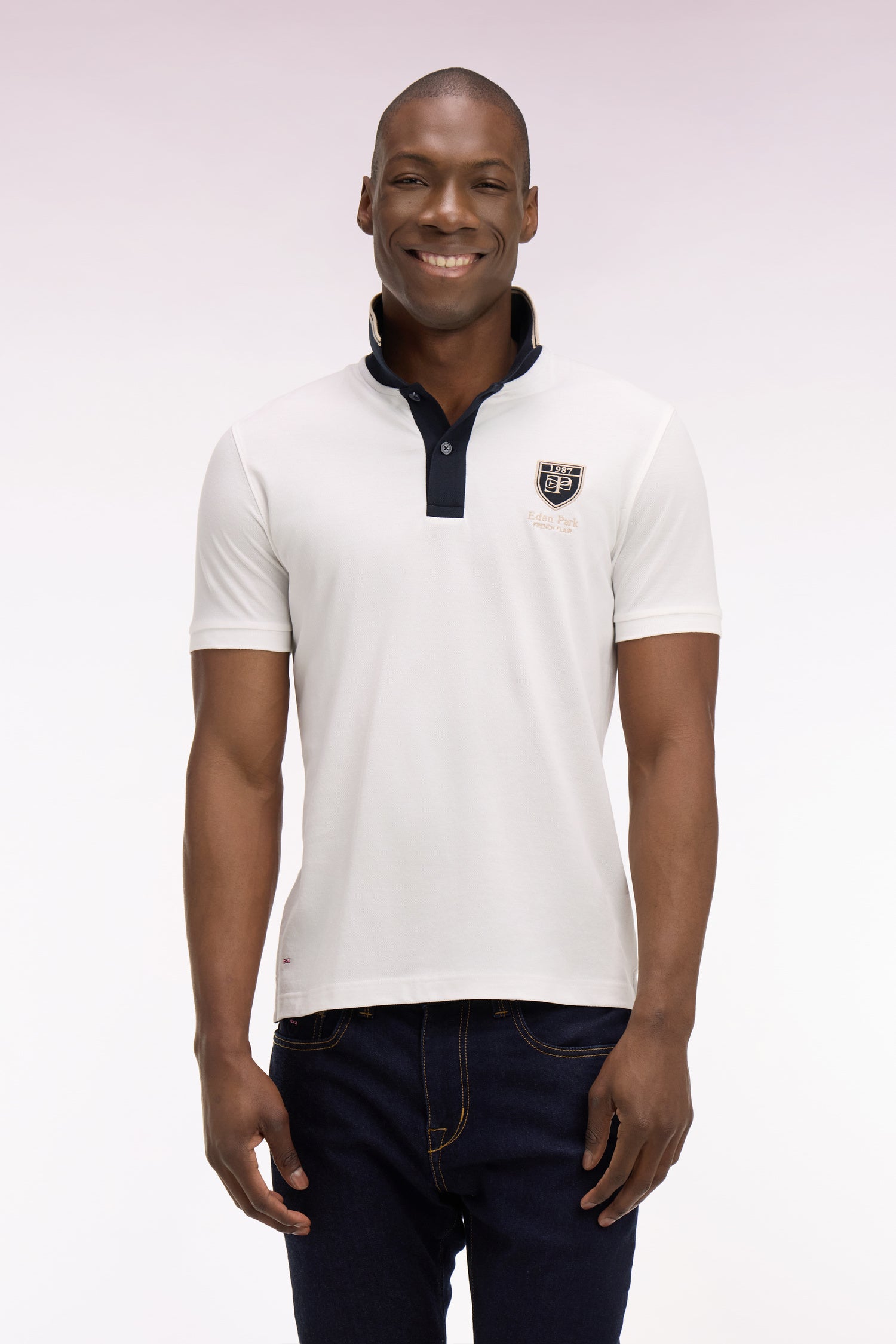 Ce polo en piqué de coton s’impose comme une pièce raffinée du vestiaire sport chic grâce à son écusson poitrine réalisé dans un esprit Ivy League, clin d’œil à une esthétique quiet luxury très actuelle. Sa coupe regular droite et son col polo marine finement rayé, prolongé par une patte de boutonnage assortie, apportent structure et élégance, tandis que les bas de manches en maille unie renforcent une allure plus habillée. Décliné dans des coloris pastel intemporels, il se porte aussi bien avec un short coordonné qu’avec un jean brut, selon l’allure recherchée.
