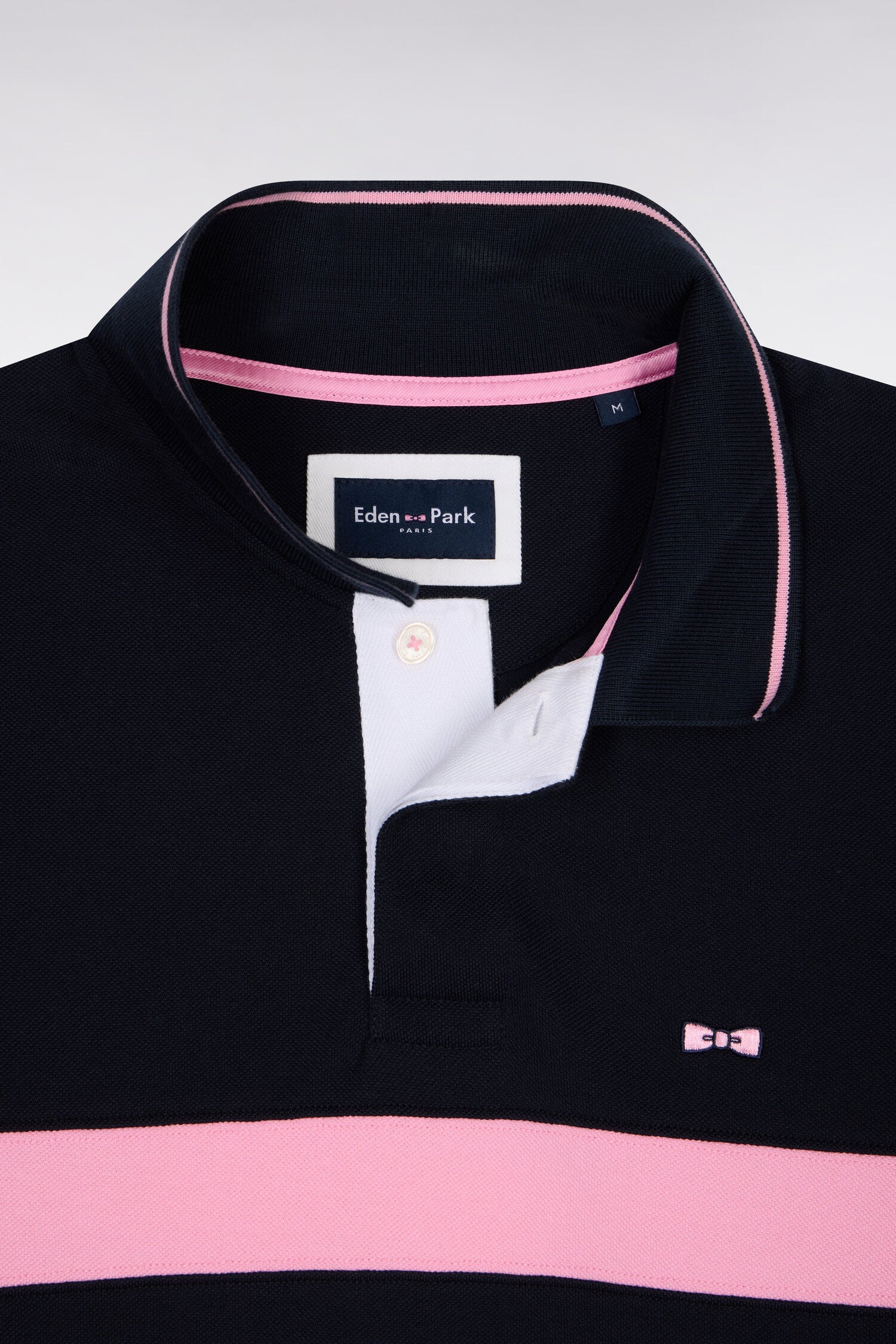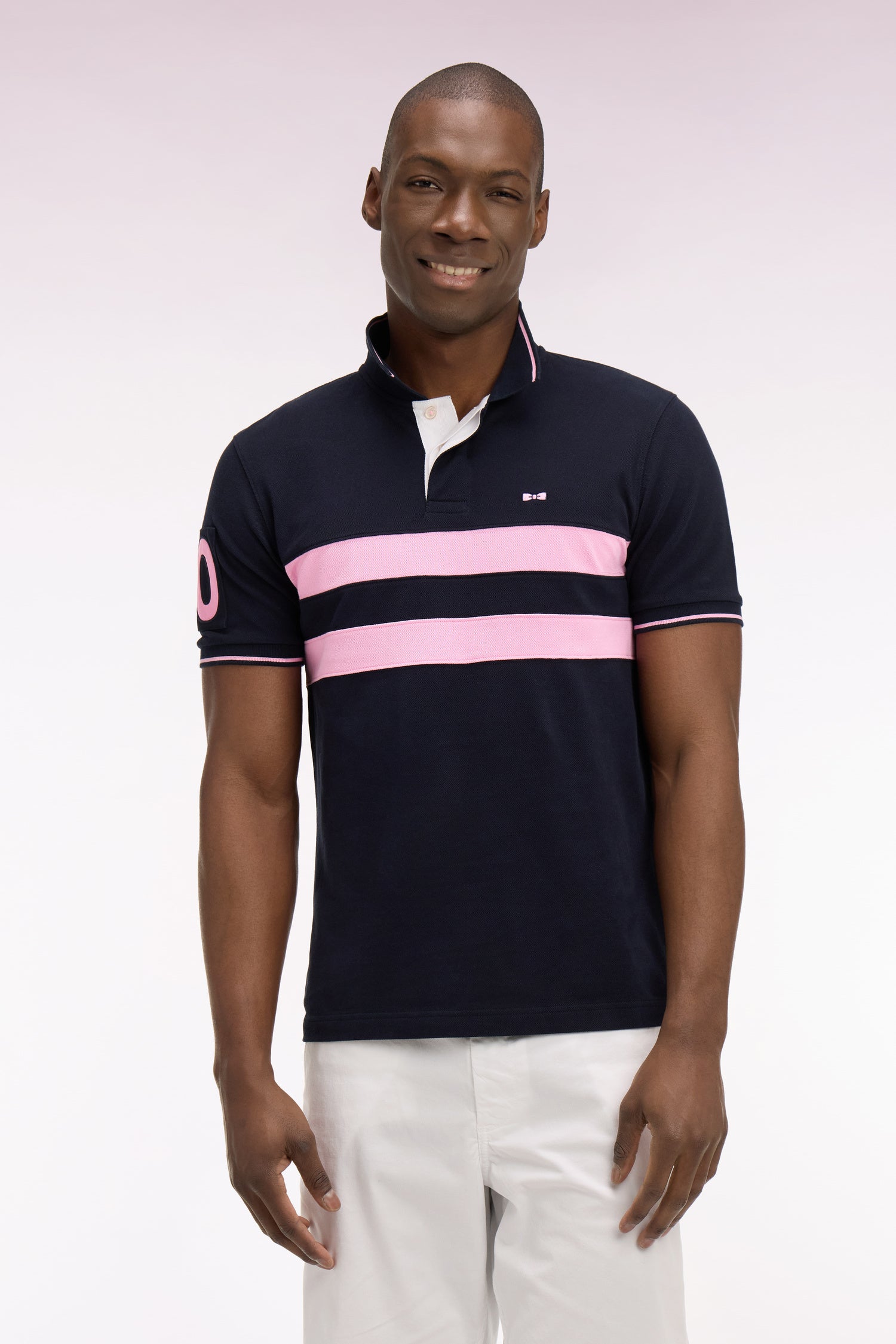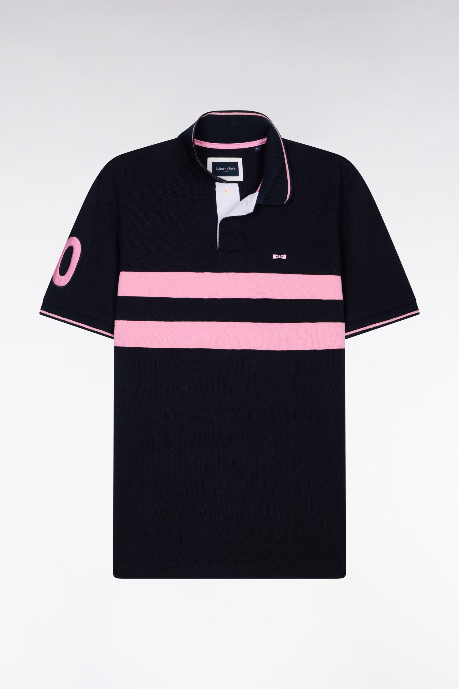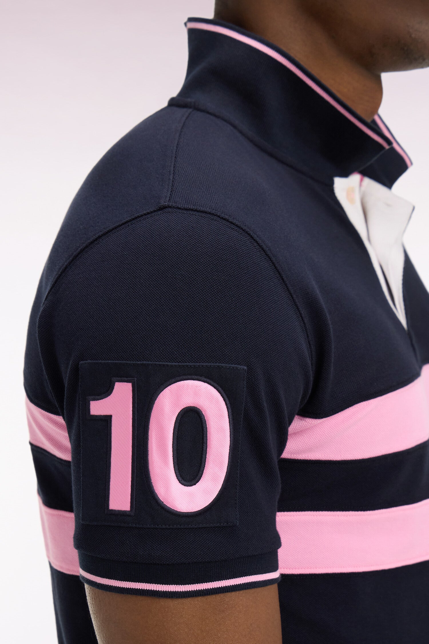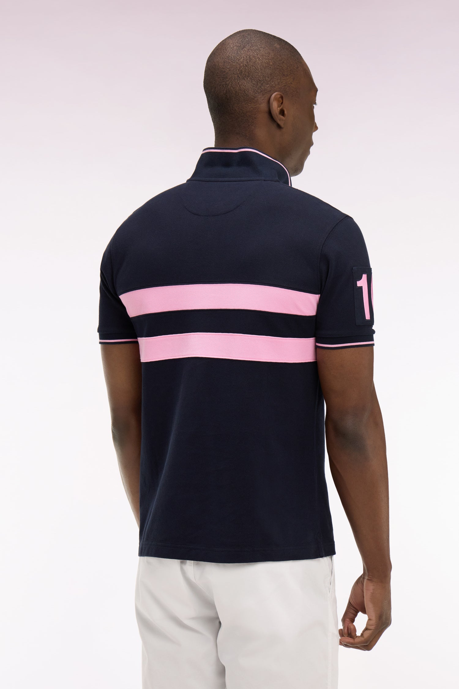 Ce polo à manches courtes en piqué de coton revisite les codes rugby avec ses deux bandes horizontales contrastées sur la poitrine et sa broderie 10 sur la manche, clin d’œil au numéro historique du fondateur de notre Maison. Son col rayé en bords-côtes et ses finitions contrastées apportent structure et élégance. Un essentiel sport chic au caractère affirmé pour accompagner votre quotidien.