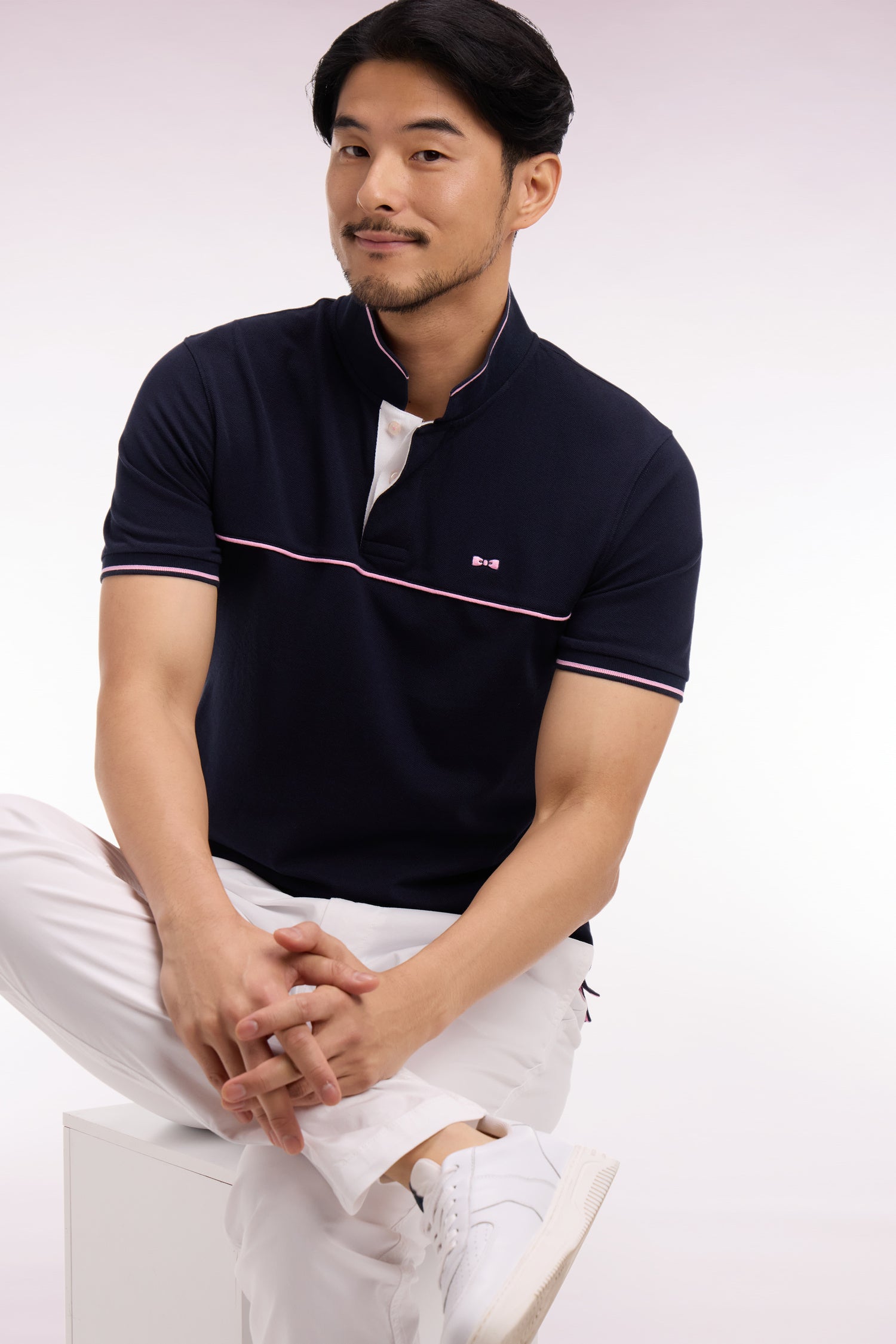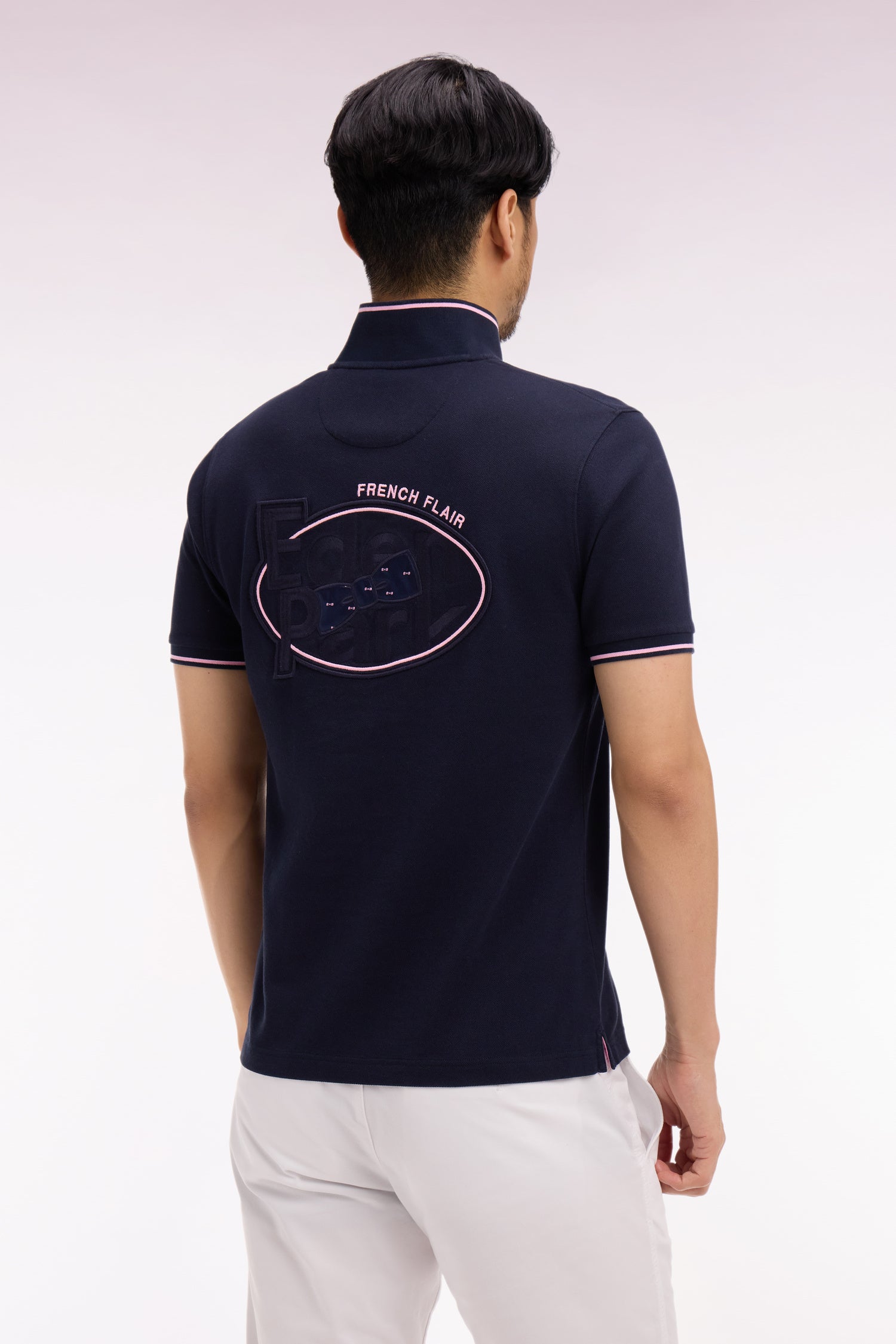 Notre polo masculin blanc ou marine se distingue par ses fines rayures roses agrémentant ses bords-côtes manches et col, un détail repris sur le passepoil qui traverse sa poitrine et sur le pourtour de ses fentes d'aisance. Ces finitions en font un modèle emblématique, reflétant l'esprit rugby chic de notre Maison.