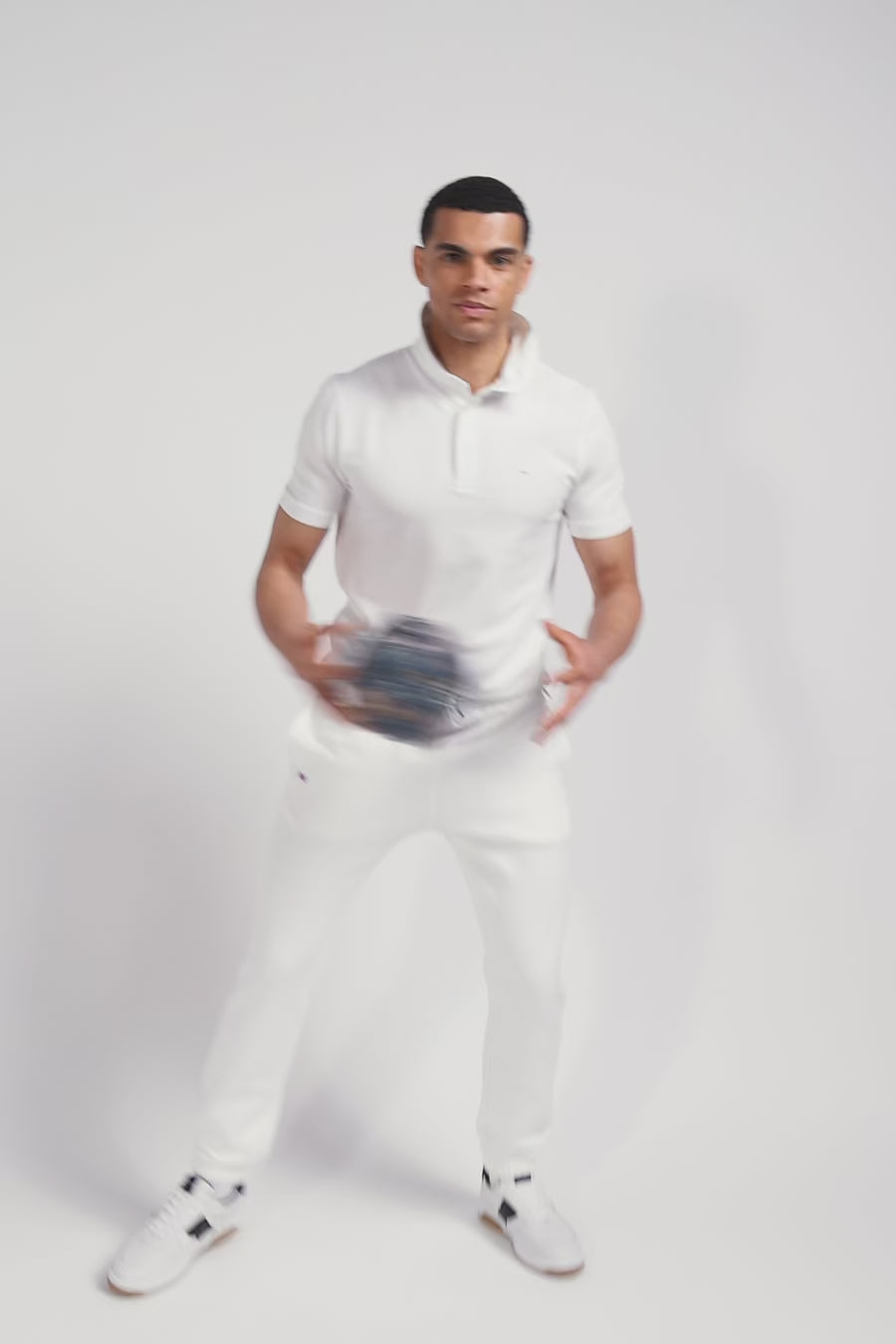 White low-top leather sneakers with navy blue cut-out