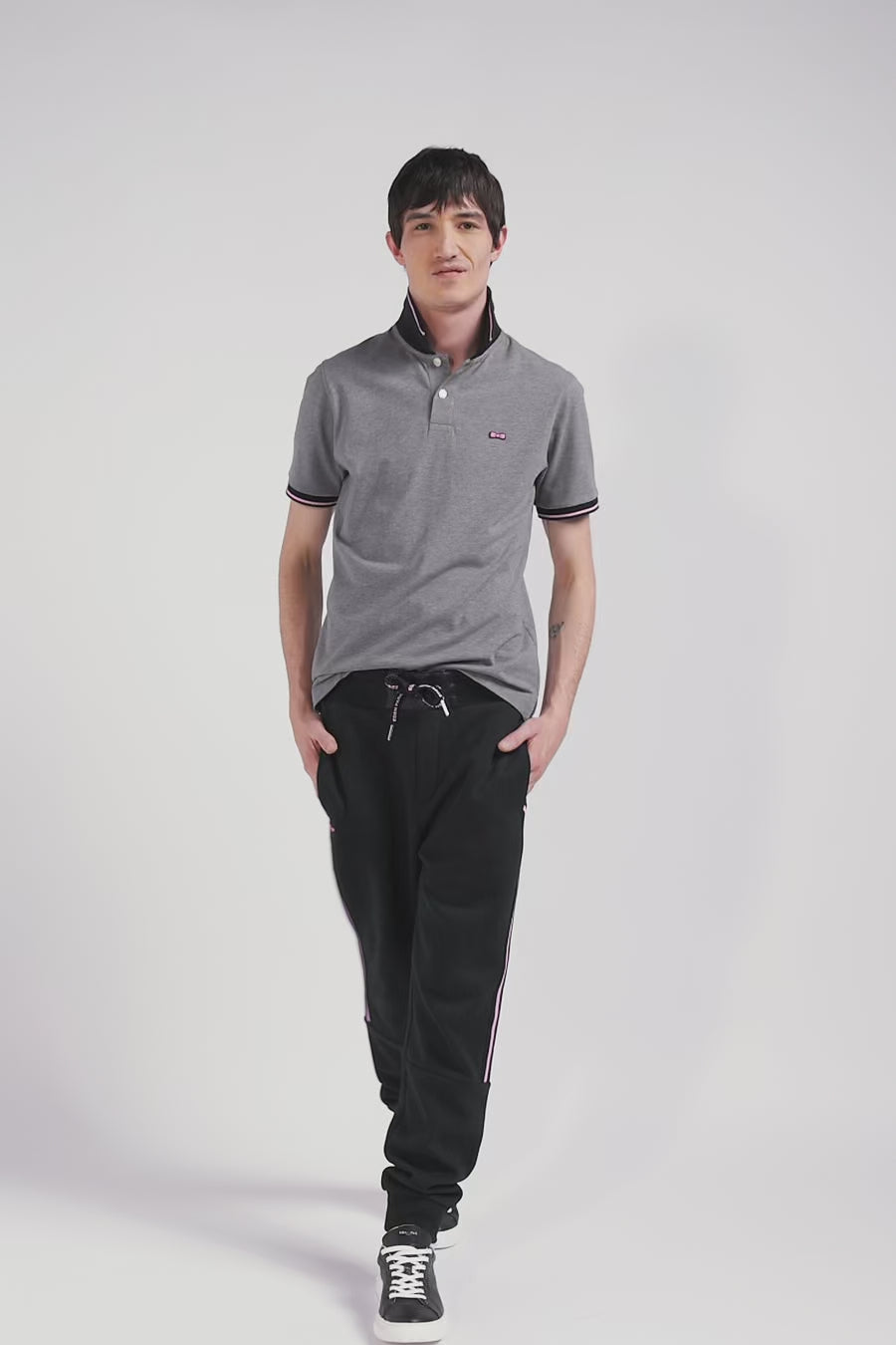 Slim grey short-sleeved stretch cotton polo shirt with Eden Park jacquard collar