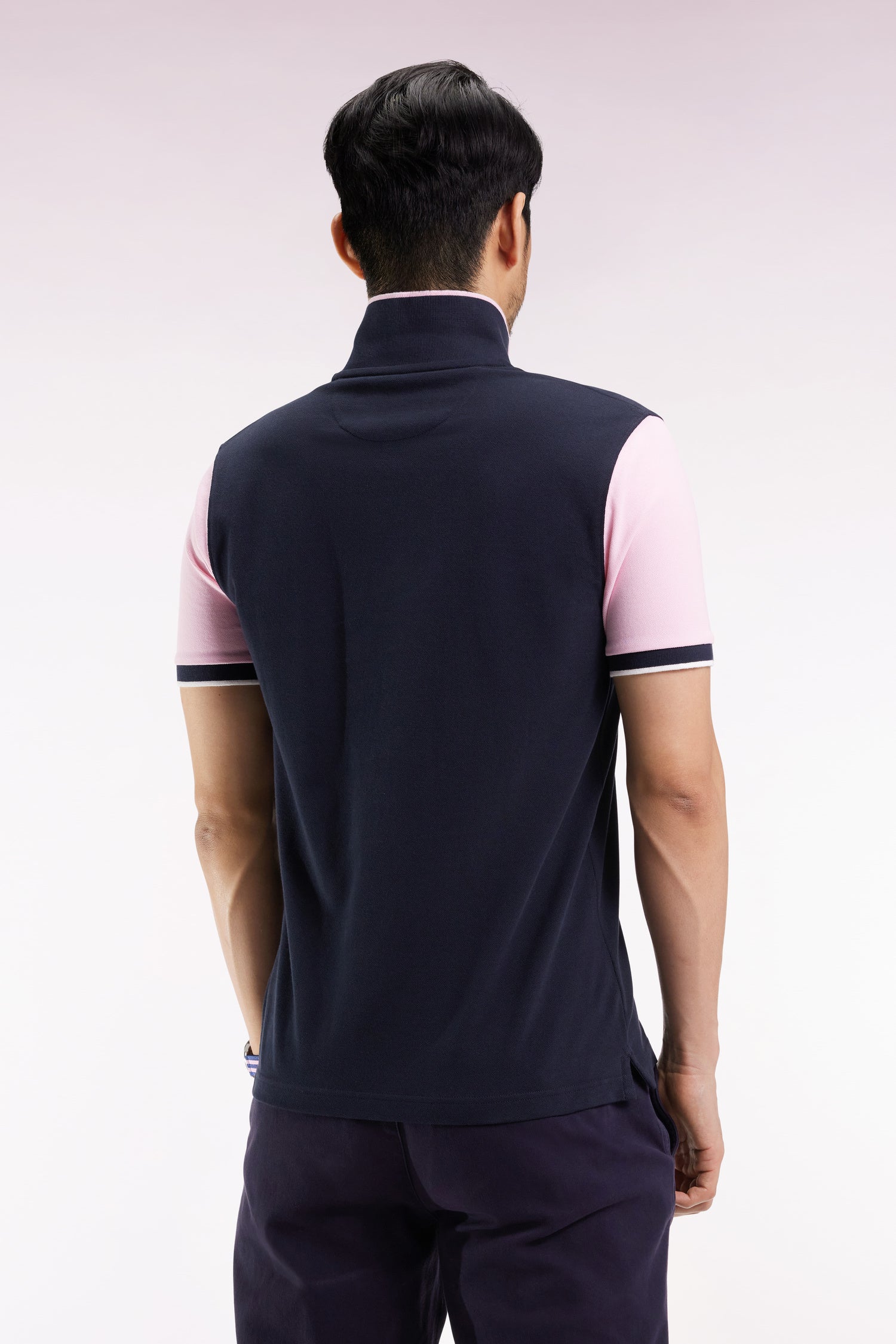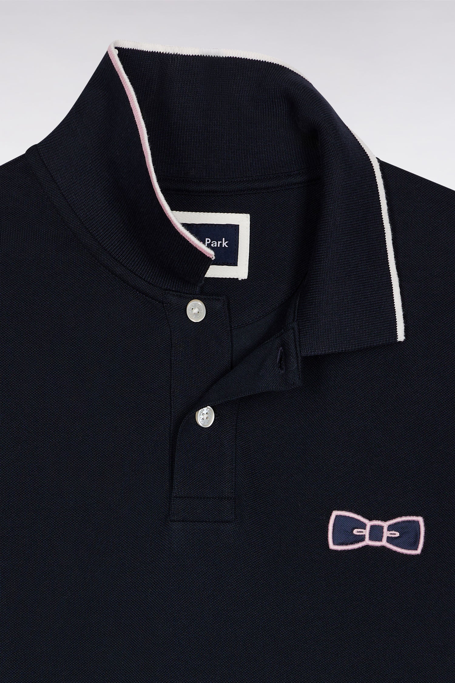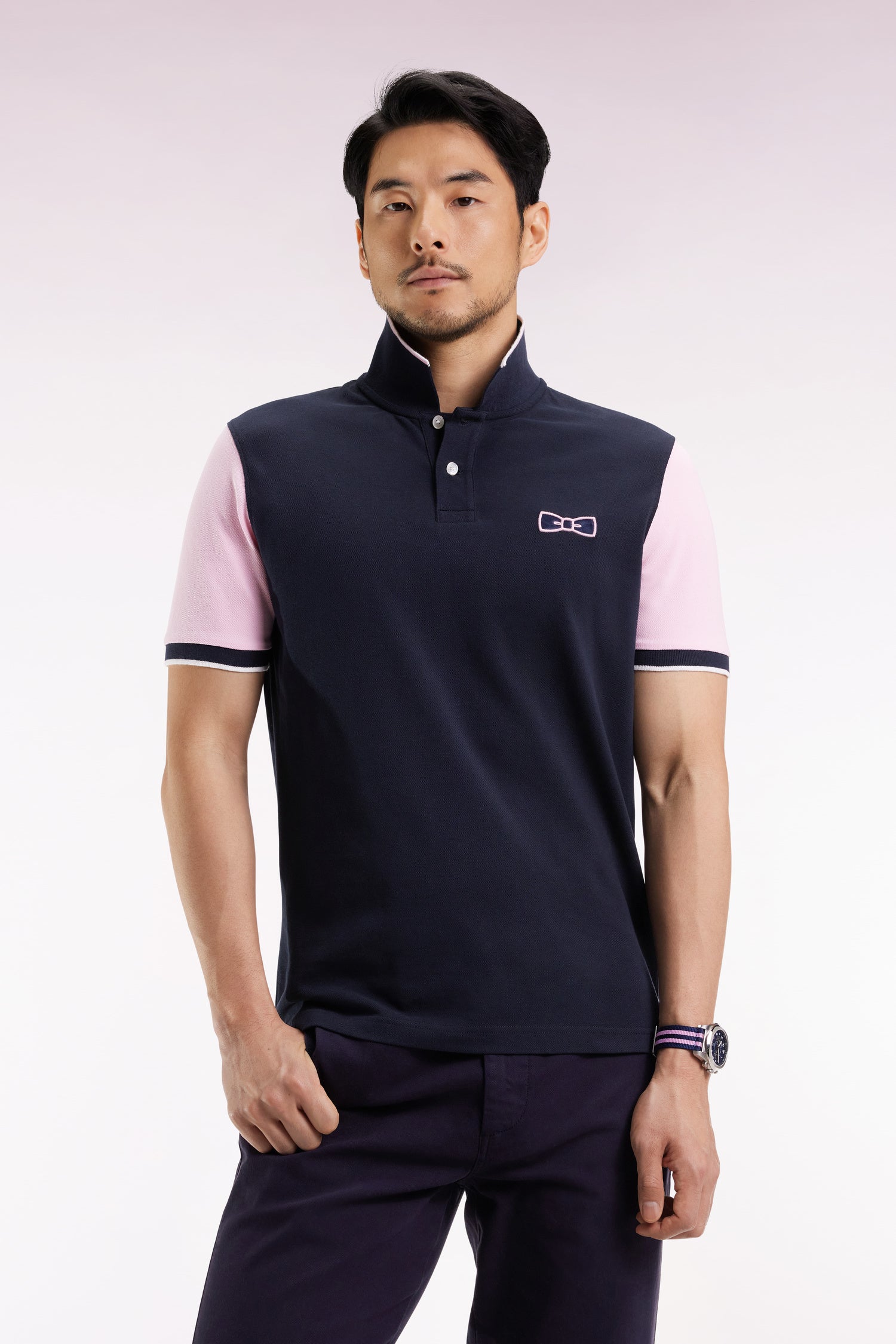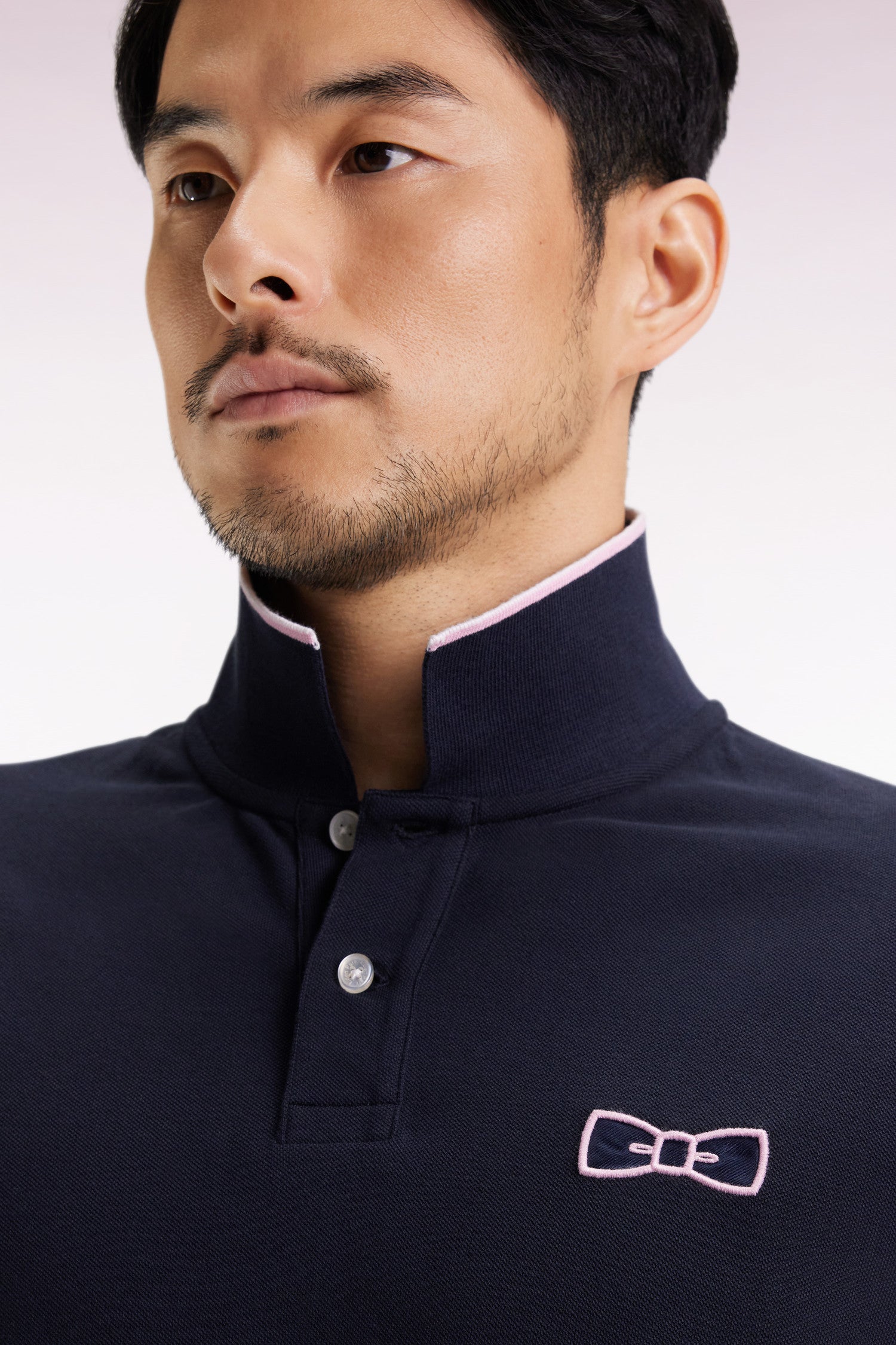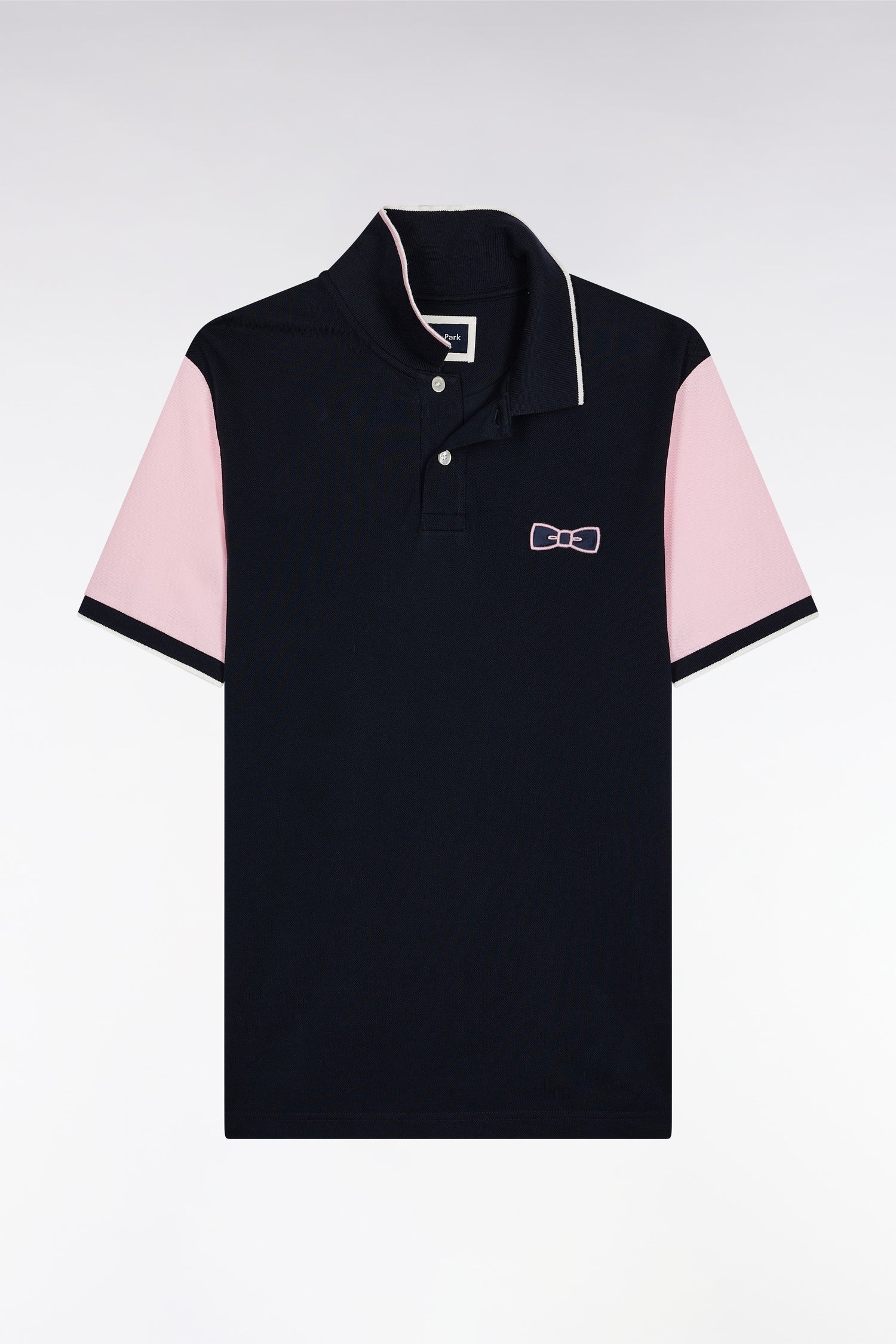 With its large silicone bow tie on the chest, this men's polo shirt proudly shows off its team. Made from navy cotton piqué, this model with pink sleeves has a straight cut for a comfortable fit that suits all body shapes. Above the button placket with rugby oval buttons, the collar is highlighted by a fine striped edging.