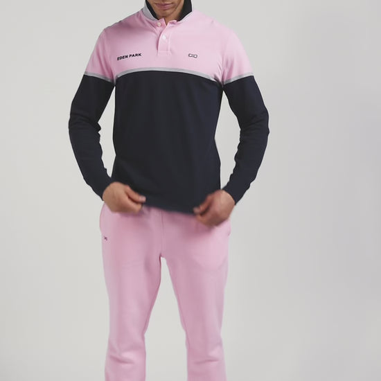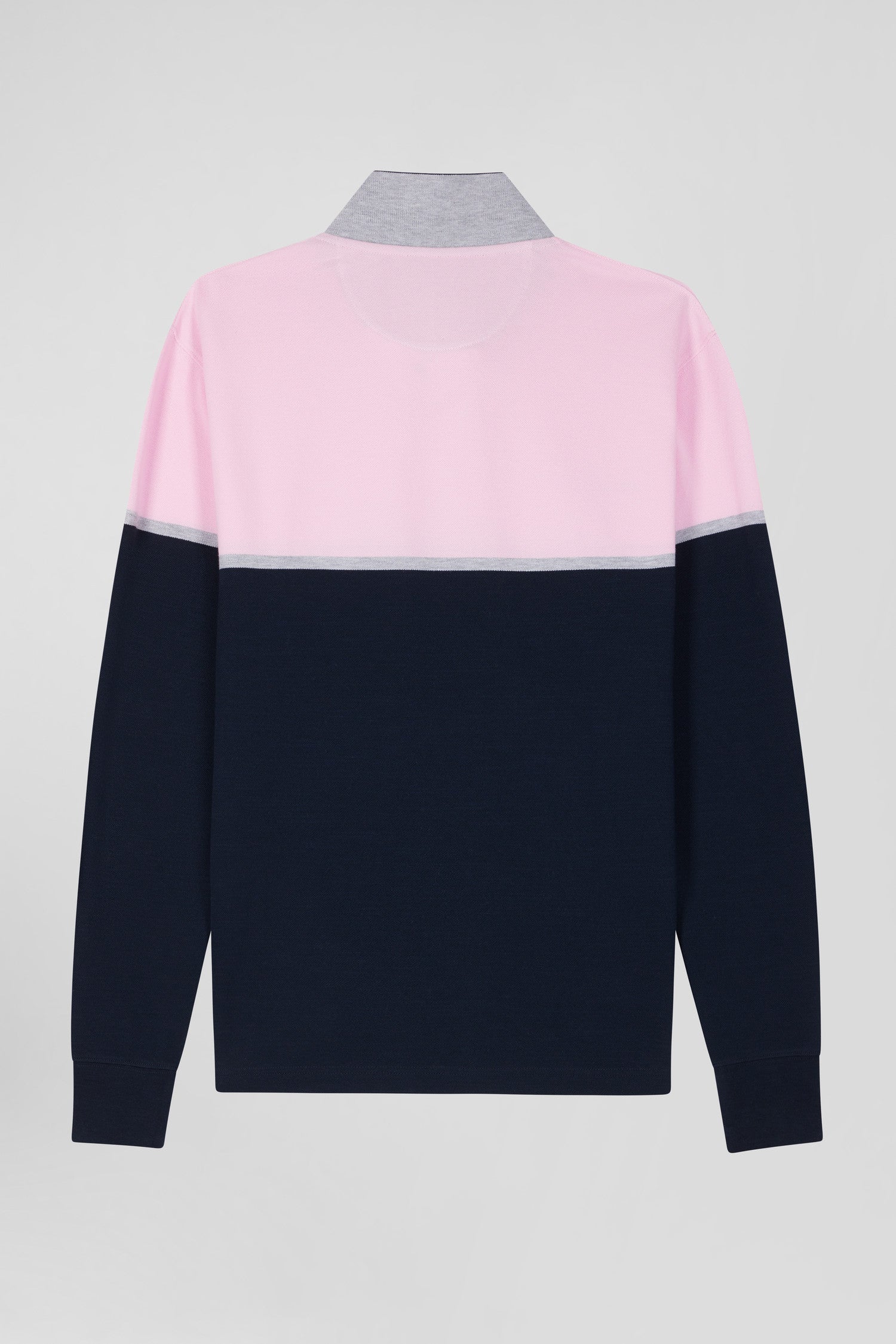 Regular navy blue bicolor long-sleeved cotton piqué polo shirt