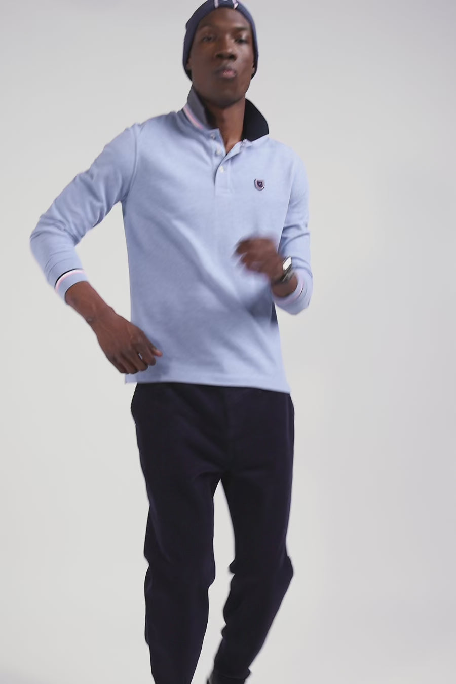 Regular sky blue long-sleeved cotton piqué polo shirt with rubber badge