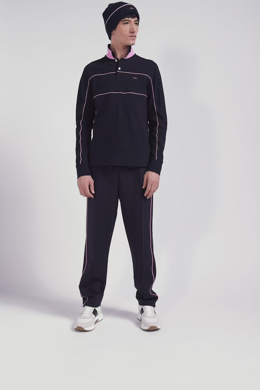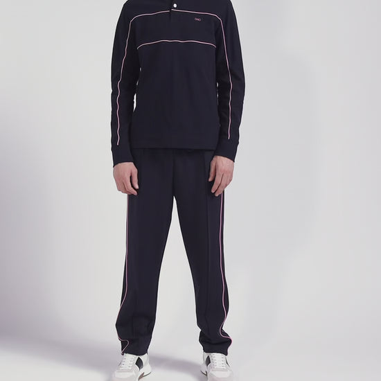Regular navy blue long-sleeved cotton piqué polo shirt with pink piping