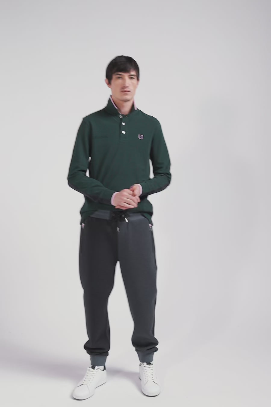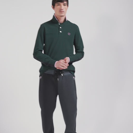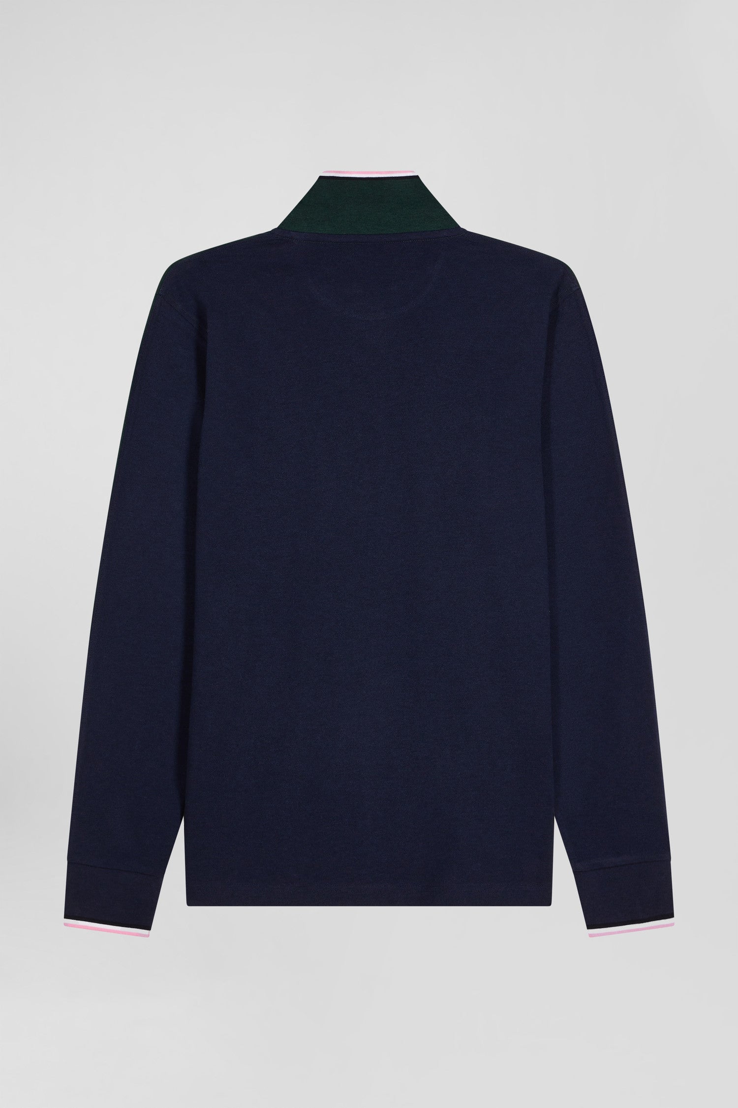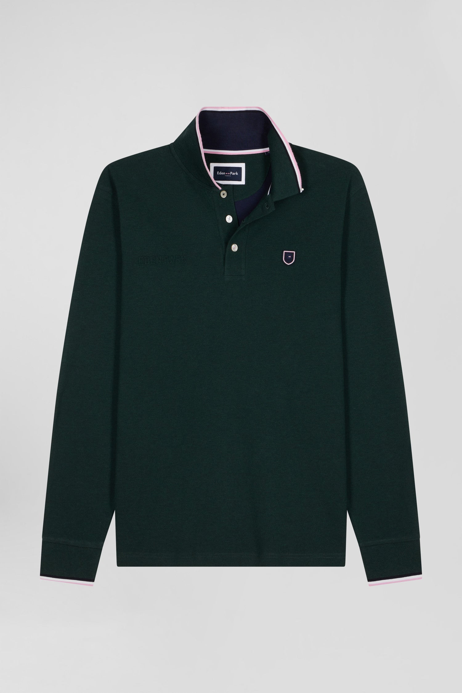 Regular green long-sleeved cotton piqué polo shirt with tricolor details