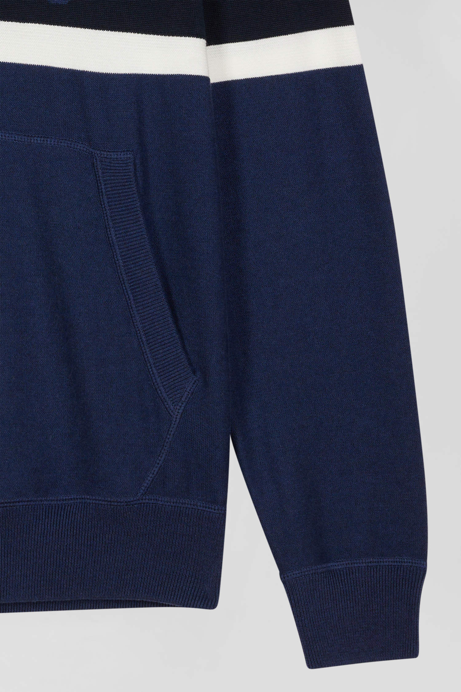 Work on your casual look with this hooded sweater, which skilfully combines contrasting knits for a dynamic visual effect. On the chest, a jacquard stripe highlights the EP 10 logo. Inspired by the sweatshirt with its ribbed trim, integrated hood, jersey body and reverse jersey half-moon, this sweater is the perfect blend of style and comfort.