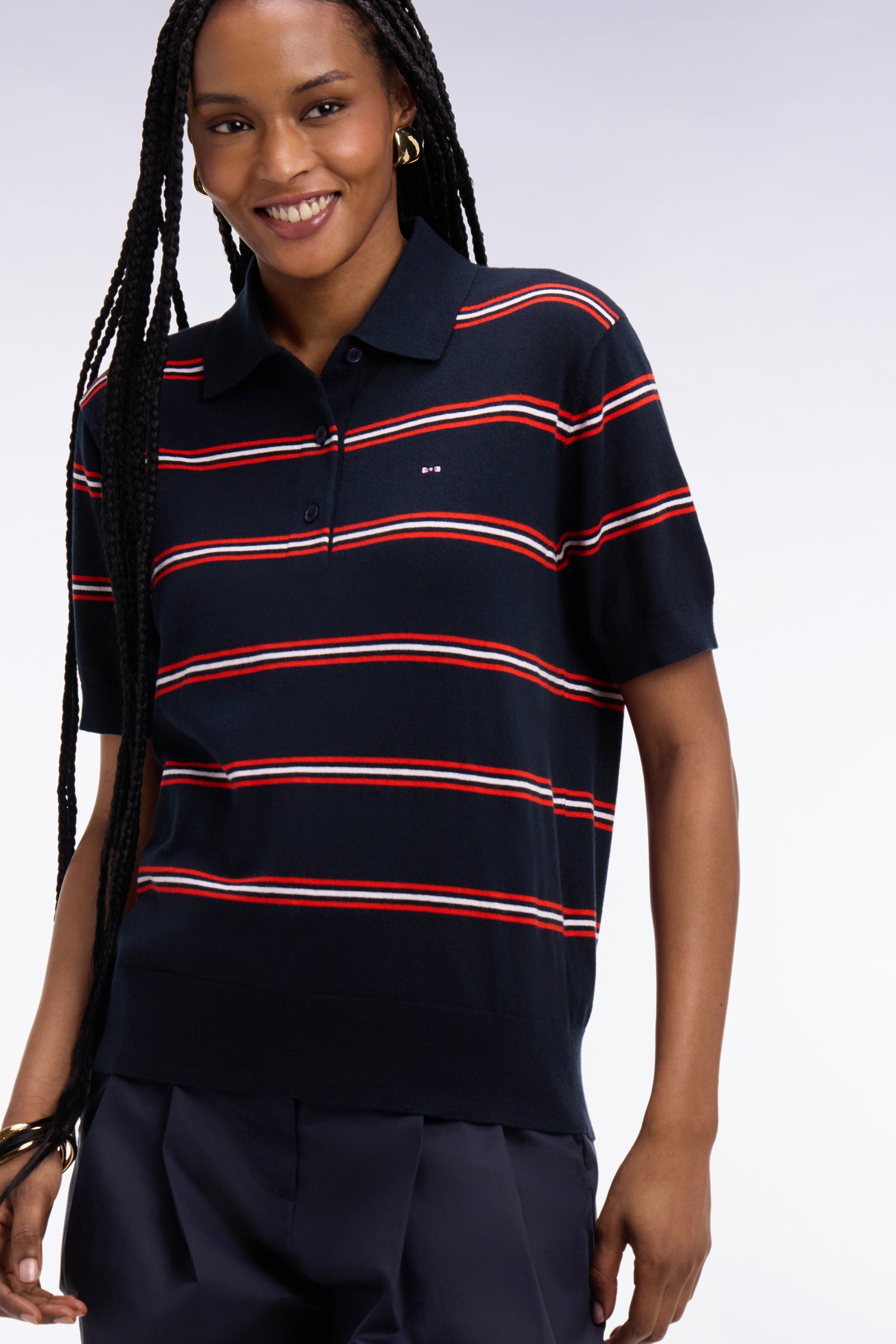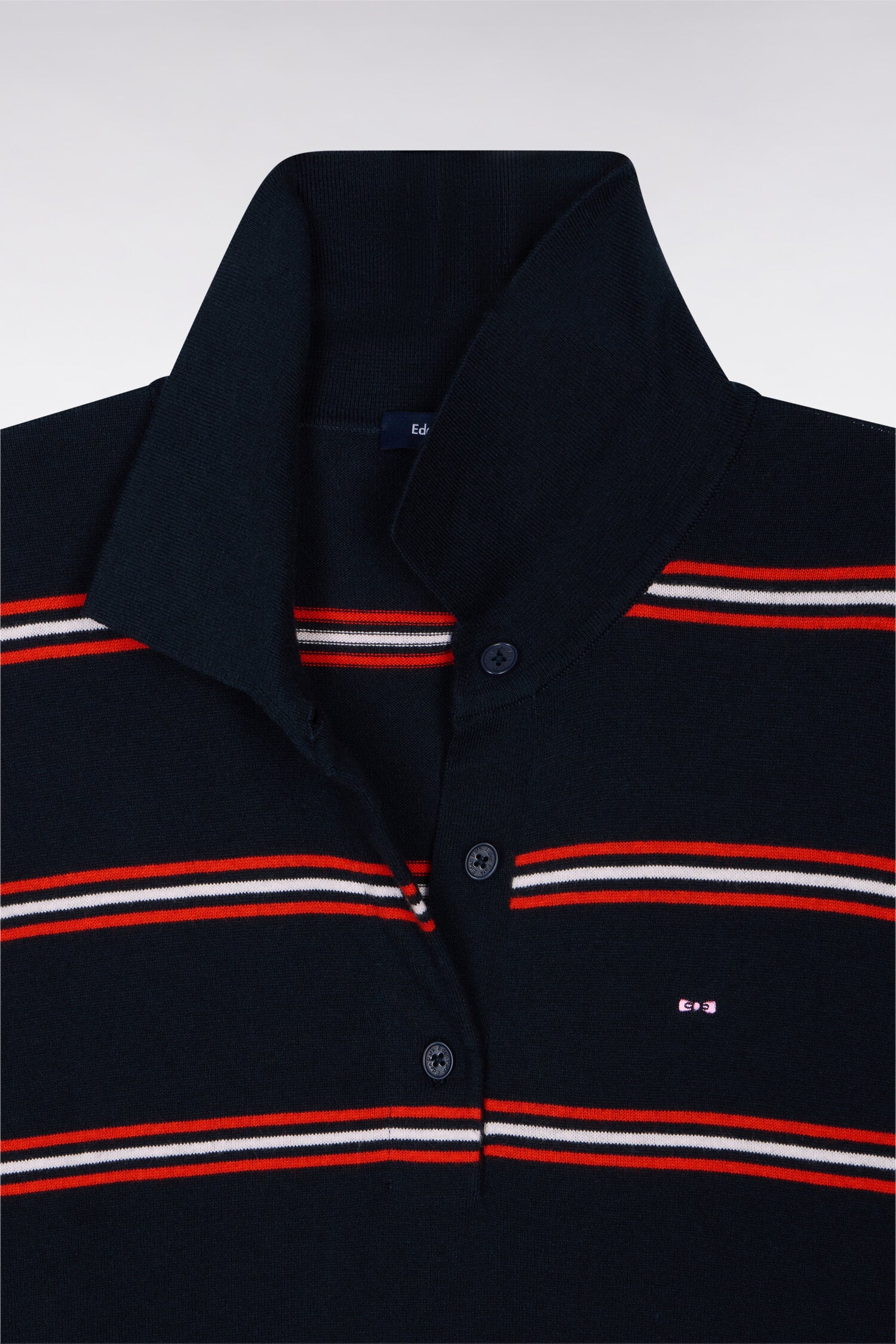 Ce pull polo à manches courtes, tricoté dans un confortable mélange de coton, polyamide et soie, offre douceur, brillance et un tomber impeccable. Ses rayures graphiques et sa maille régulière soulignent une allure chic décontractée. Ses finitions soignées valorisent le travail de la maille effectué par nos ateliers, tandis que ses boutons rugby siglés et le nœud papillon brodé apportent la touche signature Eden Park. Parfait avec un jean brut ou notre jupe en denim pour une silhouette estivale moderne.