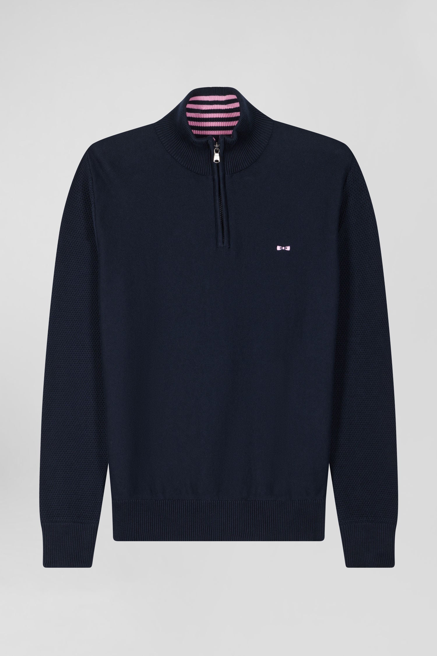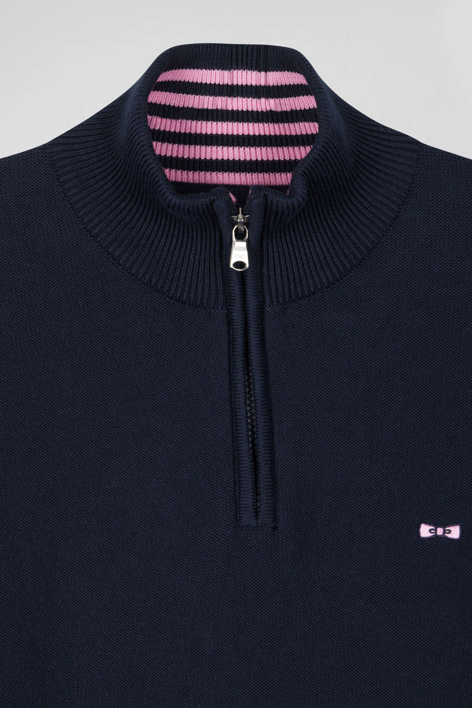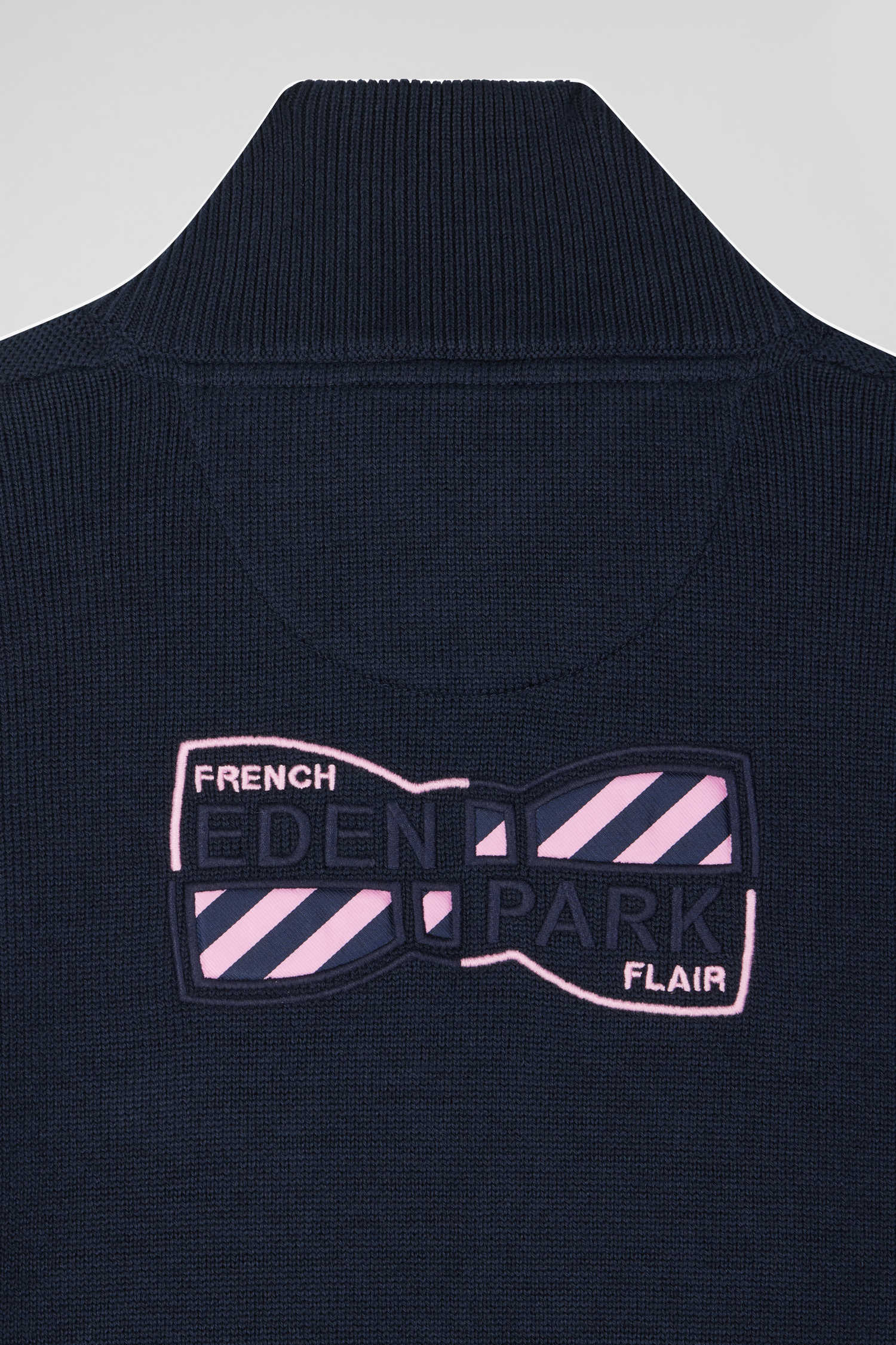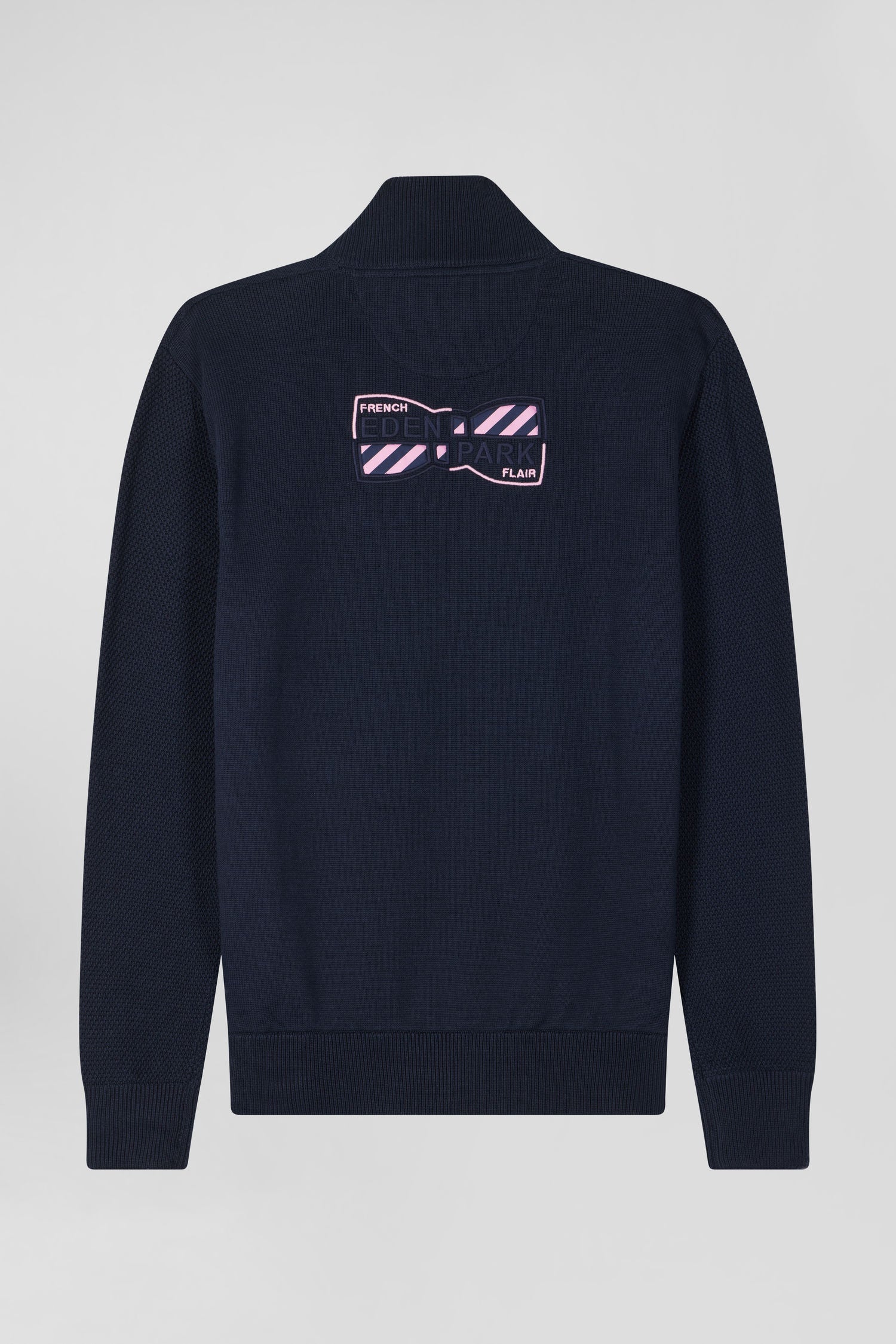This navy sweater with zipped trucker collar is distinguished by its knit play creating a relief effect. Its back embroidery in tie fabric revisits our emblematic bow tie, embodying the chic, quirky spirit of our House: the Eden Park French Flair.