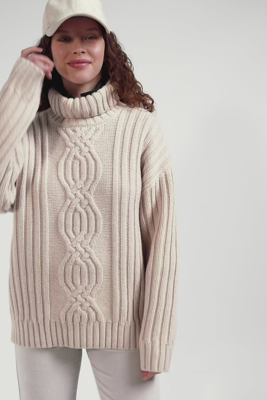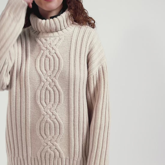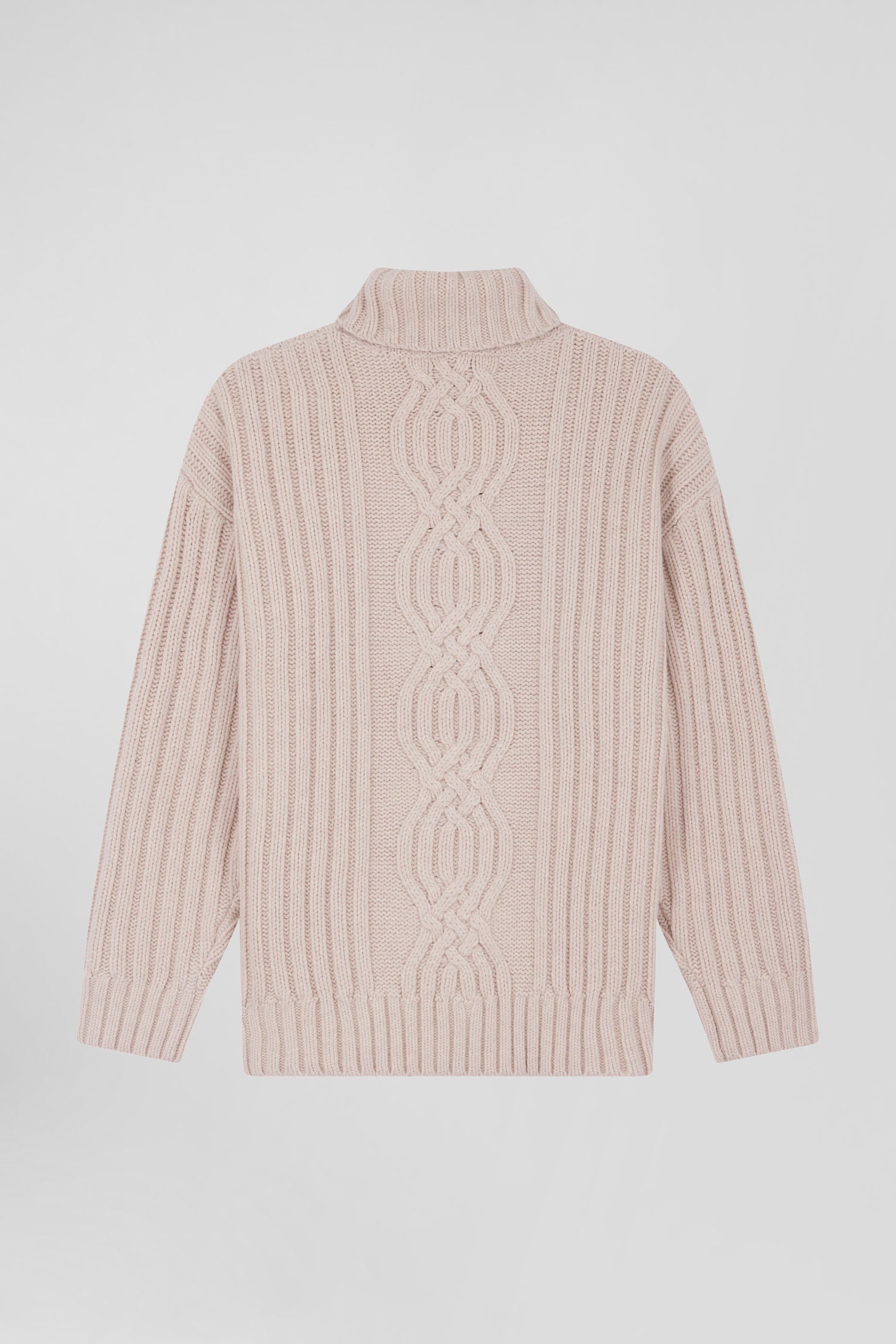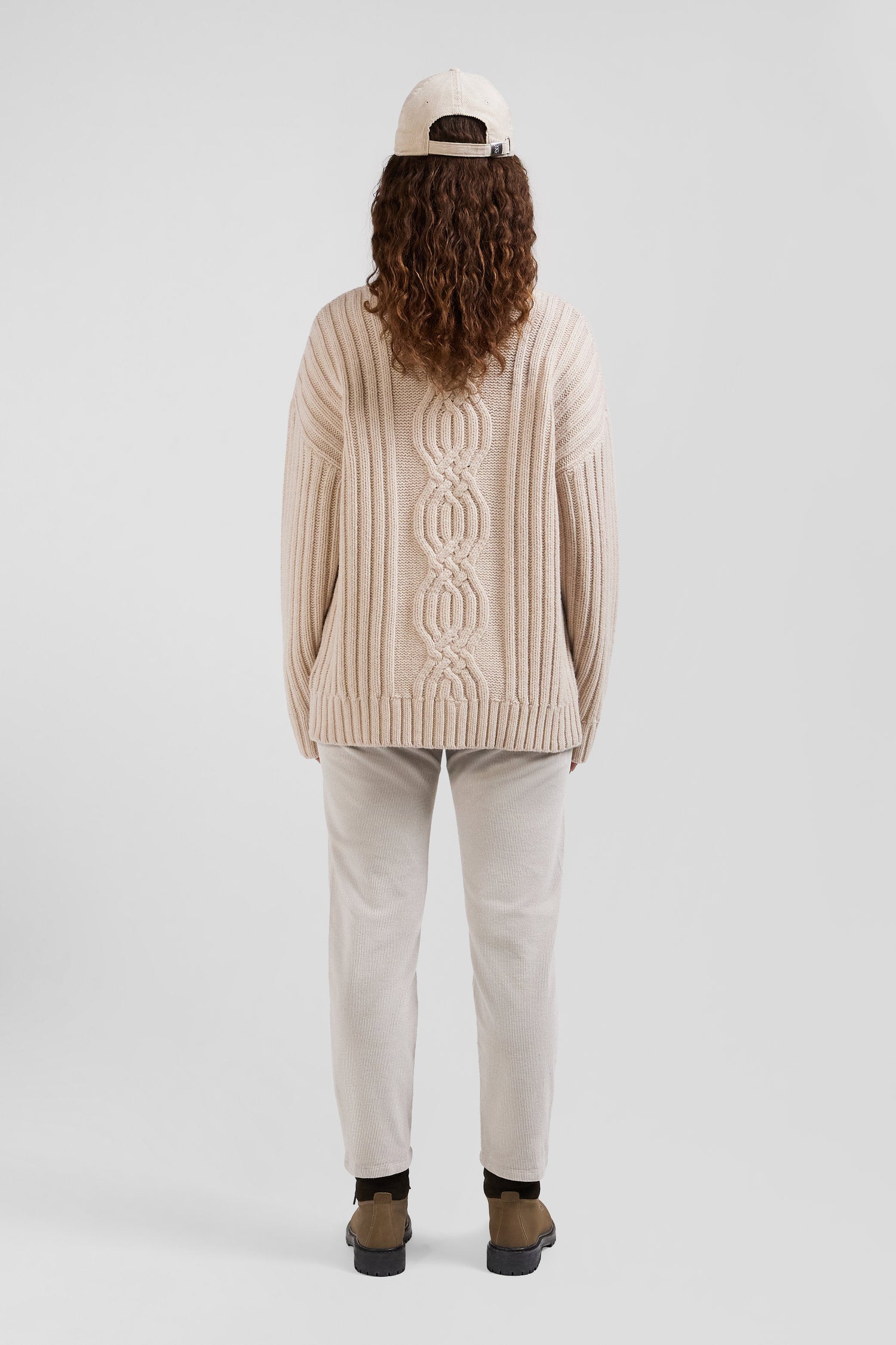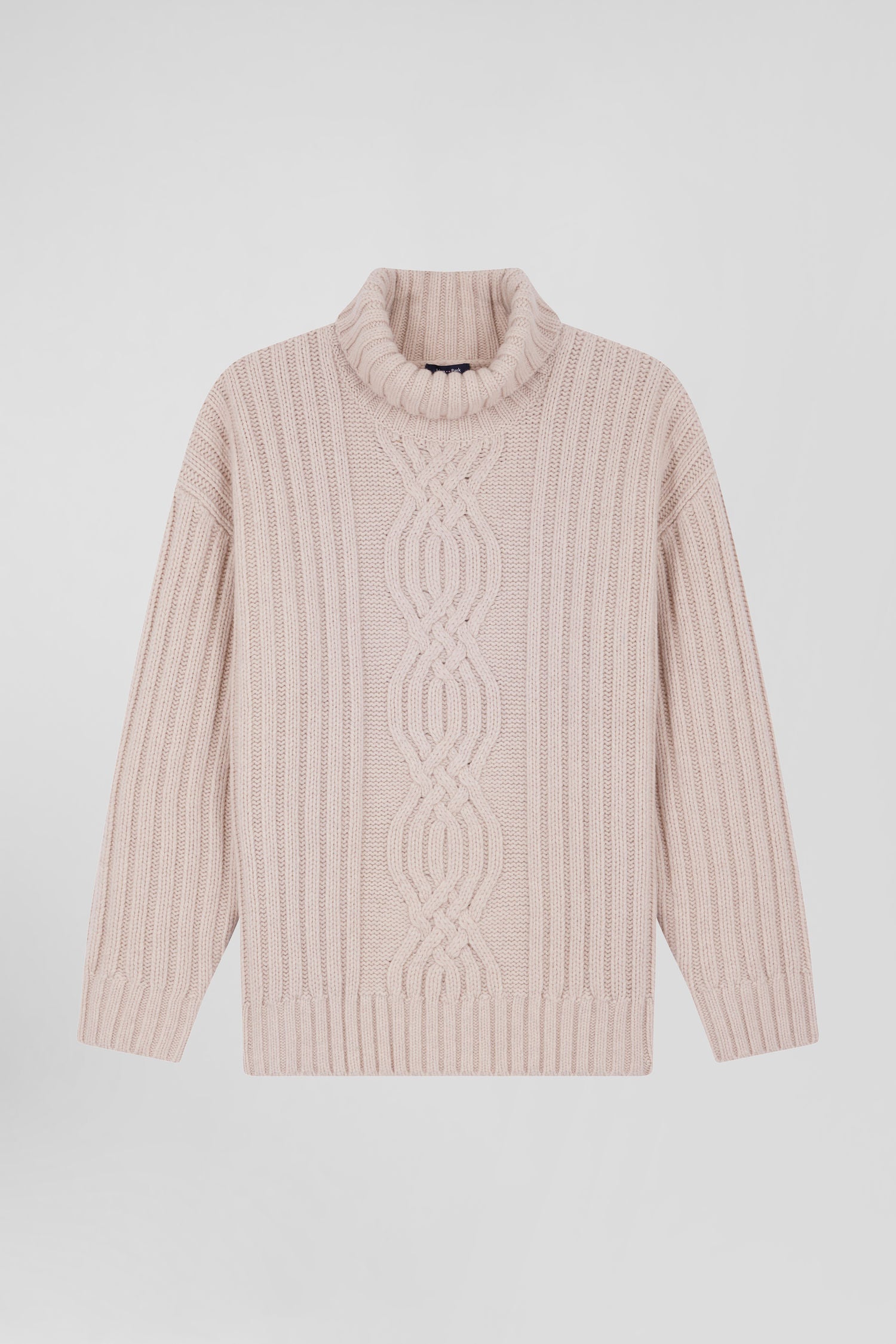 Made mainly from virgin wool, this women's chimney-neck sweater promises warmth and comfort for the autumn-winter season. Its careful knitting creates a raised bow effect, a subtle reminder of our emblem. Thanks to its Oversized cut, this ivory-colored winter sweater makes layering easy, while offering a trendy silhouette for a cozy, worked outfit structured by its knitted ribbing. Jeans or suit pants are a perfect match.