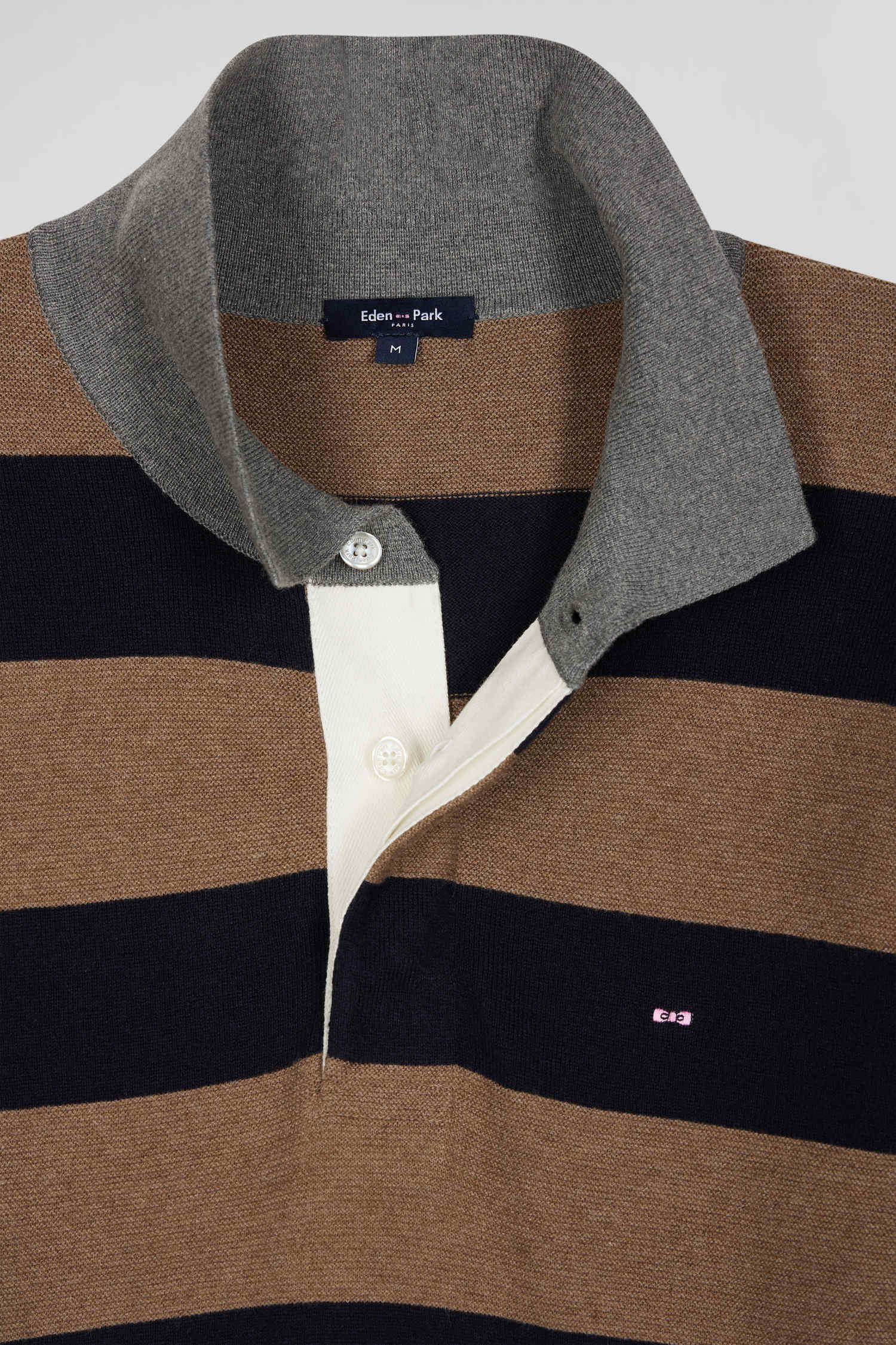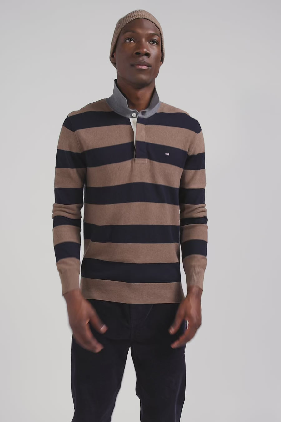 This hooped sweater is made from a soft blend of cotton and cashmere. With its typical rugby shirt collar and white ribbon-lined button placket, this men's sweater combines comfort and style. The contrasting stitch effect on the two-tone stripes adds a touch of originality, while the alternation of jersey and Ottoman stitch offers a varied and attractive texture. This winter sweater is perfect for a sophisticated look with a sporty twist.