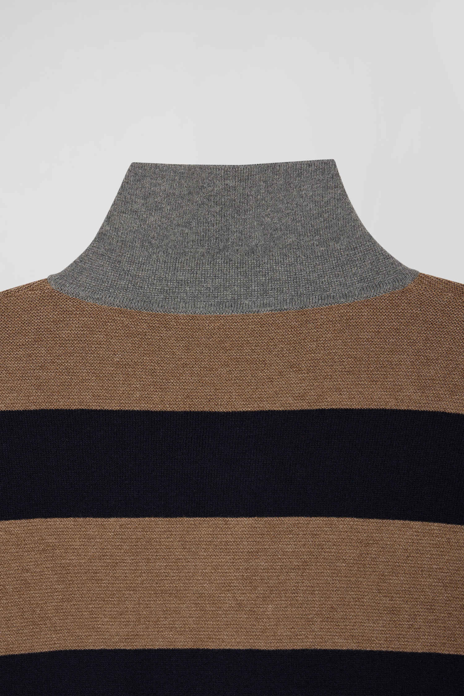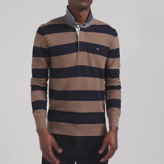 Regular brown striped cotton and cashmere jumper with rugby shirt collar