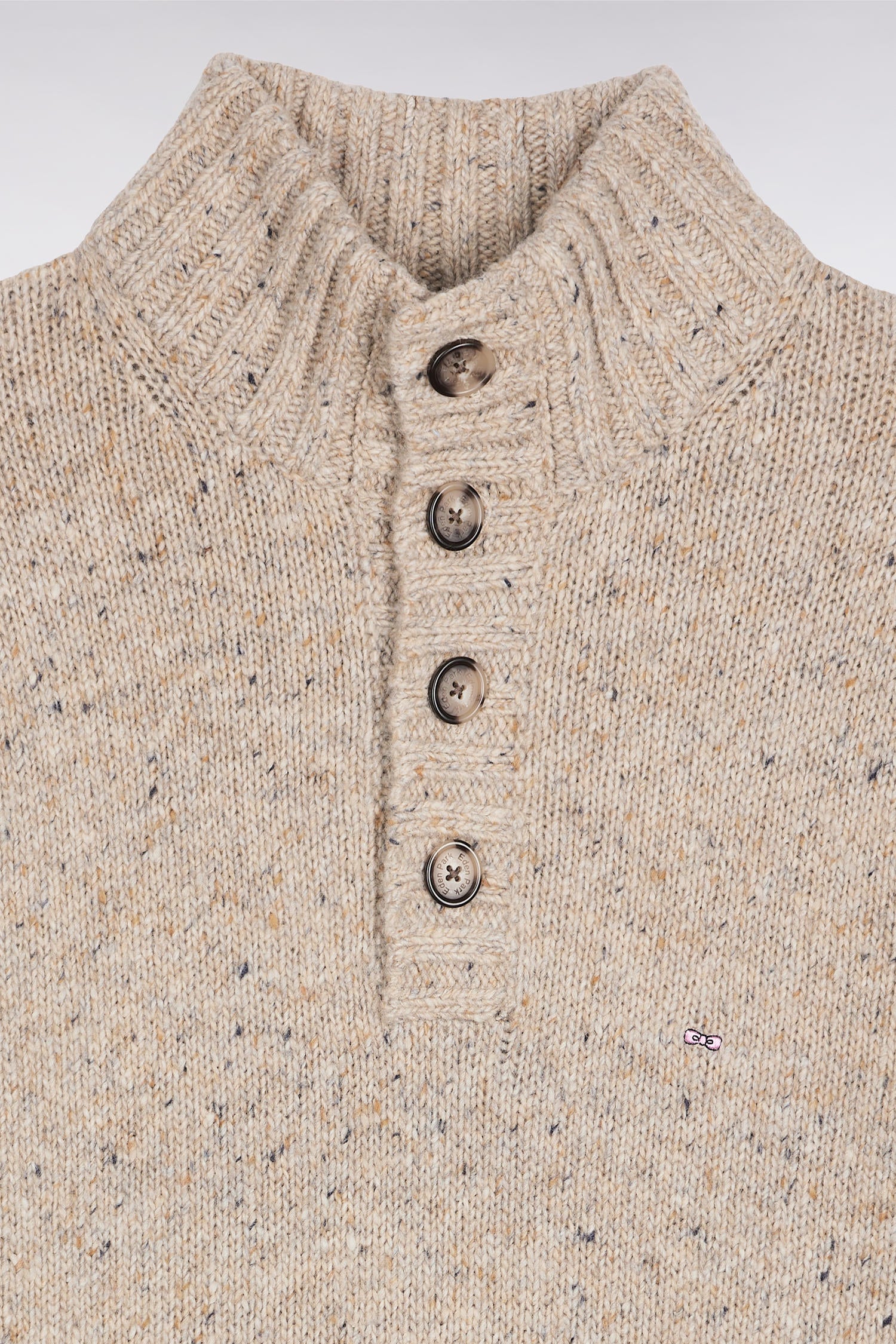A true ally for chilly days, this stand-up collar sweater features a thick knit, knitted from a blend of alpaca and virgin wool for a rich, authentic texture. This thick sweater combines warmth, softness and elegance. Featuring a four-button closure, ribbed collar and ribbed trims, it attests to the care we take in every detail, as well as in our selection of materials. The pink bow tie embroidered on the chest discreetly marks this timeless piece, available in beige or gray.