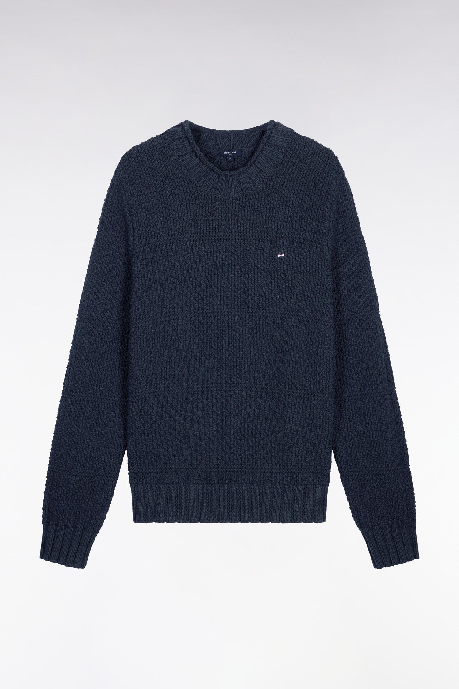 Ce pull à col montant en coton et lin mélangés séduit par son jeu de textures et son allure graphique en toute subtilité. L’association rythmée d’un point piqué espacé et d’un point twill en diagonale crée des rayures rugby ton sur ton, pour un effet de relief et un volume parfaitement maîtrisés. Sa finition roulottée au col et ses bords côtes soulignent un esprit à la fois authentique et raffiné, rehaussé de l’emblématique nœud papillon Eden Park brodé sur la poitrine. Un modèle idéal pour apporter de l'élégance à vos week-ends et moments de détente sans sacrifier au confort.