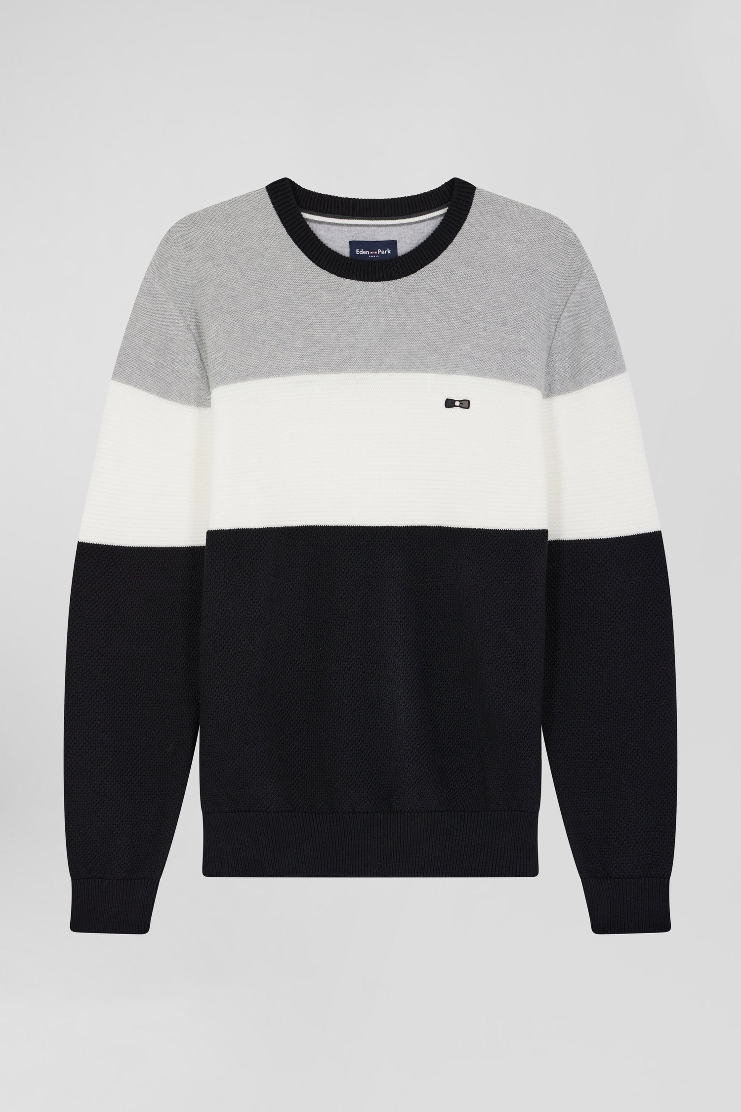 With its contrasting stitch effects achieved through alternating knits, this men's round-neck sweater adds a graphic touch to the silhouette. The cut and sewn assembly inspired by our jerseys lends a trompe-l'oeil effect to this deceptively classic tricolored sweater.