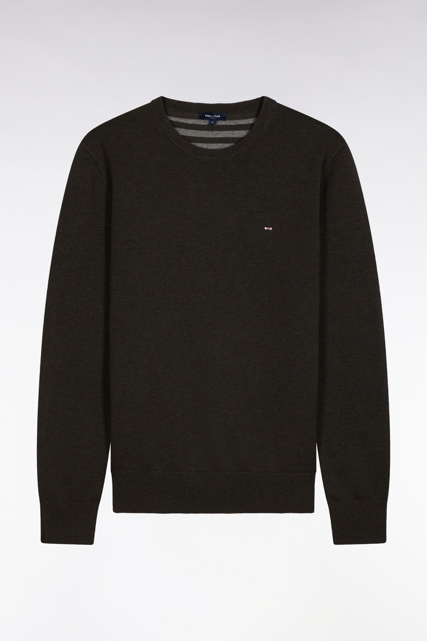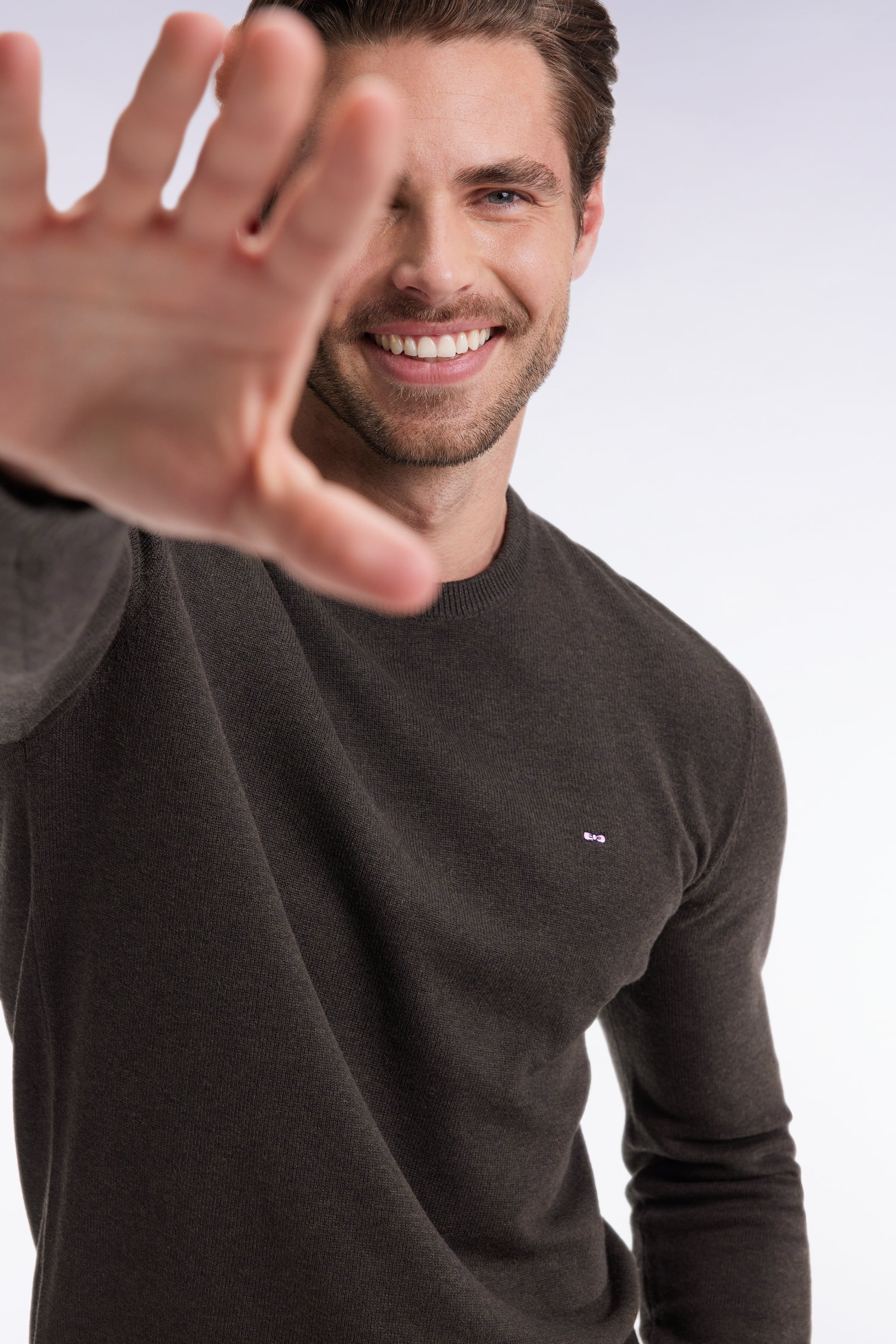 This round-neck sweater plays the timeless card with its straight cut and wool/cotton blend knit. A bow-tie embroidery on the chest and a rugby-striped half-moon inside discreetly mark its place in the Eden Park wardrobe. Easy to match with a shirt or T-shirt, this sweater comes in a rich palette of colors for all your seasonal silhouettes.