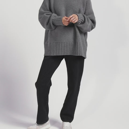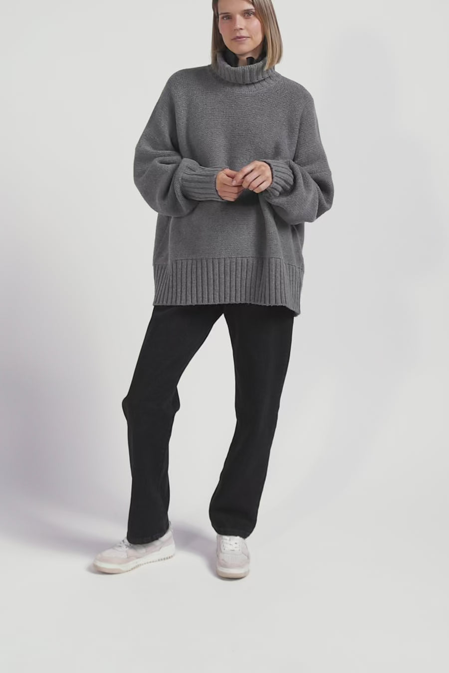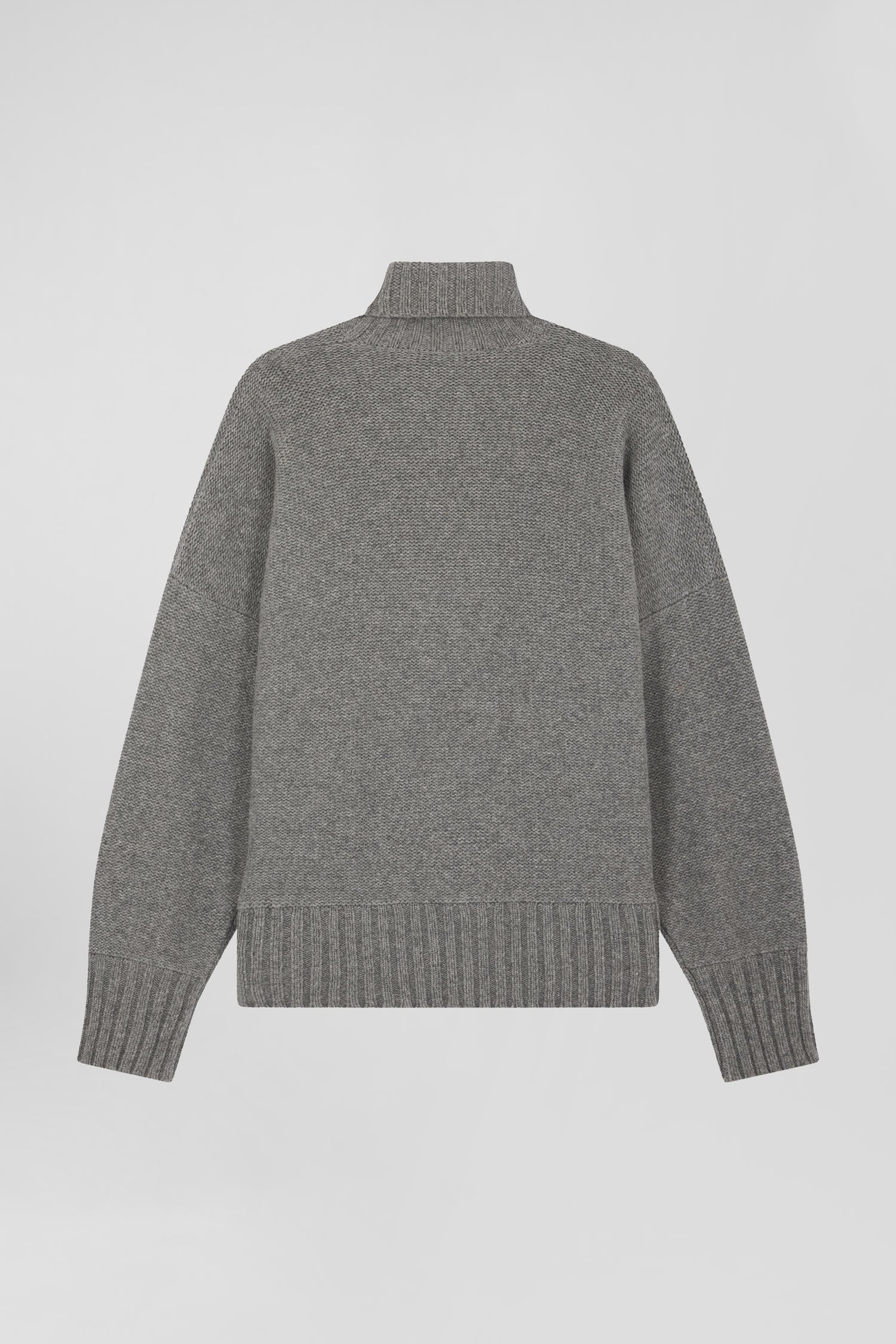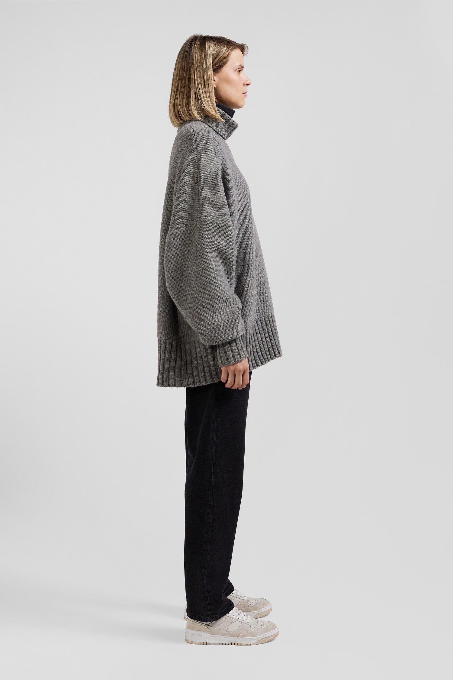 Our turtleneck sweater, knitted in reverse stockinette stitch from a blend of virgin wool and recycled polyamide, guarantees warmth and durability. Its wide sleeves tightened at the cuffs by knitted ribbing add a touch of contemporary sophistication to this timeless piece. Perfect for winter days, this feminine sweater in navy or grey in a trendy oversized cut will become a wardrobe staple worn with raw denim jeans or suit pants.