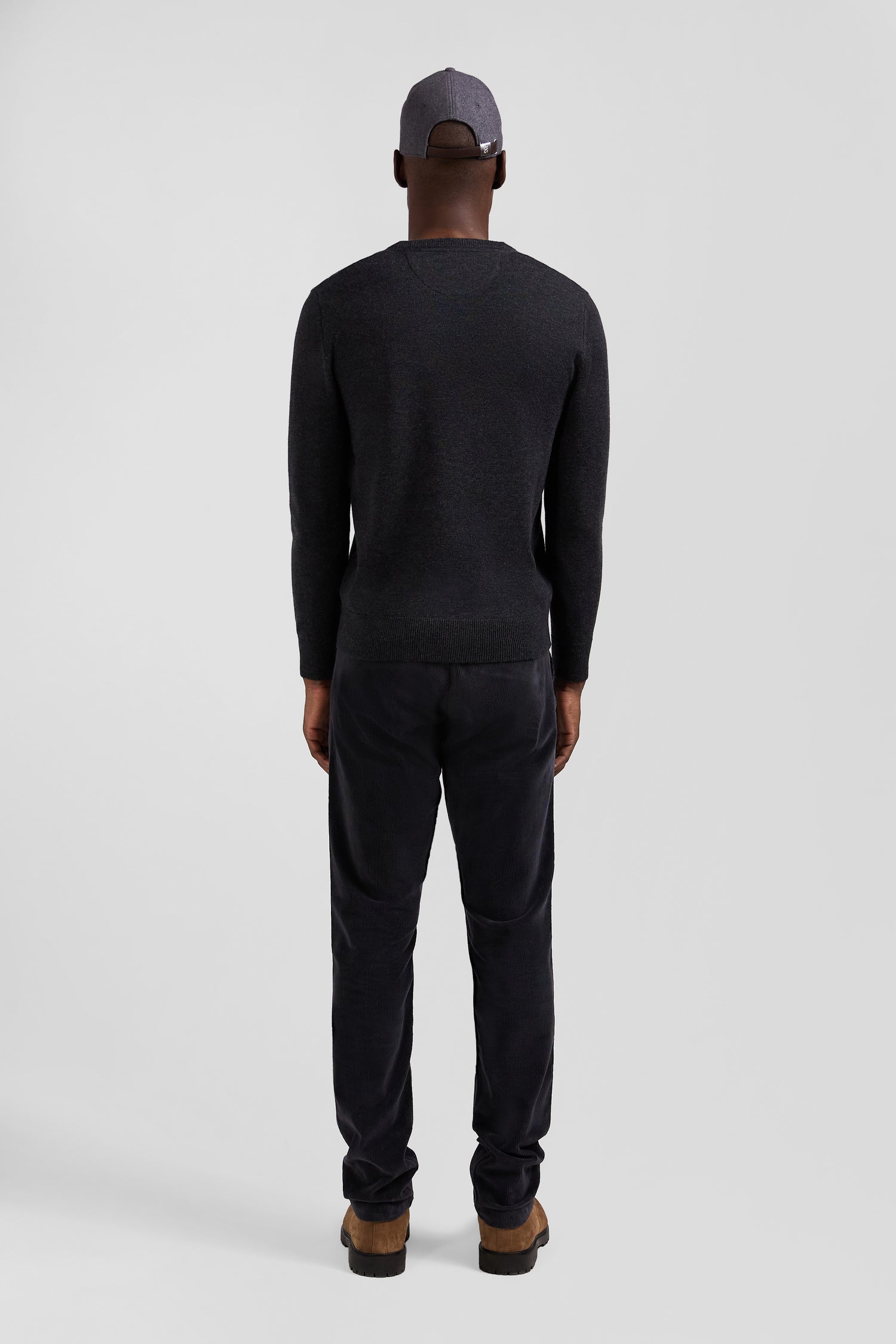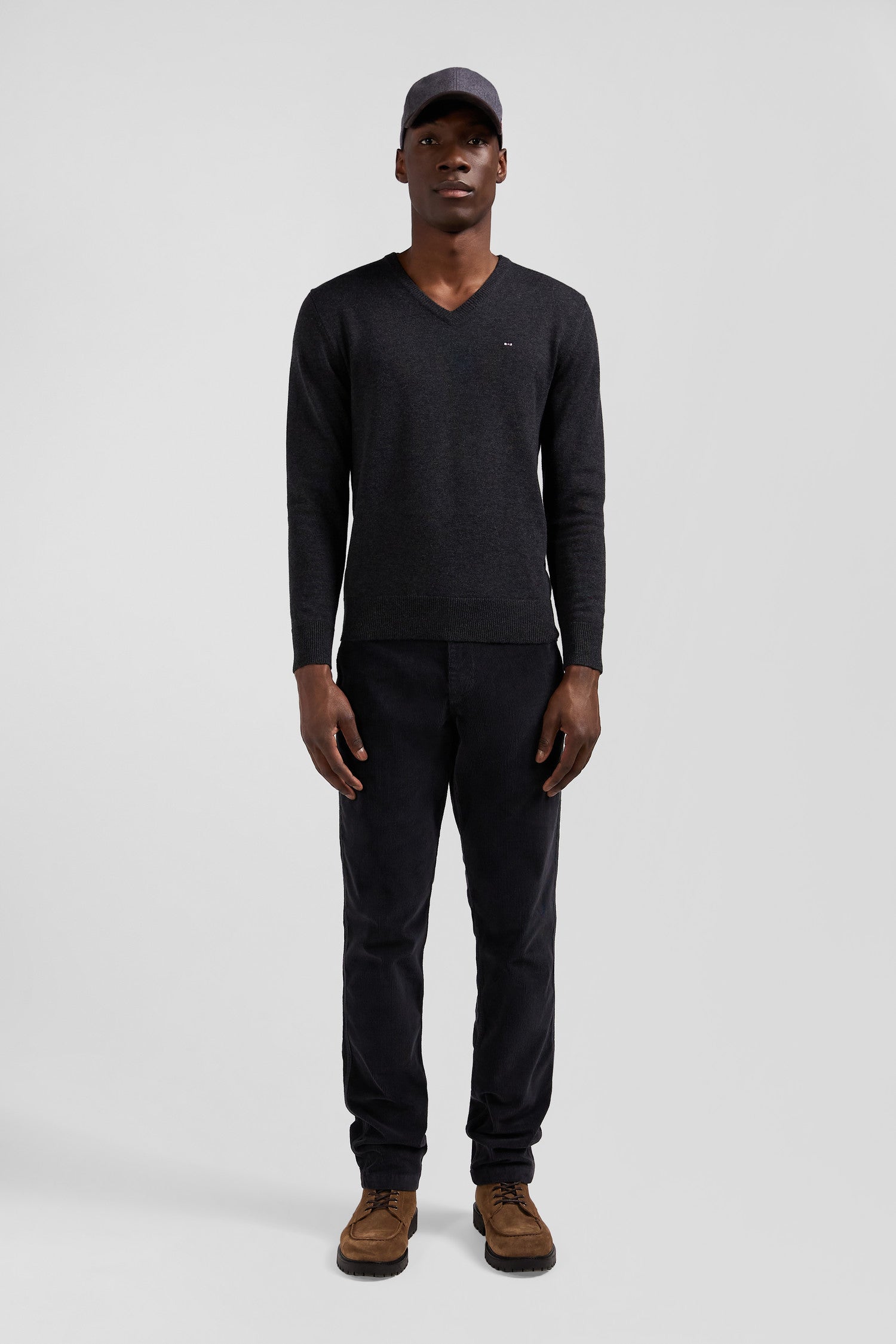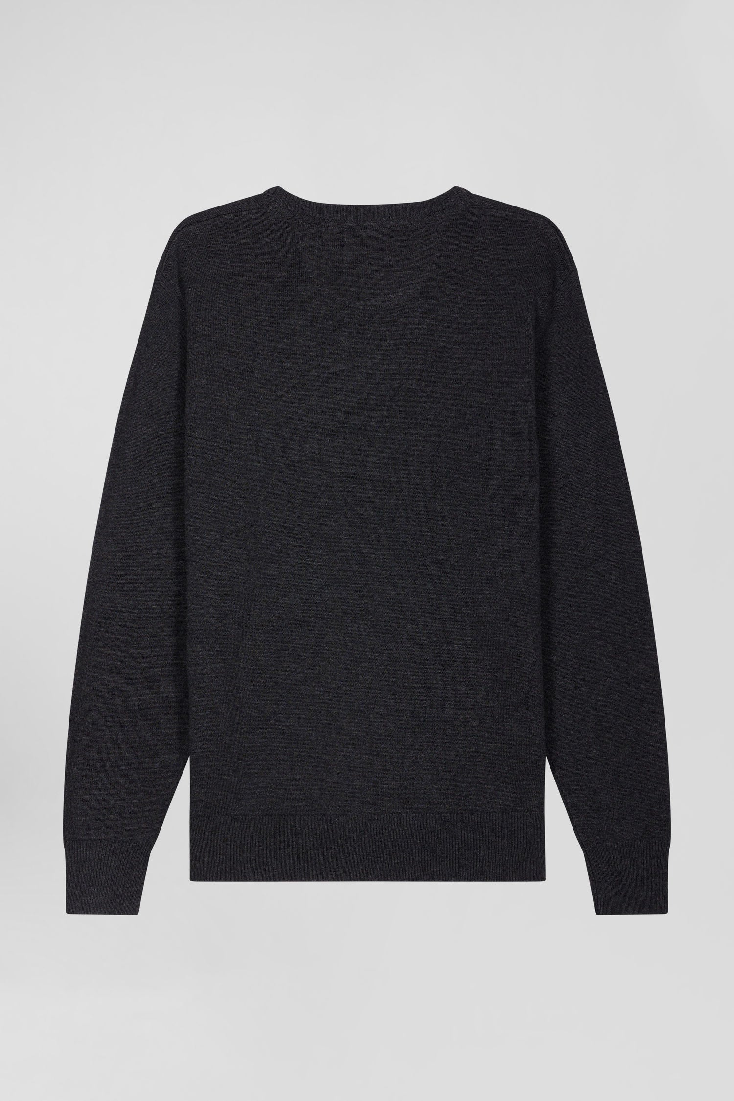 Regular anthracite grey wool and cotton V-neck jumper with striped details